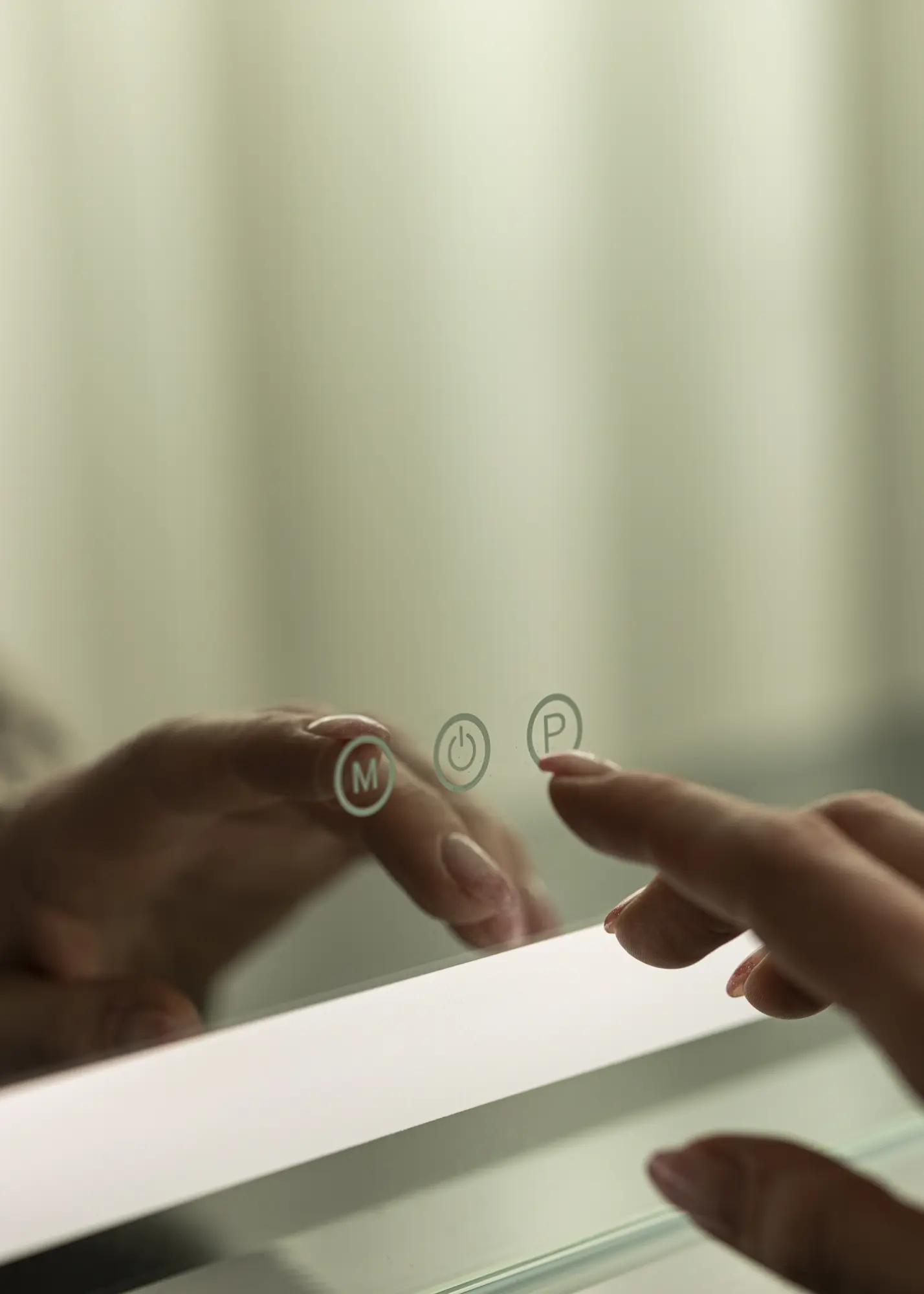 Peilin alareunassa on kolme kosketusnäppäintä – yksi, josta valaistus sytytetään ja sammutetaan ja kaksi nappia, joista säädetään valoasetuksia. “M”-nappi säätää valon värilämpötilaa 3000K-6000K:n välillä ja “P”-nappi himmentää valaistusta. Voit toisin sanoen säätää valaistuksen täydelliseksi jokaiseen tilanteeseen.