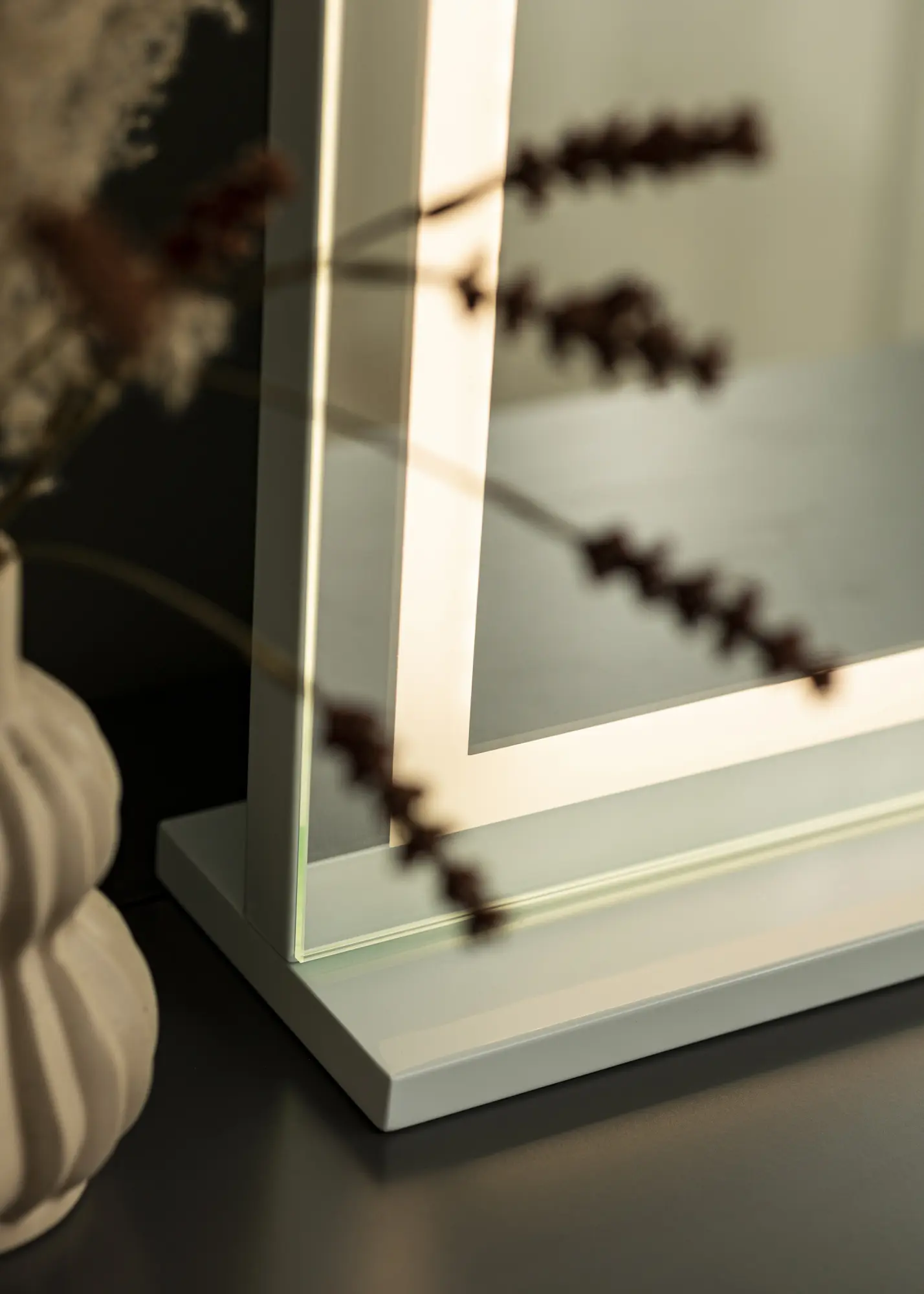 Tämä meikkipeili on täydellinen yhdistelmä minimalismia ja trendikkyyttä. Peilissä on klassinen muoto ja moderni LED-valo, joka kehystää 80x60 cm kokoista peilipintaa. Peilissä on jalusta, jonka voi myös irrottaa, joten voit valita haluatko laittaa peilin pystyyn pöydän päälle vai seinälle roikkumaan. Peili asennetaan pystyasentoon.