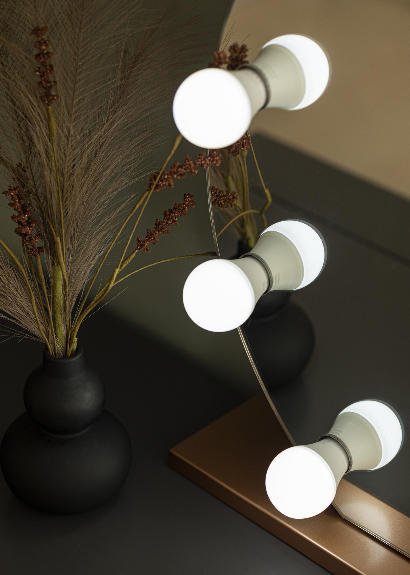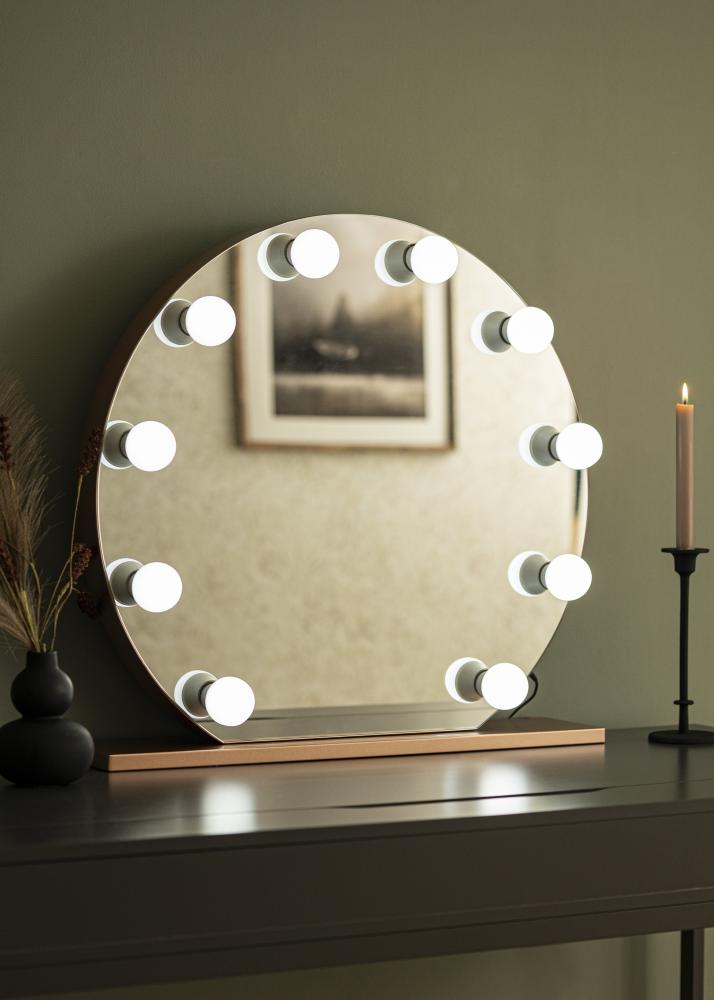 Tämä ruusukultainen meikkipeili saa huoneesi hehkumaan. Peilin 10 hehkulamppua, jotka kehystävät peiliä, hohtavat kylmän valkoista valoa. Himmennysominaisuuden ansiosta voit säätää valonvoimakkuutta mielesi mukaan. Sinun tarvitsee vain vääntää peilin päädyssä olevaa nappia.