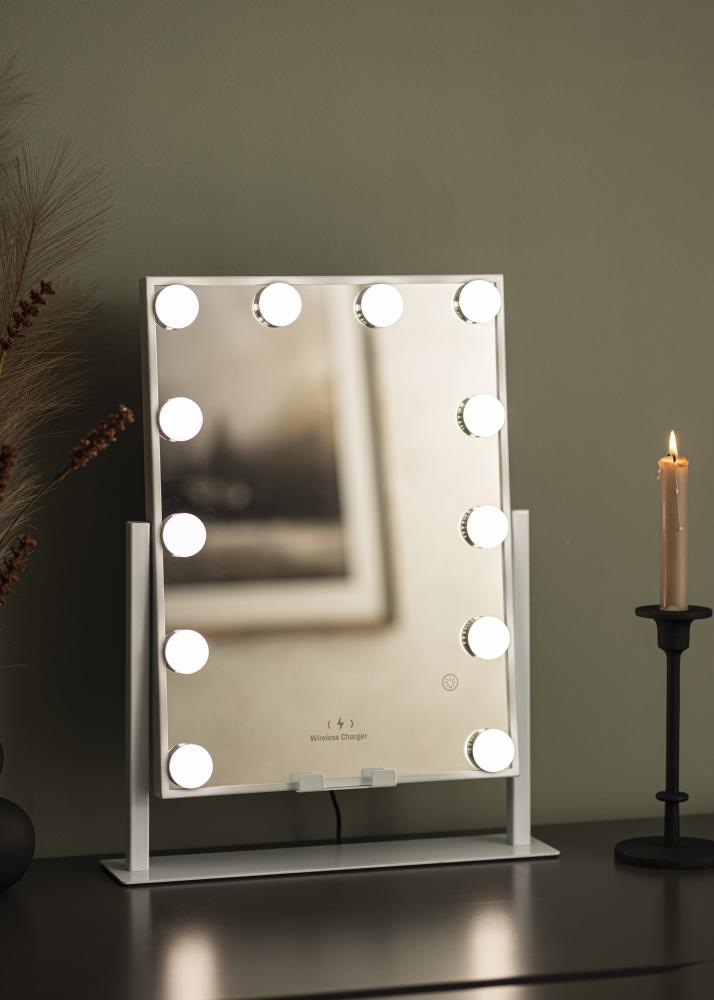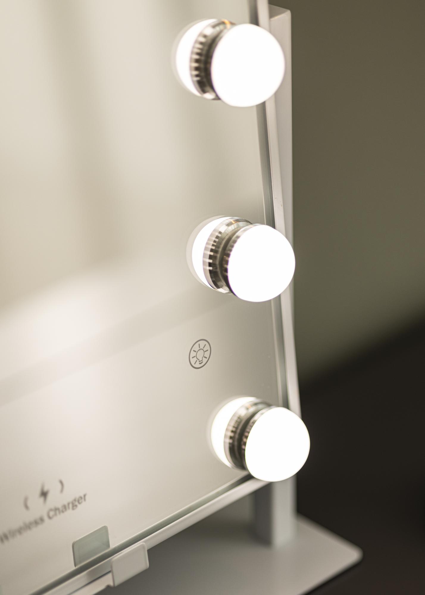 Tämä on kaunis meikkipeili, jossa on erityisen ylellinen yksityiskohta – voit nimittäin ladata sillä puhelimesi langattomasti! Kun lamppu palaa, voit sijoittaa laitteesi sille tarkoitetulle paikalle peilissä, ja ladata puhelimen 5V2A:lla (10W). Todella käytännöllistä hektisinä aamuina, kun haluat puhelimen olevan käden ulottuvilla, kun valmistaudut päivää varten peilin edessä. Lataustoiminto toimii kaikissa älypuhelinmalleissa, jotka tukevat langatonta latausta.