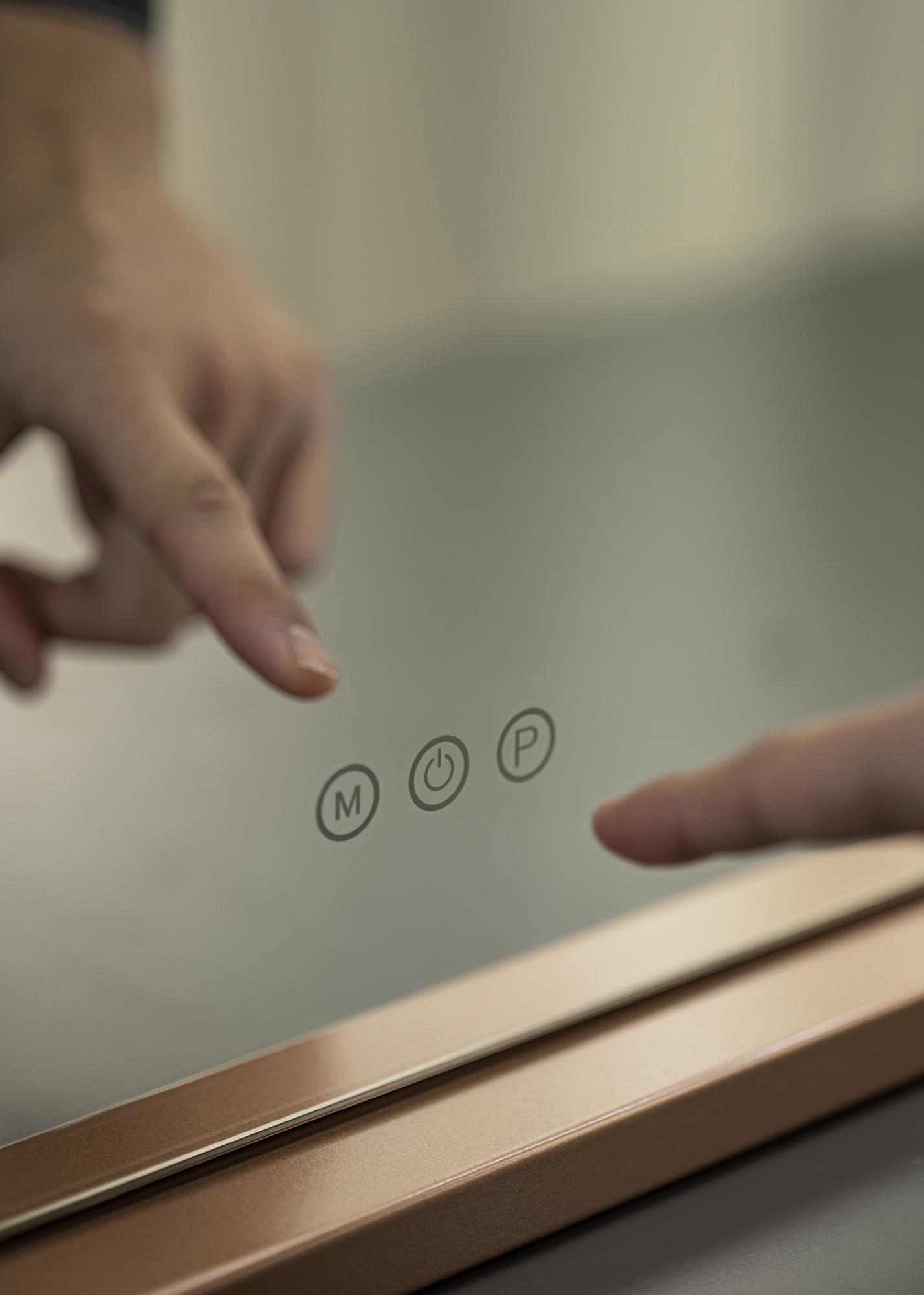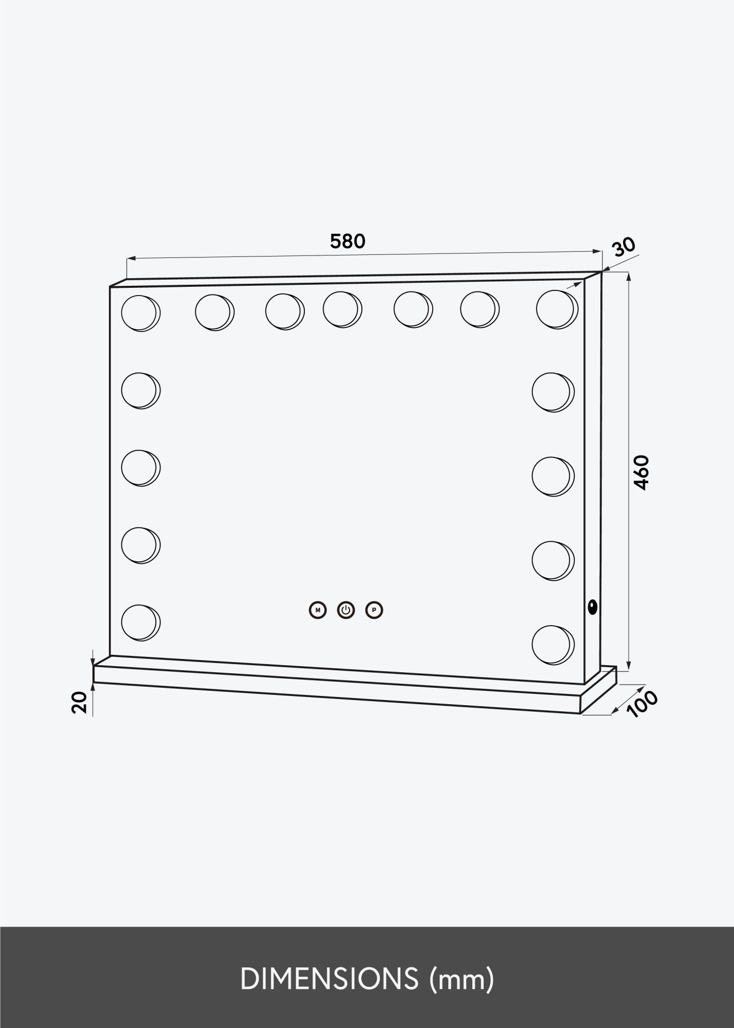 Meikkipeilin peilipinta on kooltaan 58x46 cm ja peilipinnan alareunassa on kolme kosketusnäppäintä. Yksi nappi valaistuksen sytyttämistä ja sammuttamista varten, ja kaksi nappia valoasetusten säätämiseksi. “M”-nappia painamalla voit säätää valon värilämpötilaa ja “P”-napista voit himmentää valaistusta toivomaasi valonvoimakkuuteen. Peili liitetään pistorasiaan.
