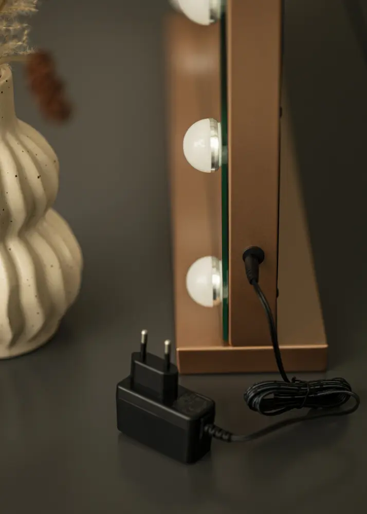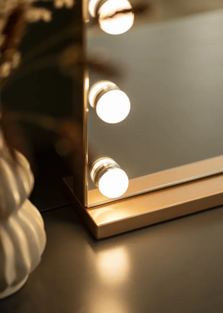 Tämä meikkipeili on trendikäs sisustusyksityiskohta eteisessä ja olohuoneessa – tai jos laitat sen meikkipöydän päälle, saat aikaan ylellisen meikkinurkkauksen. Peilillä on Hollywoodin inspiroima muotoilu isojen sisäänrakennettujen LED-lamppujen ja ruusukullansävyisen jalustan kanssa. Jalusta on helppo irrottaa sekä kiinnittää takaisin, joten voit valita haluatko ripustaa peilin seinälle vai laittaa sen seisomaan.
