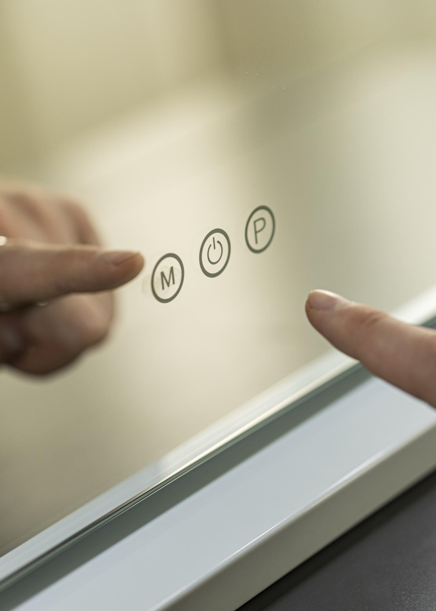 Tällä peilillä luot kotiisi ylellisen meikkinurkkauksen. Peilissä on tyylipuhdas suorakulmainen muoto ja sisäänrakennettu valaistus, joka valaisee tasaisesti, kun peilaat itseäsi. Kauniin muotoilunsa ansiosta, peili toimii myös trendikkäänä sisustusyksityiskohtana olohuoneessa tai eteisessä taustavalaistuksena. Peilin himmennettävissä oleva valaistus koostuu 15 LED-lampusta, jotka kehystävät 58x46 cm:n kokoista peilipintaa. Valoa himmennetään peilin etupuolella olevien kosketusnäppäimien avulla. Kosketusnäppäimet on merkitty kirjaimilla – ”P” valonvoimakkuuden säätämiseksi ja ”M” värilämpötilan säätämiseksi.