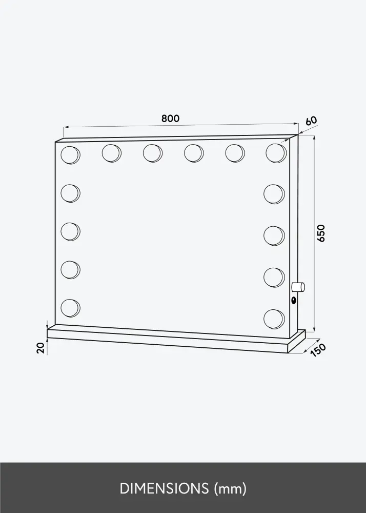Tällä meikkipeilillä loihdit meikkinurkkauksestasi todella ylellisen. Peilin muotoilua on inspiroinut Hollywoodin glamour. Peilissä on tyylikäs musta väri ja 14 E27-kantaista hehkulamppua, jotka ympäröivät 80x65 cm kokoista peilipintaa. Kylmän valkoista valoa loistavat lamput sopivat täydellisesti uuteen päivään valmistautumiseen. Jotta valo olisi juuri täydellinen joka tilanteeseen, voit säätää valaistusta peilin päädyssä olevan kätevän vääntönupin avulla.