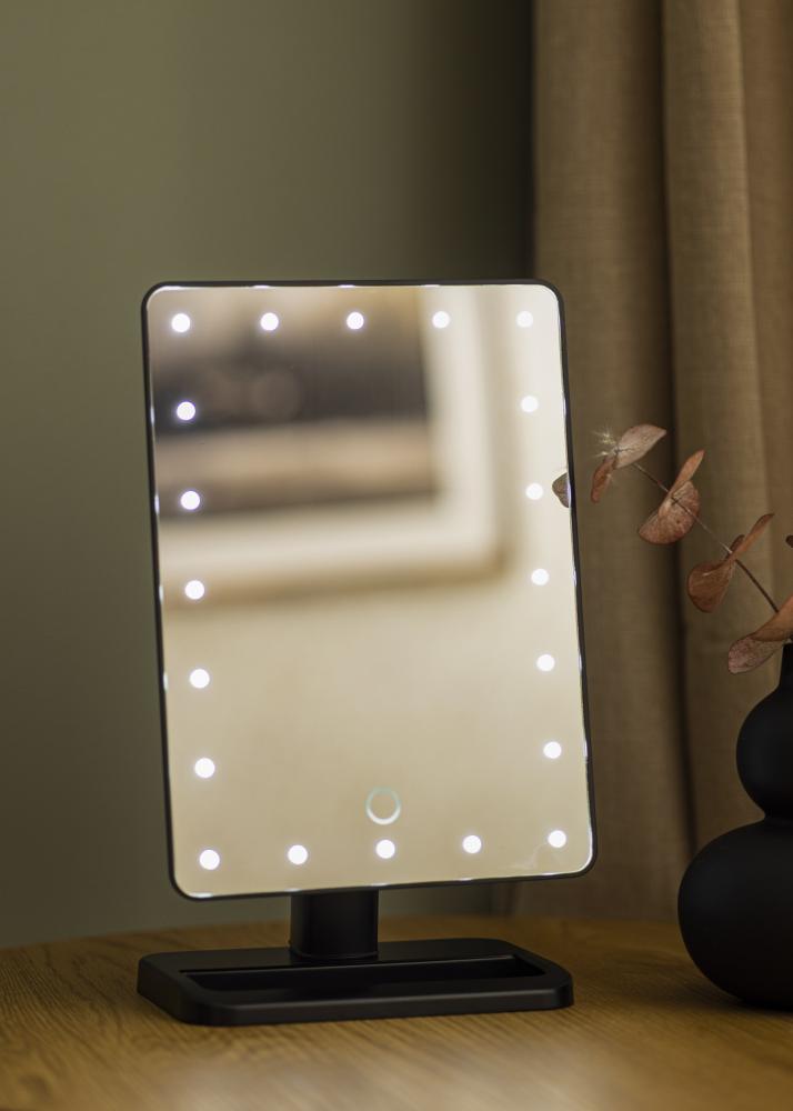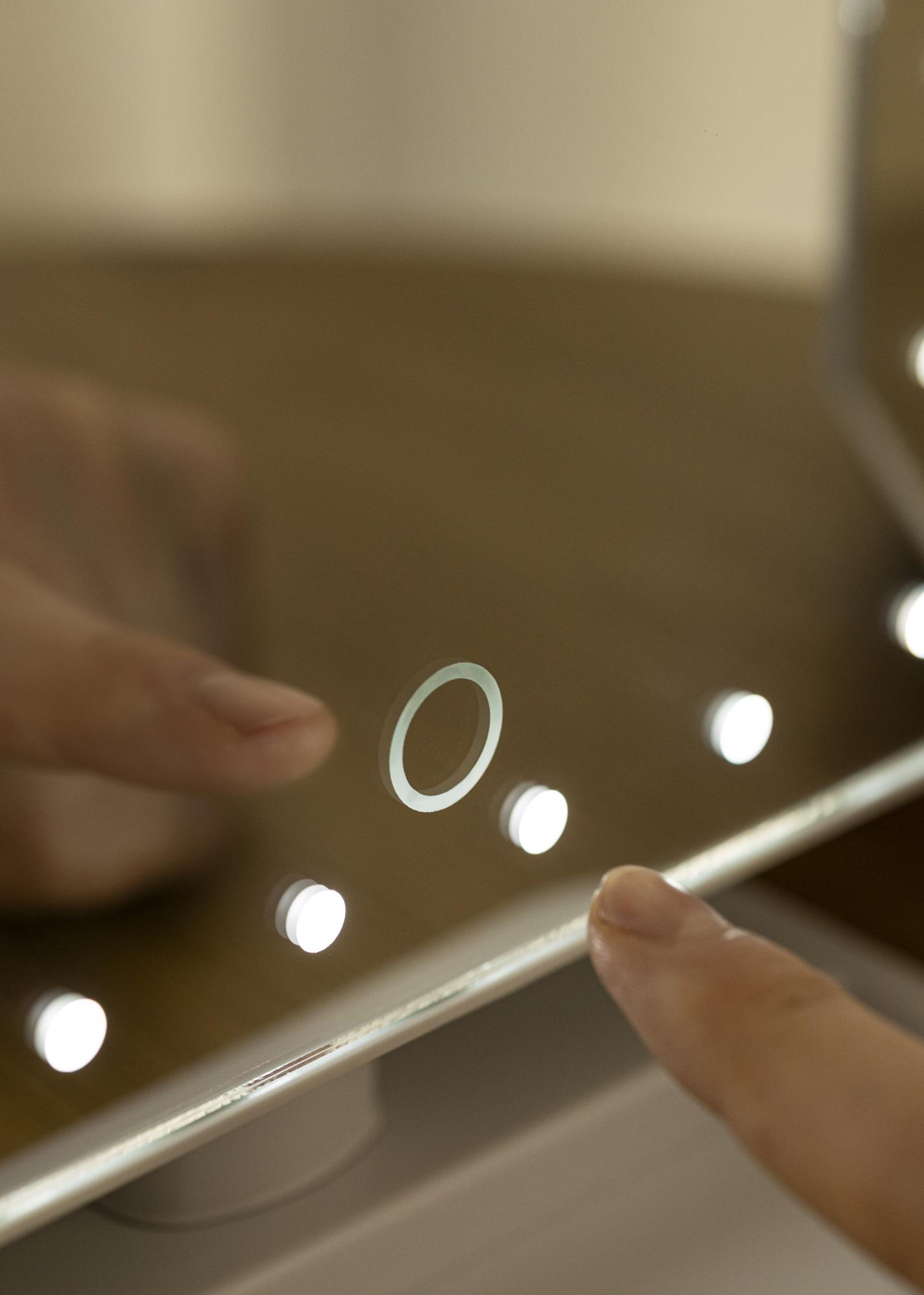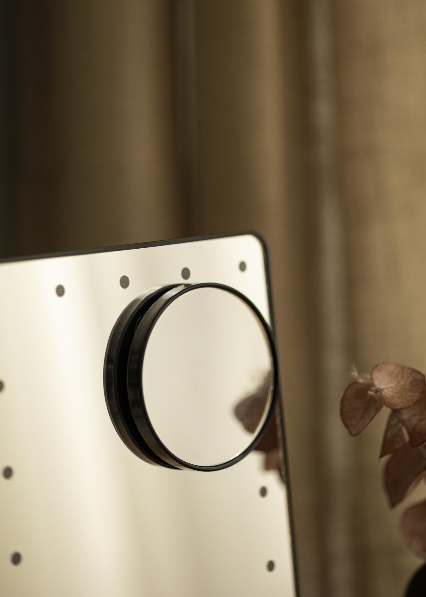 Peilissä on älykäs muotoilu himmennettävällä LED-valolla, joka valaisee kylmän valkoista valoa. Valo syttyy ja sammuu peilin takapuolella olevasta napista. Jotta voisit peilata itseäsi kunnolla, voi tämän meikkipeilin asentoa kiertää ja vääntää oman maun mukaan. Mukana tulee pienempi peili, jossa on sekä 2-kertaisesti että 3-kertaisesti suurentava pinta, ja jota voi käyttää joko erikseen tai suurempaan meikkipeiliin kiinnitettynä. Peili toimii sisäänrakennetulla litiumioniakulla, joka ladataan USB-liitännän kautta. Latauskaapeli toimitetaan mukana.