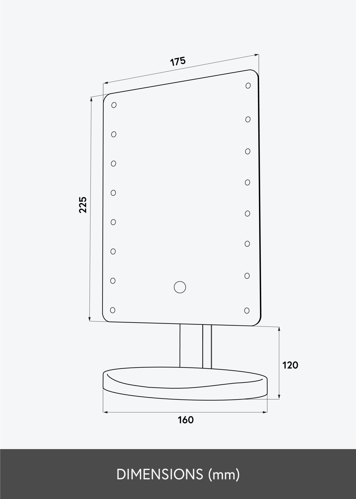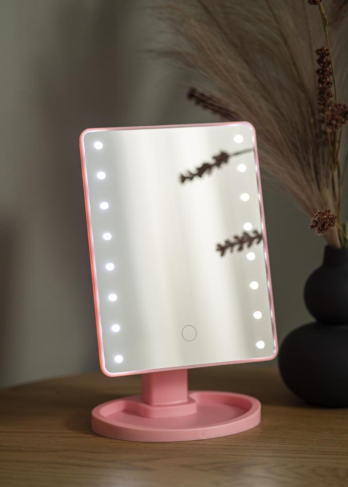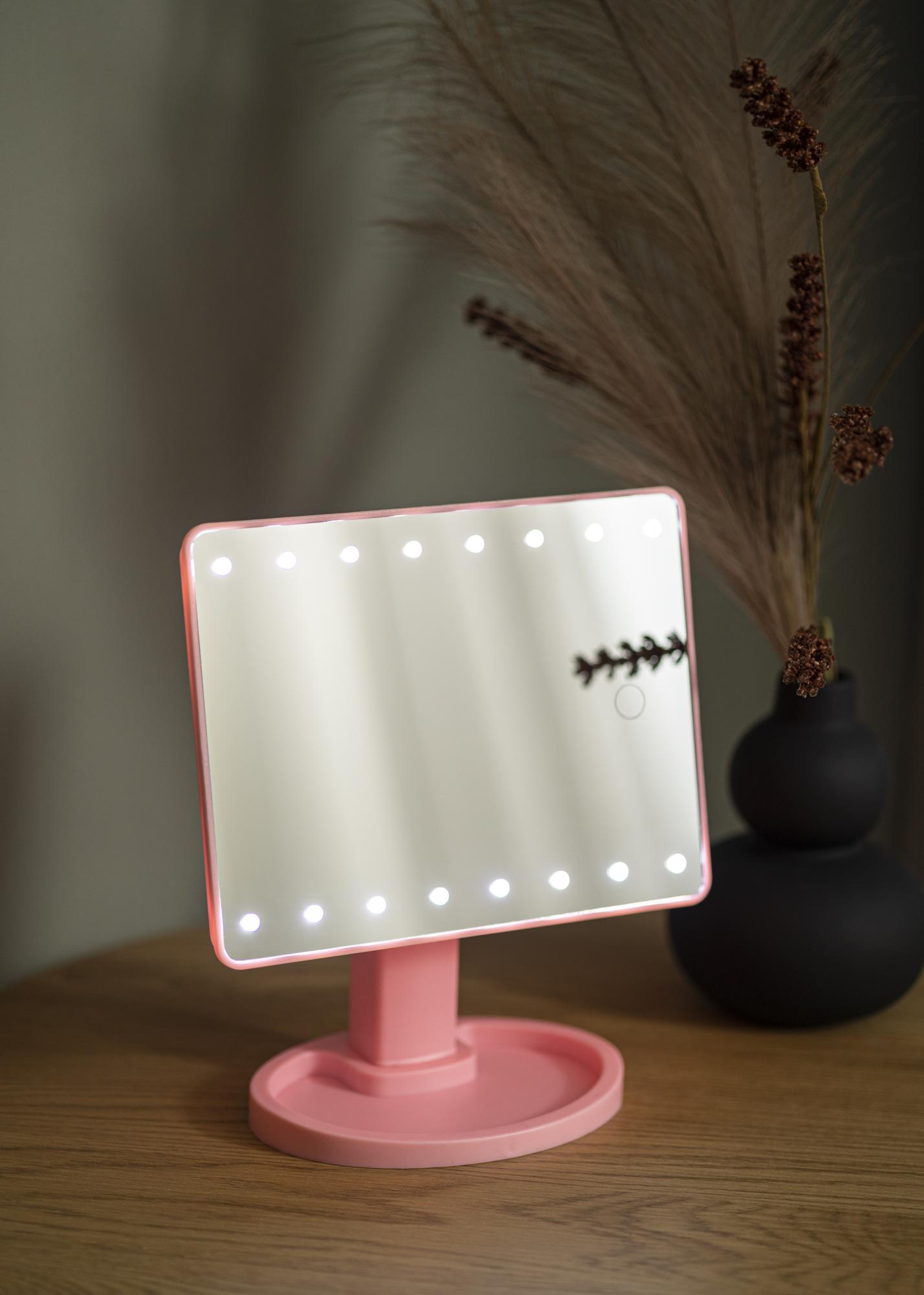 Tämä meikkipeili on loistava valinta sinulle, joka haluat pienemmän peilin kauniissa mallissa. Peilin vaaleanpunainen sävy antaa ihanan ripauksen väriä, samalla kun sisäänrakennettu LED-valaistus loistaa tasaista, kylmän valkoista valoa. Peili syttyy takapuolella olevasta katkaisijasta ja valon voimakkuutta voi säätää painamalla peilin etupuolella olevaa kosketusnäppäintä muutaman sekunnin ajan. Peili toimii AA-paristoilla, jotka myydään erikseen.