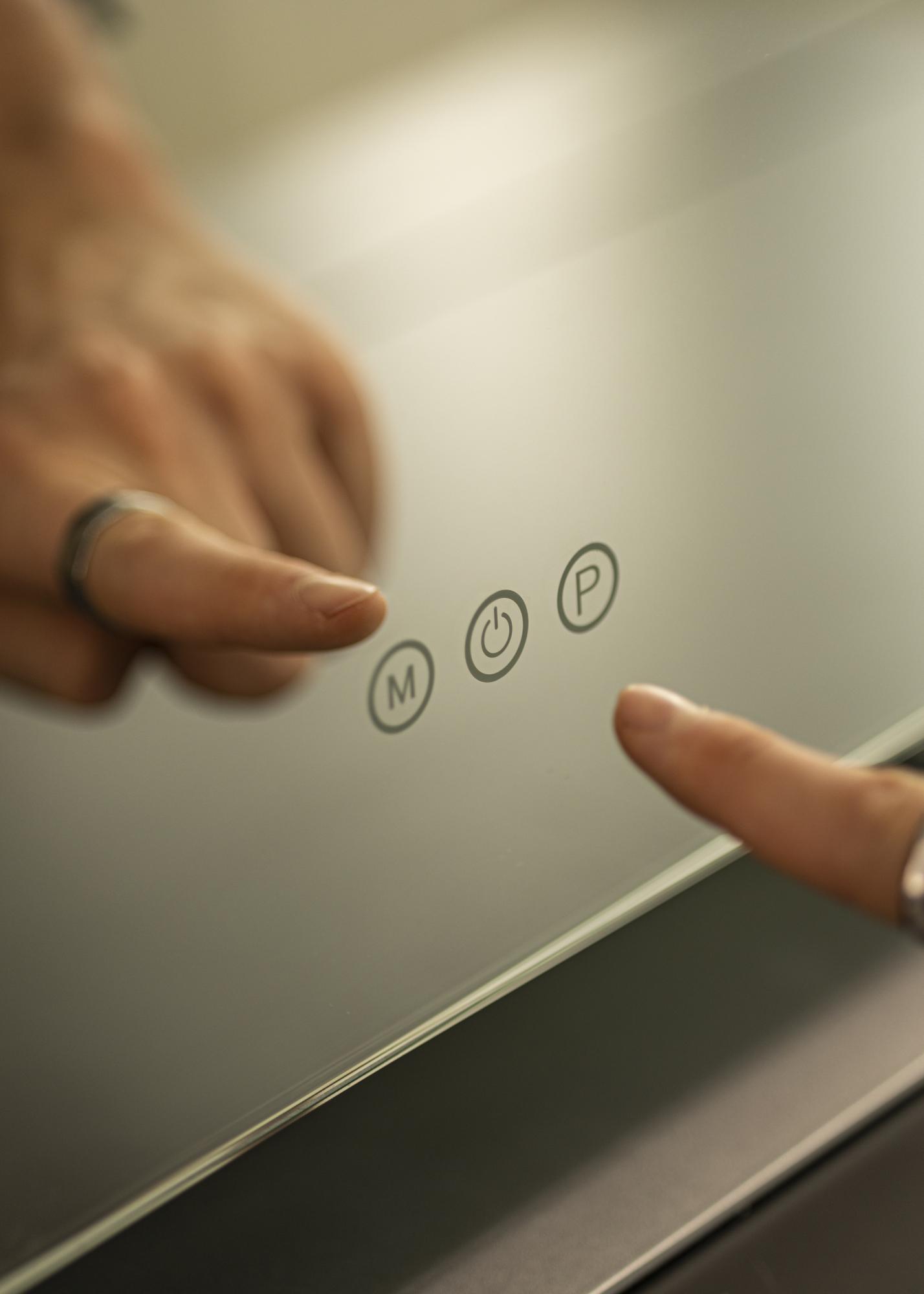 Tyylikkään meikkipeilin avulla voit luoda ylellisen tunnelman joka huoneeseen. Tässä peilissä on sisäänrakennettu LED-valaistus, joka mukautuu eri tilanteisiin. Saat siitä niin miellyttävän taustavalaistuksen olohuoneeseen kuin kirkkaan valon meikkinurkkaukseenkin. Valaistusta voi säätää peilin alareunassa olevista kosketusnäppäimistä: “M”-nappi säätää valon värilämpötilaa ja “P”-nappi valonvoimakkuutta. Mukana on myös virtanappi, josta valo syttyy ja sammuu. Peili liitetään pistorasiaan.