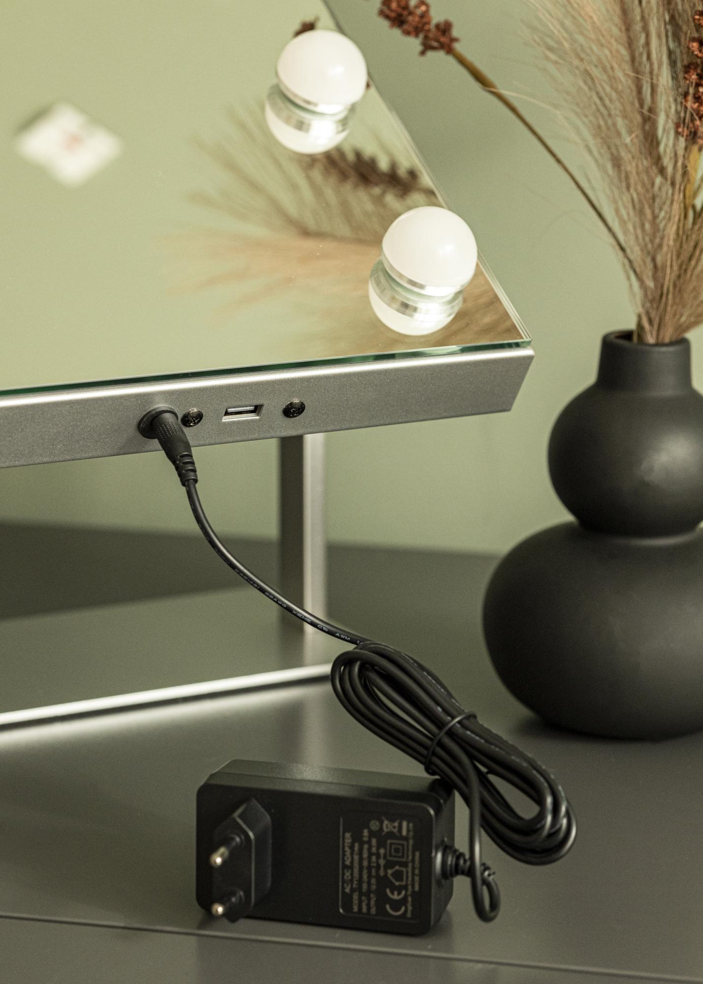 Tässä peilissä on hopeanvärinen jalusta, joka tekee peilistä hyvin elegantin ja jonka avulla peilipintaa voi käännellä. Peilin alareunassa on USB-portti älylaitteiden latausta varten.