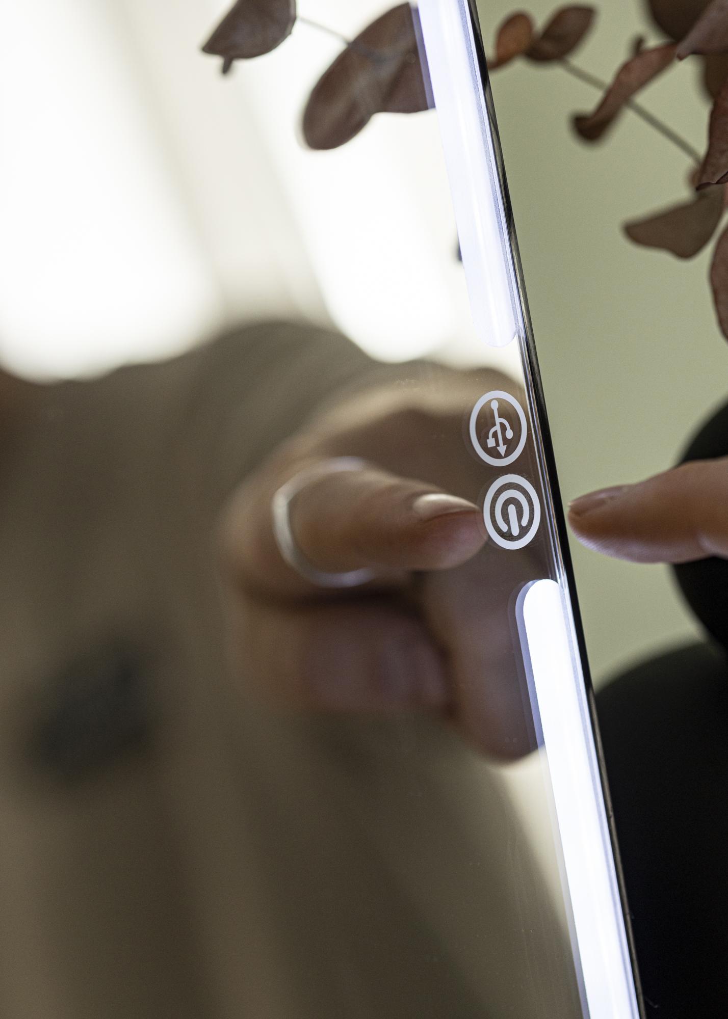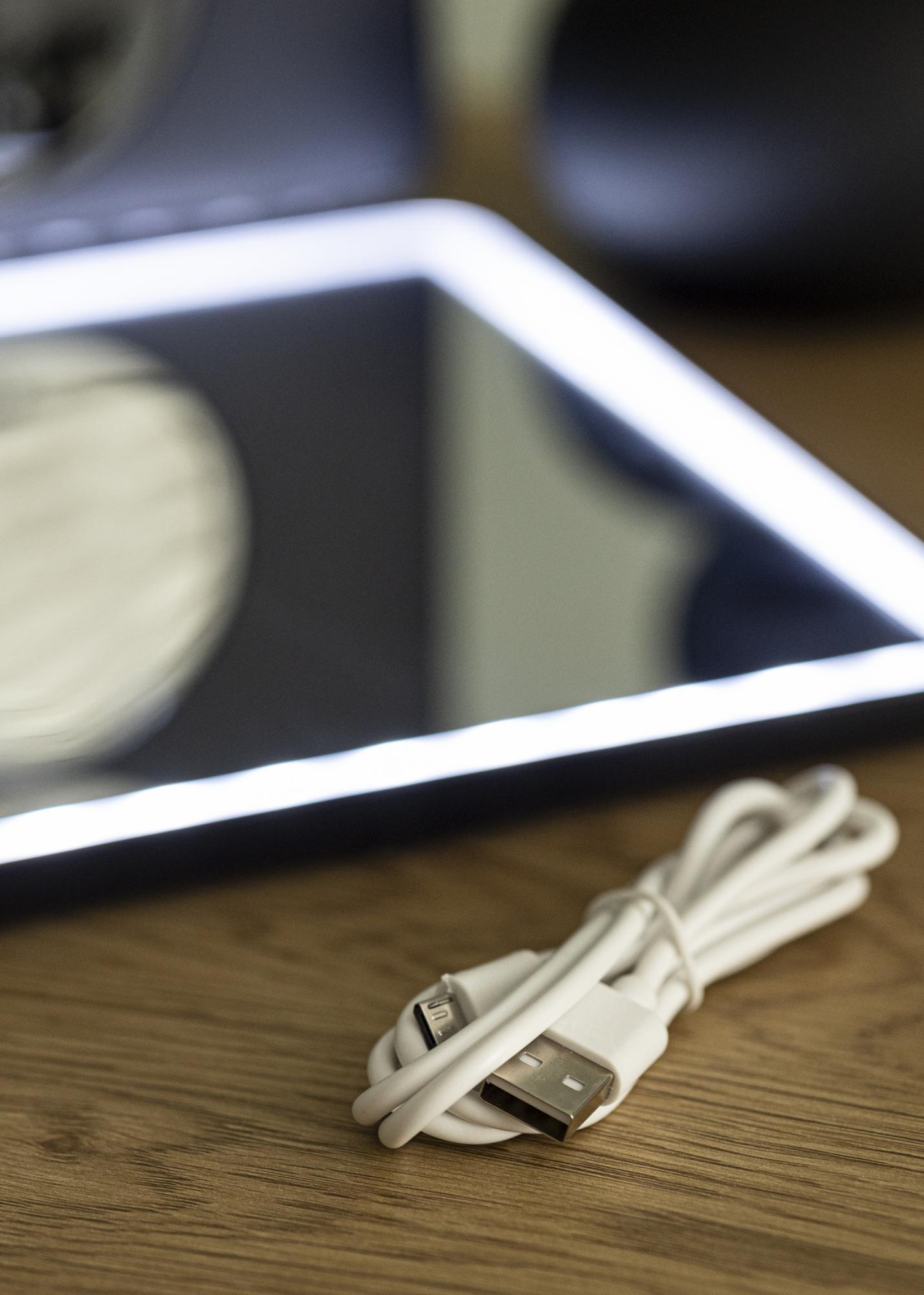 Peilissä on tyylipuhdas musta väri ja sisäänrakennettu LED-valaistus. Valaistusta voi säädellä ja peilin laittaa päälle ja pois päältä peilin kehyksessä olevista kosketusnäppäimistä. Jos laitat peilin kiinni, kun virta on vielä päällä, menee peili automaattisesti virransäästötilaan, ja valaisee taas uudelleen, kun avaat peilin. Peili on akkukäyttöinen ja se ladataan USB-kytkennän kautta.