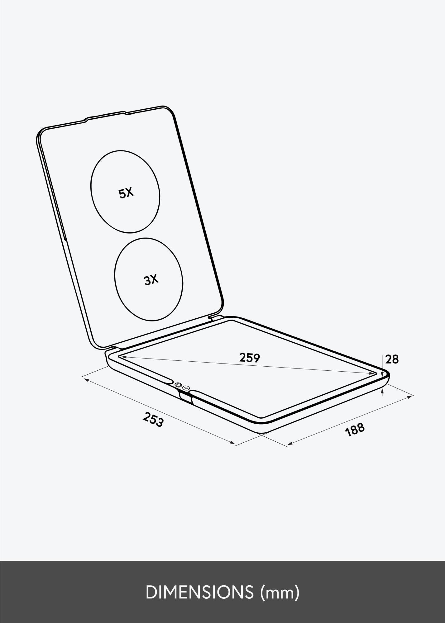 Haluatko taskukokoisen meikkipeilin, joka mahtuu täydellisesti sekä takintaskuun että laukkuun? Siinä tapauksessa tämä kompakti meikkipeili on hyvä valinta! Peilissä on 18,5x25 cm kokoinen peilipinta ja kokoontaitettava muotoilu, joka suojaa peiliä lialta ja pölyltä. Taitettavan muotoilun ansiosta voit myös käännellä peiliä käytössä. Tavallisen peililasin lisäksi peilissä on sekä 5-kertaisesti että 3-kertaisesti suurentava peilipinta.