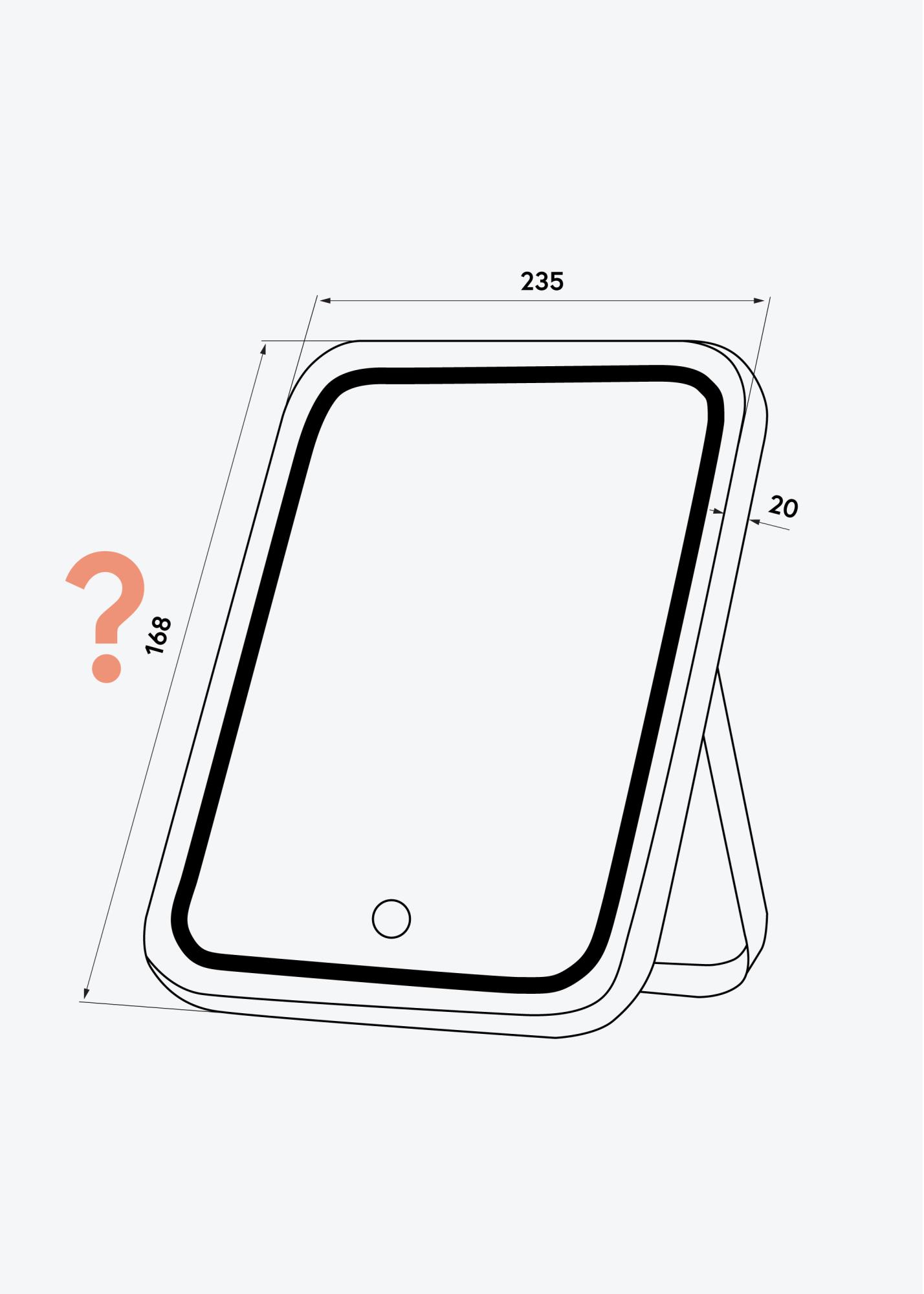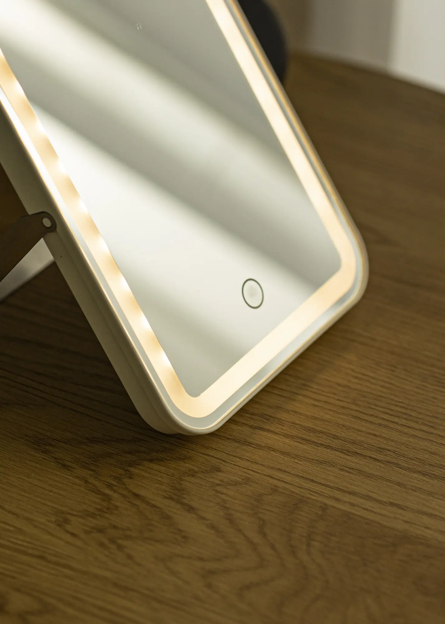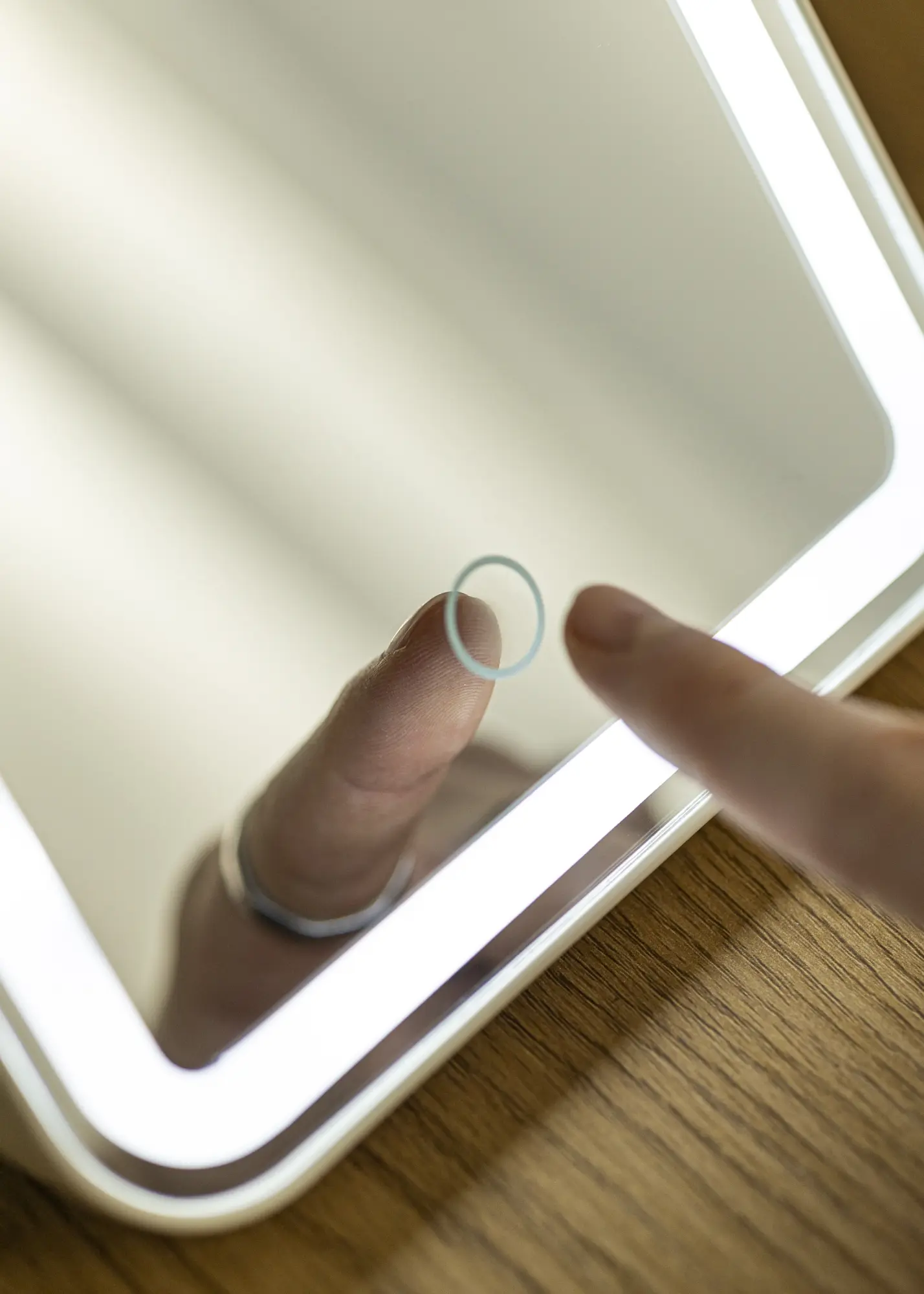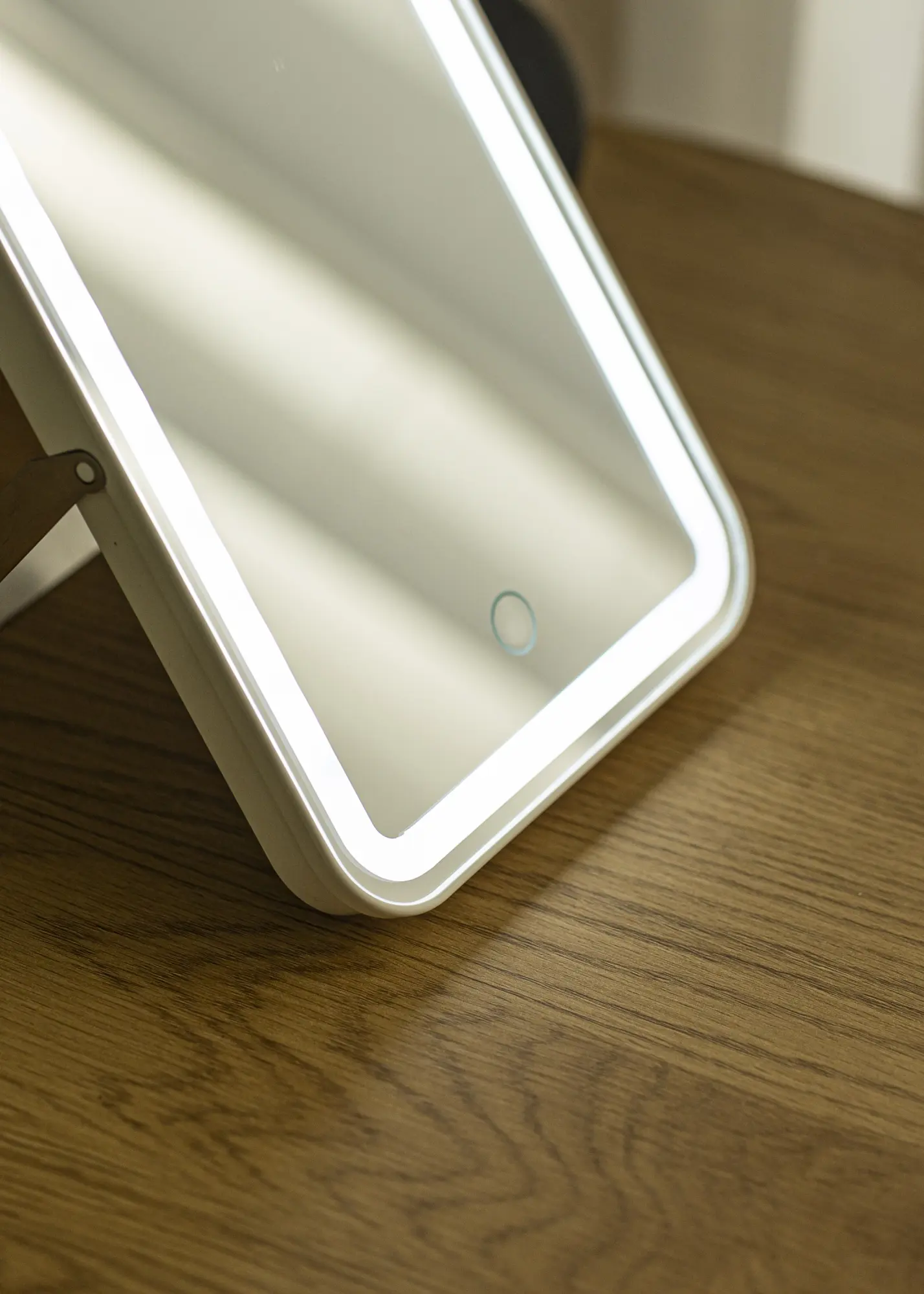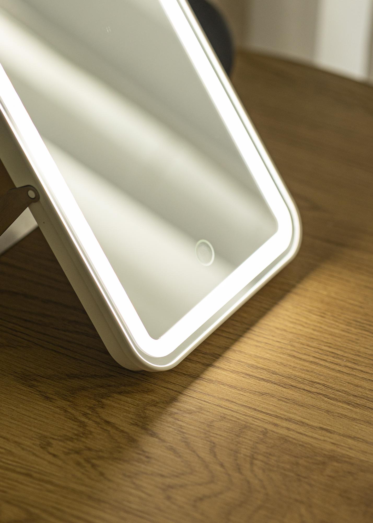 Tämä meikkipeili on pienemmän kokoinen, täydellinen sinulle, joka tykkäät ottaa peilin mukaan matkalle. Peilipinnan koko on 16,5x23 cm, ja sitä kehystää tyylikäs LED-valo. Lisäjoustavuutta peilin käyttöön saat helposti himmentämällä valoa tai muuttamalla valaistuksen värilämpötilaa. Tämä tapahtuu painamalla peilin alareunassa olevaa kosketusnäppäintä pohjassa muutaman sekunnin ajan.