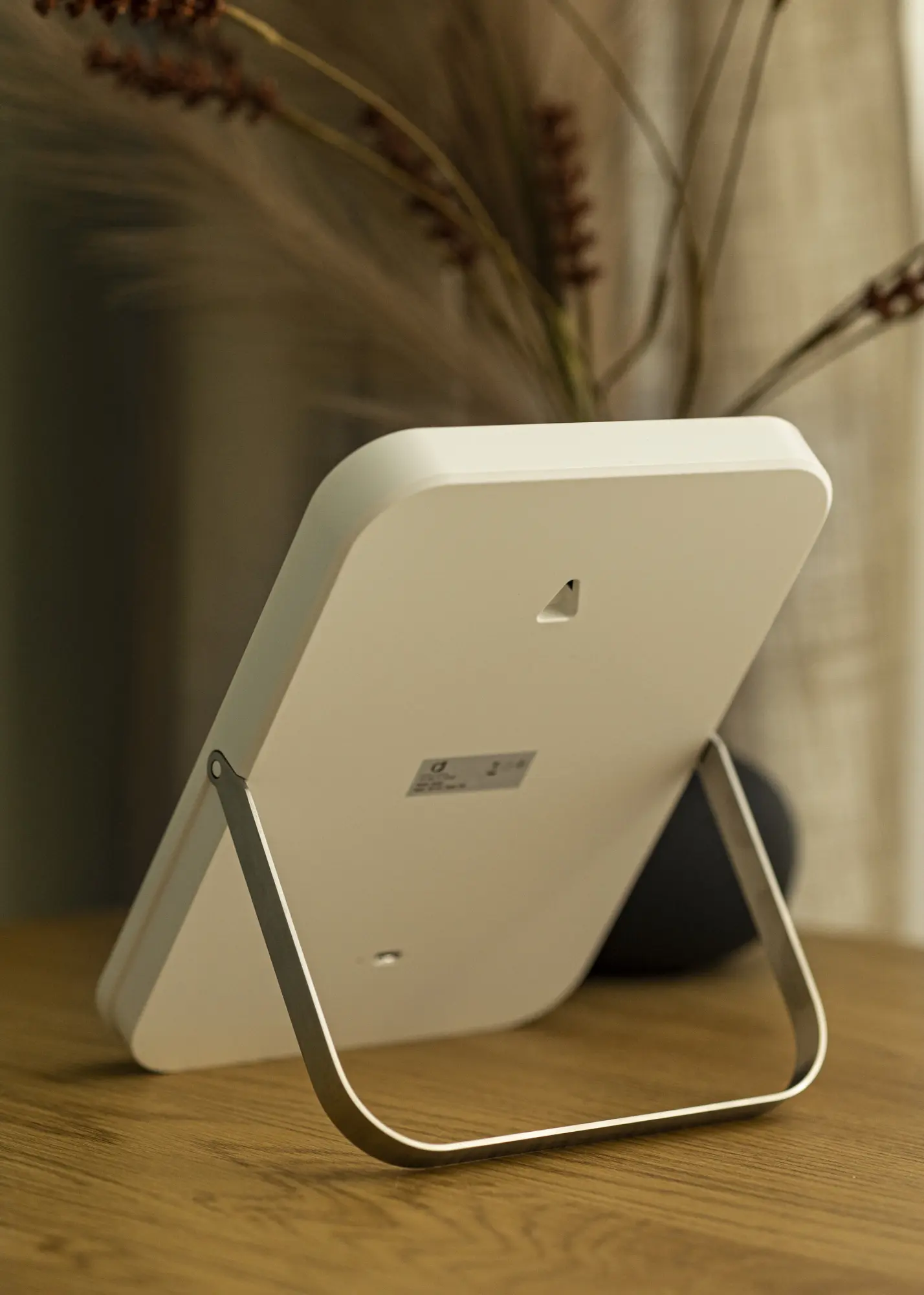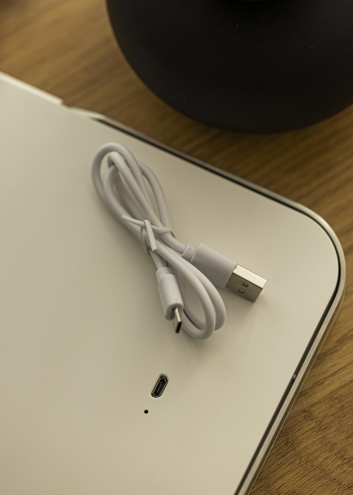 Tämä meikkipeili on neutraalin valkoisen värinen, ja peilissä on hopeansävyinen jalkatuki, jonka voi avata esille. Peilissä on sisäänrakennettu akku, jonka voi ladata helposti USB-liitännän avulla. Latauskaapeli toimitetaan mukana.