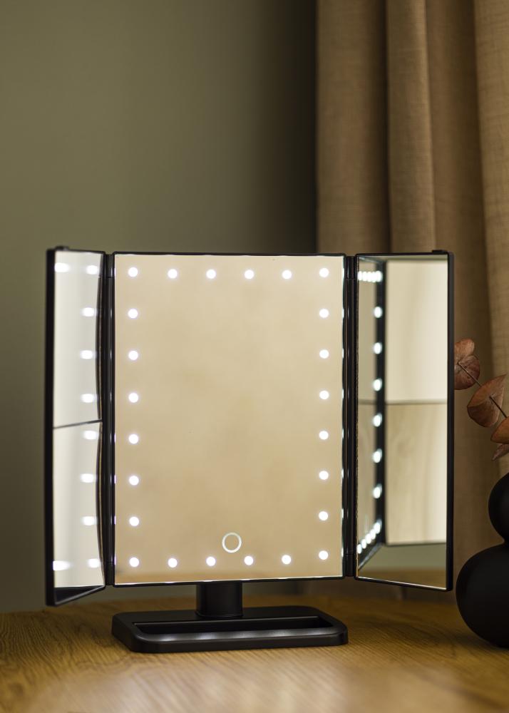 Tämä tyylipuhdas musta meikkipeili, jossa on LED-valo, on sekä kätevä että hyvännäköinen. Peilissä on älykäs muotoilu sisääntaitettavilla sivuilla, joiden avulla saat peilin sinulle mieleiseen asentoon. Keskellä oleva suuri peilipinta on varustettu tavallisella peililasilla ja pienemmissä vieressä olevissa peilipinnoissa on 2-, 3-, ja 10-kertaisesti suurentava ominaisuus.