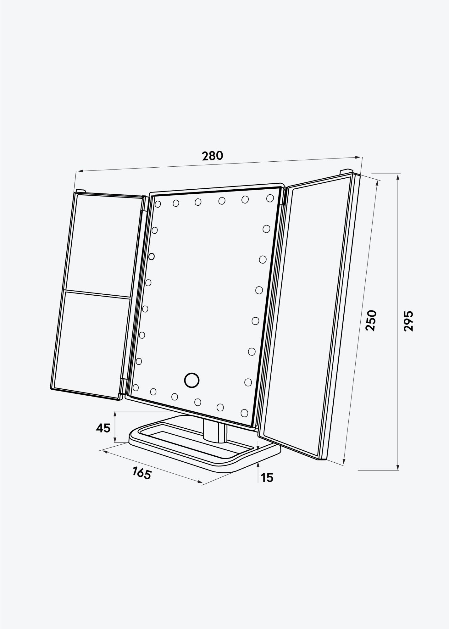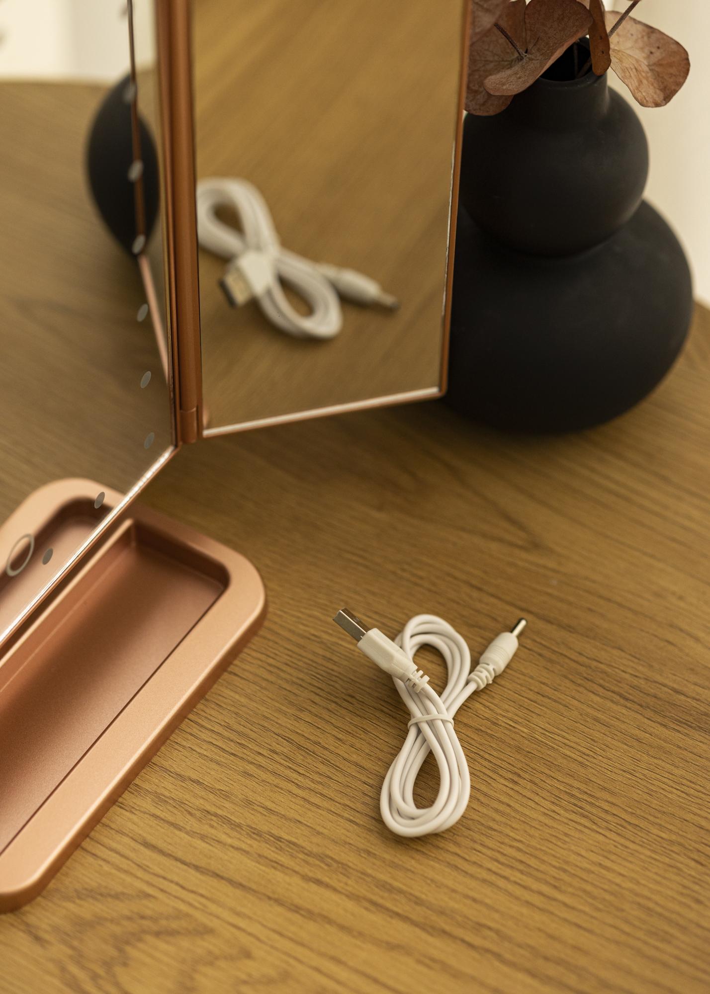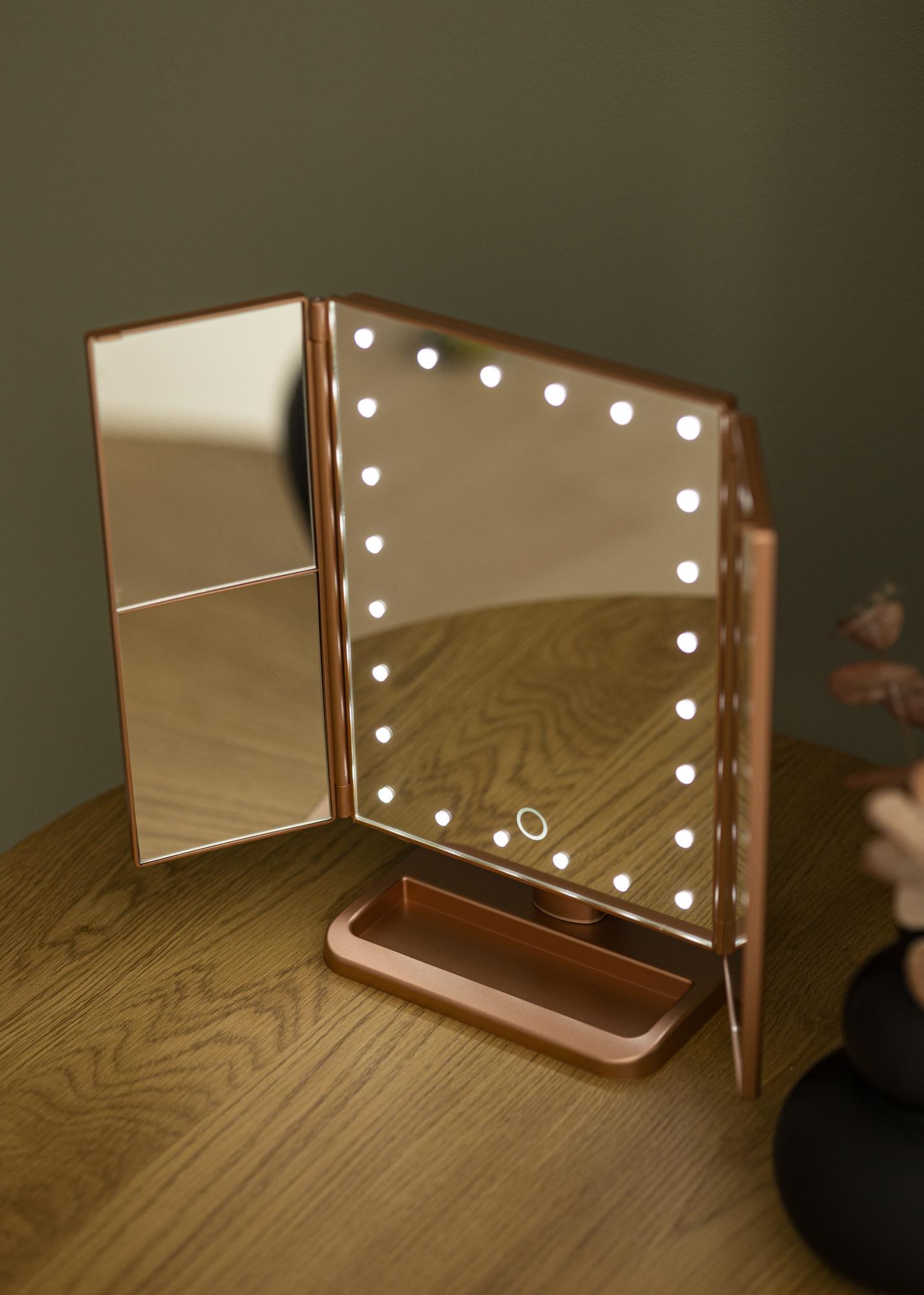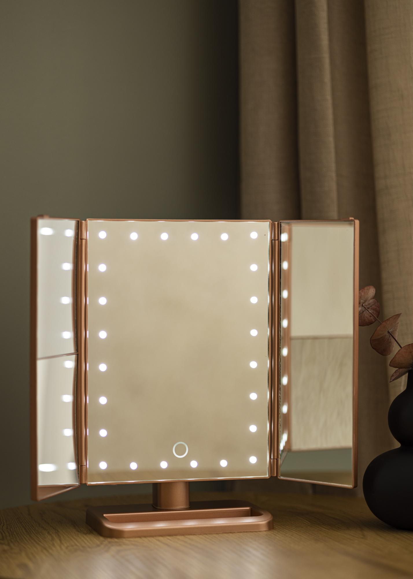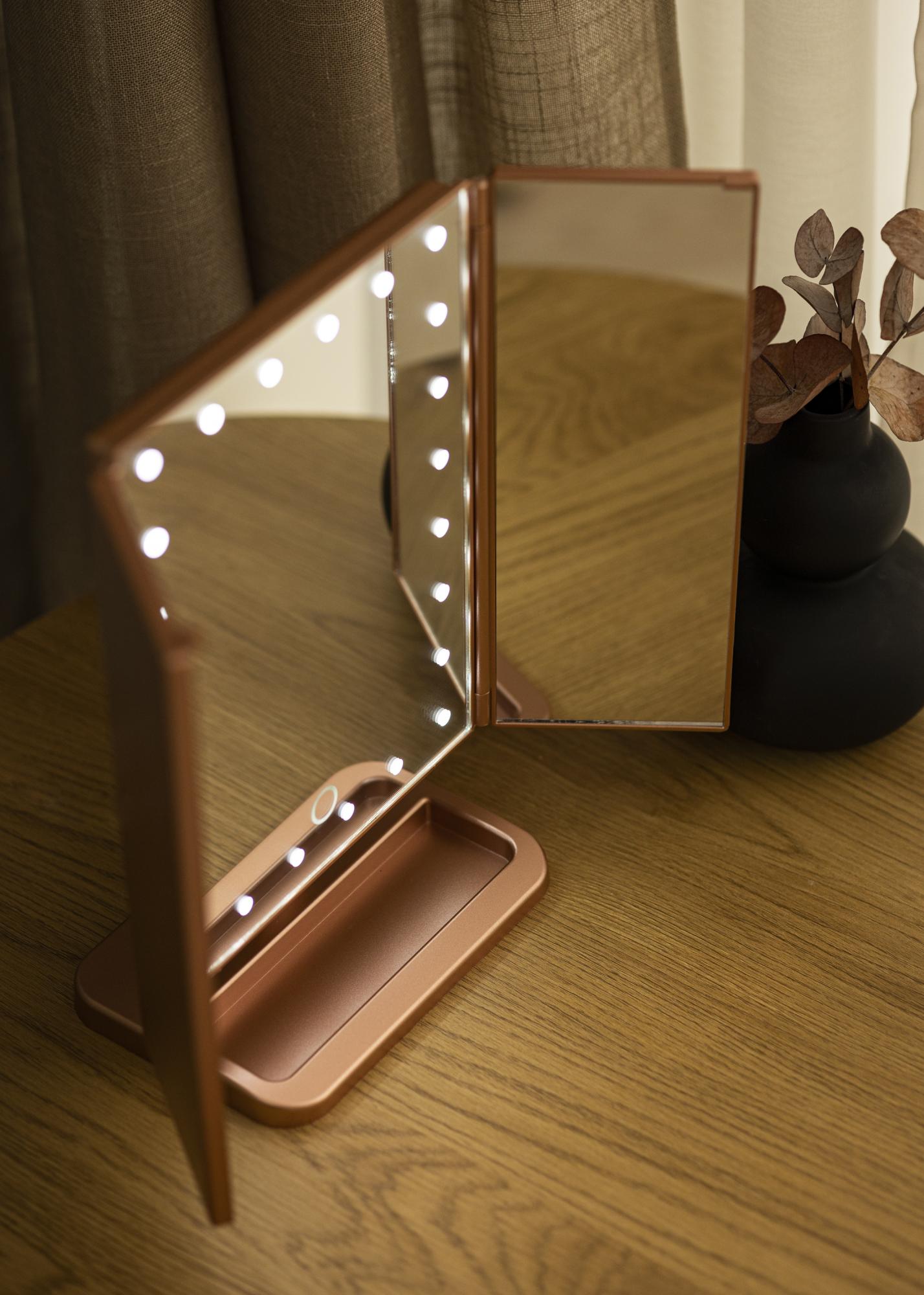 Peilissä on pystysuora muotoilu ja sillä on trendikäs ruusukullan sävy. Peilin sivut voi taittaa sisään, ja peilin asentoa voi muuttaa helposti käytön mukaan. Jotta voisit keskittyä meikkaamiseen paremmin, peilissä on 2-, 3-, ja 10-kertaisesti suurentavat peilipinnat. Suurentavat peilit on sijoitettu peilin sivussa oleville pienemmille peilipinnoille.