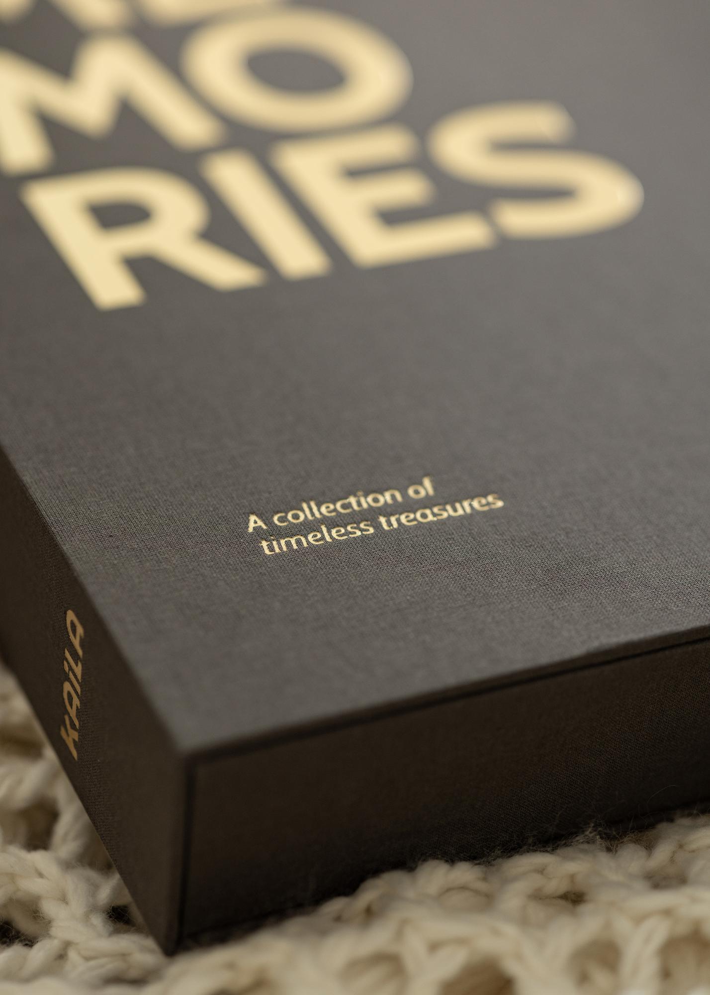 Tämä tekstiilipäällysteinen valokuva-albumi on tyylikkään musta ja niin kanteen kuin selkään on painettu kullanvärisin kirjaimin teksti ”MEMORIES”. Otsikkoa täydentää vasemman alareunan teksti ”A collection of timeless treasures”.
