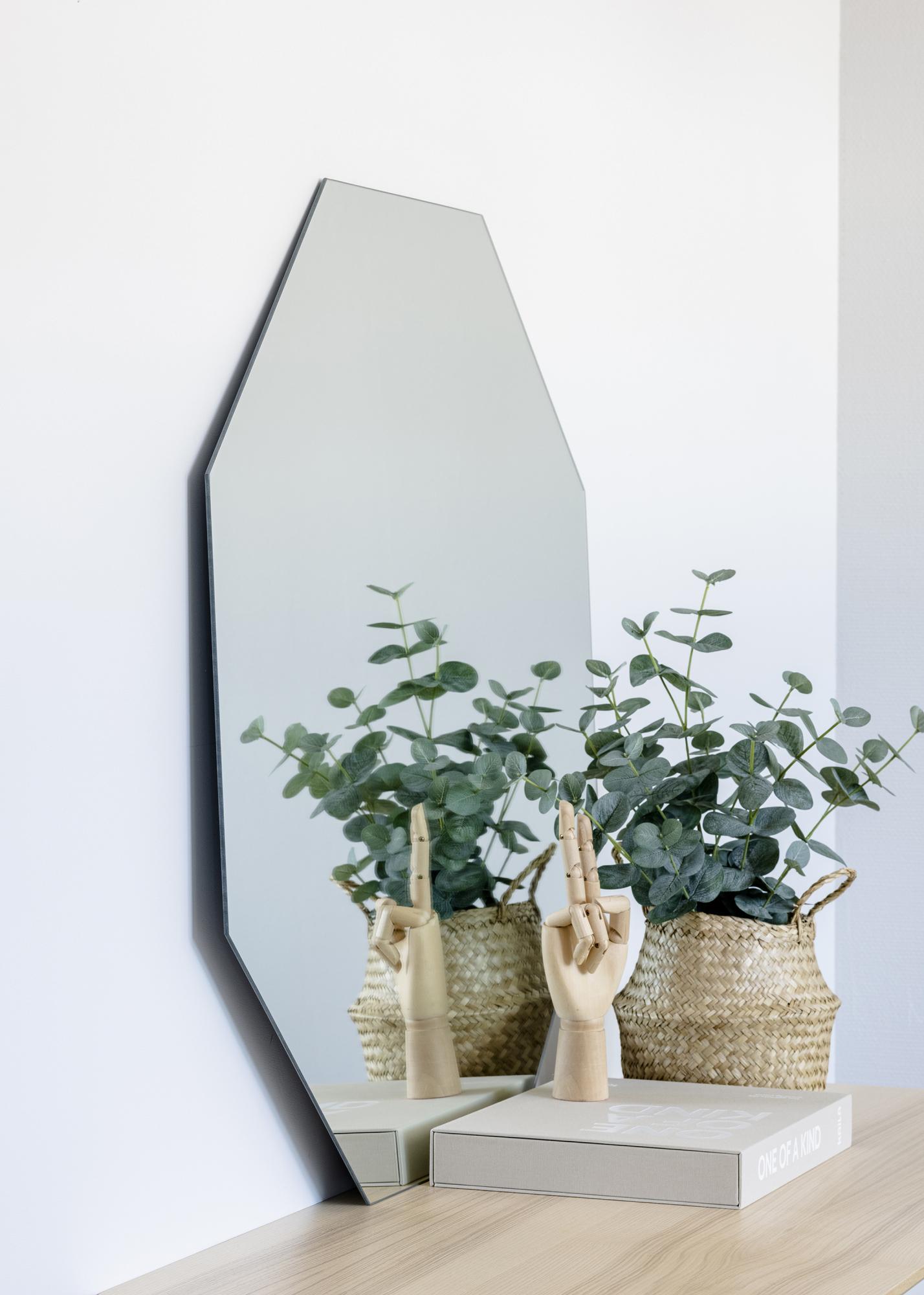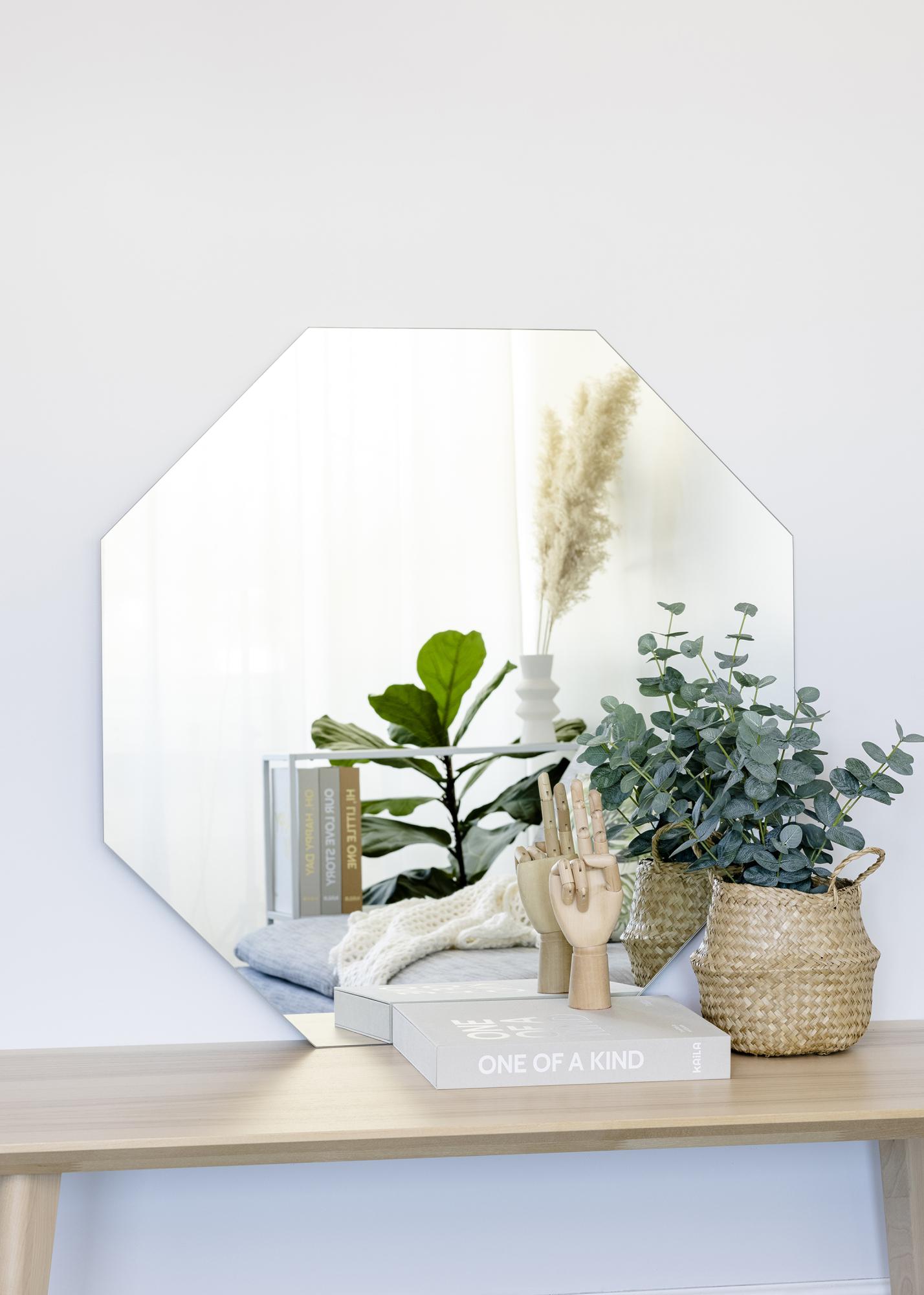 Tämä hieno peili KAILALTA on täydellinen valinta olohuoneeseen, eteiseen tai makuuhuoneeseen. Kahdeksankulmainen kehyksetön muoto luo täydellisen tasapainon minimalismin ja glamourin välille. Sisustamalla eri muodoilla ja materiaaleilla voit luoda dynamiikkaa kotiin, ja tämä kulmikas peili luo hienon kontrastin muihin huonekaluihin ja sisustuksen yksityiskohtiin. Peilissä on seinäkiinnike ja se on helppo ripustaa seinälle.