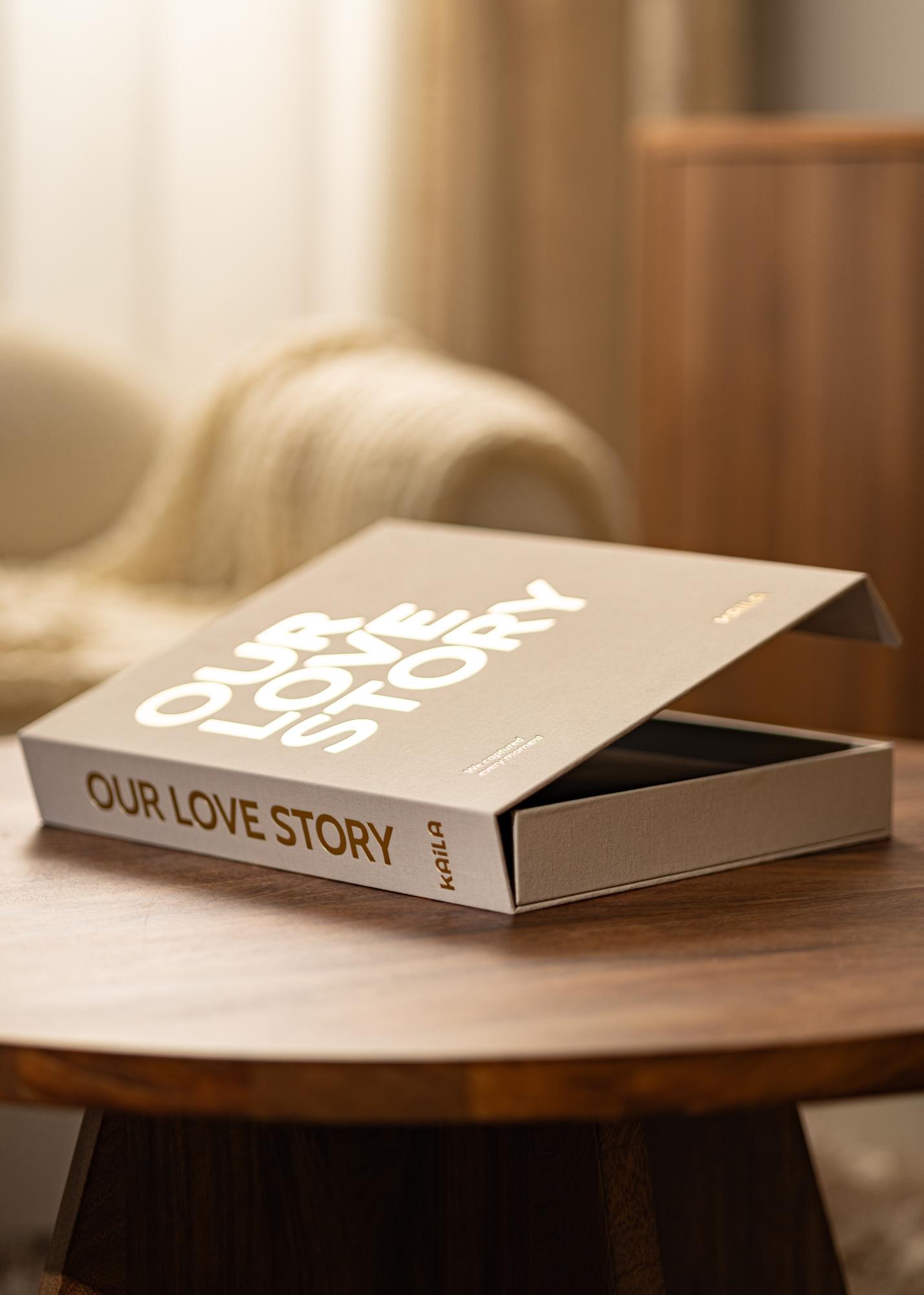 Tämä on sekä valokuva-albumi, että Coffee Table Book, josta tulee kotisi koristeellinen sisustuselementti. Tämä tyylikkään kermansävyinen albumi on muotoiltu tekstiilipäällysteiseksi rasiaksi. Sen kanteen on painettu suurin kultaisin kirjaimin ’OUR LOVE STORY’ ja alakulmaan pienemmin kirjaimin ’We captured every moment’, mikä tekee tästä albumista täydellisen säilyttämään kuvia rakkaimmistaan tai vaihtoehtoisesti upean lahjan. Albumin sisäkannessa on herkkä painokuvio ja rasia avautuu rengaskansioksi, joka sisältää 30 mustaa arkkia (yhteensä 60 sivua). Voit päästää luovuutesi valloilleen, sillä kuvia voi kiinnittää vapaasti toivomallasi tavalla.