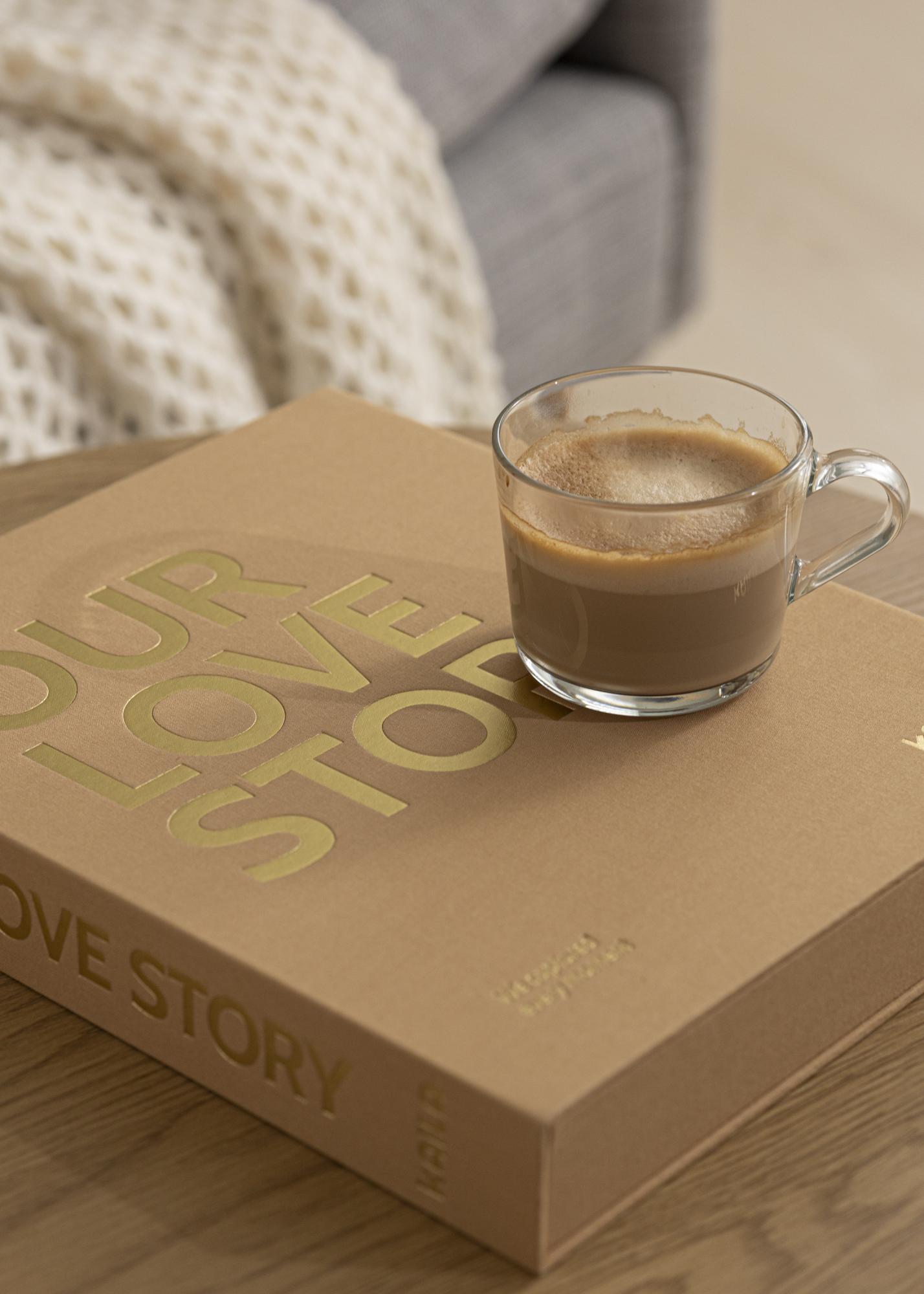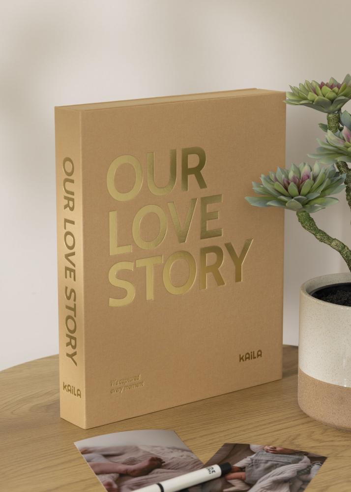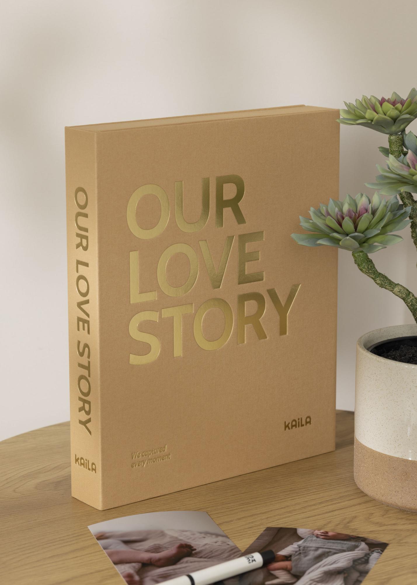 Tämä on sekä valokuva-albumi, että Coffee Table Book, josta tulee kotisi koristeellinen sisustuselementti. Tämä tyylikkään lämpimänkeltainen albumi on muotoiltu tekstiilipäällysteiseksi rasiaksi. Sen kanteen on painettu suurin kultaisin kirjaimin ’OUR LOVE STORY’ ja alakulmaan pienemmin kirjaimin ’We captured every moment’, mikä tekee tästä albumista täydellisen säilyttämään kuvia rakkaimmistaan tai vaihtoehtoisesti upean lahjan. Albumin sisäkannessa on herkkä painokuvio ja rasia avautuu rengaskansioksi, joka sisältää 30 mustaa arkkia (yhteensä 60 sivua). Voit päästää luovuutesi valloilleen, sillä kuvia voi kiinnittää vapaasti toivomallasi tavalla.