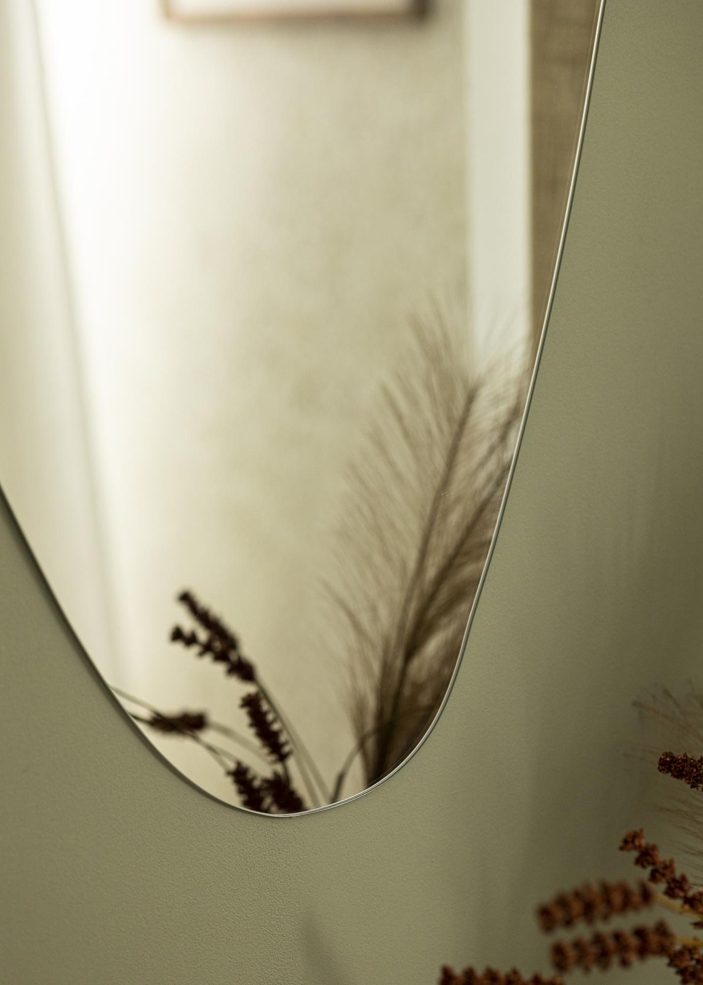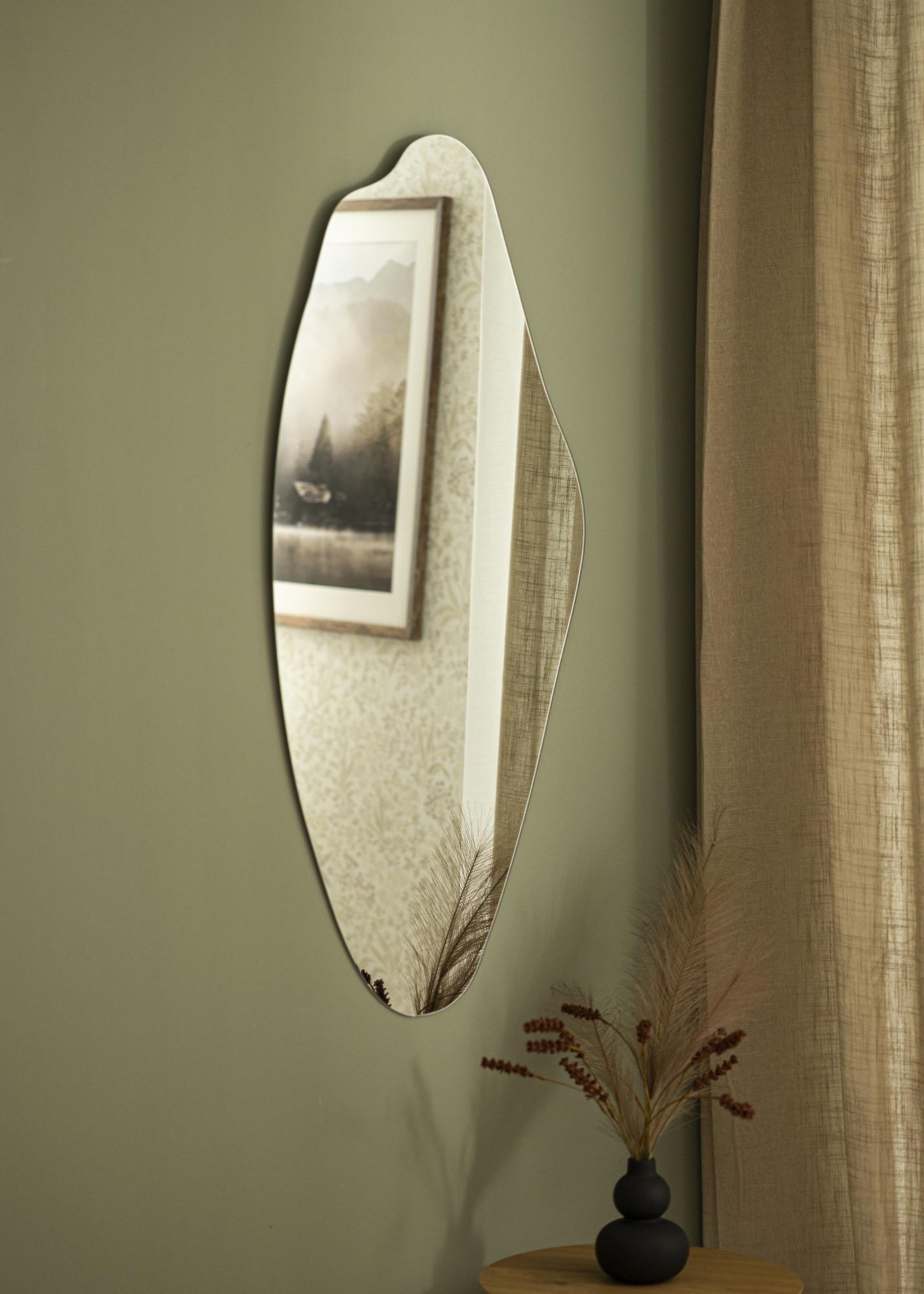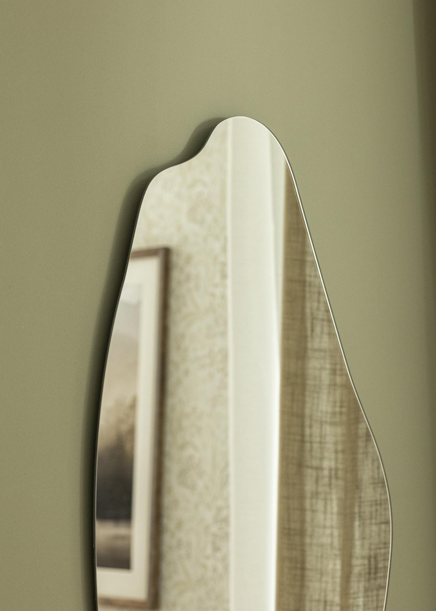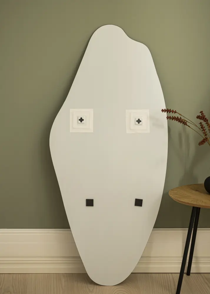 Tämä on pitkulainen peili, jonka kaunis asymmetrinen muoto tekee siitä mielenkiintoisen sisustusyksityiskohdan, joka sopii täydellisesti moderniin kotiin. Peilin takana on käytännölliset seinäkiinnikkeet, joiden avulla voit ripustaa sen haluamallesi seinälle – peili sopii jopa kylpyhuonekäyttöön!