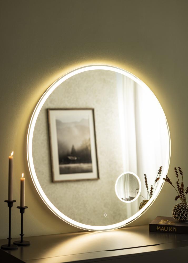 Etsitkö tyylipuhdasta kylpyhuoneen peiliä, jossa on sisäänrakennettu LED-valo ja suurentava ominaisuus? Tässä on peili juuri sinulle! Peilillä on klassisen pyöreä muoto ja LED-valo pitkin peilipinnan reunoja. Peili on varustettu tavallisella peililasilla ja siinä on pienempi 3-kertaisesti suurentava peilipinta, jossa on myös LED-valaistus. Valaistuksessa on miellyttävä 3000K hohde, jota voit helposti himmentää 10-100% valonvoimakkuudesta. Säätääksesi valonvoimakkuutta, pidä peilin syrjässä olevaa kosketusnäppäintä pohjassa muutaman sekunnin ajan.