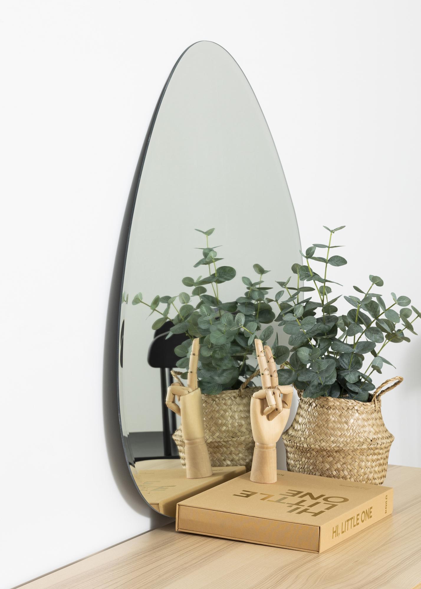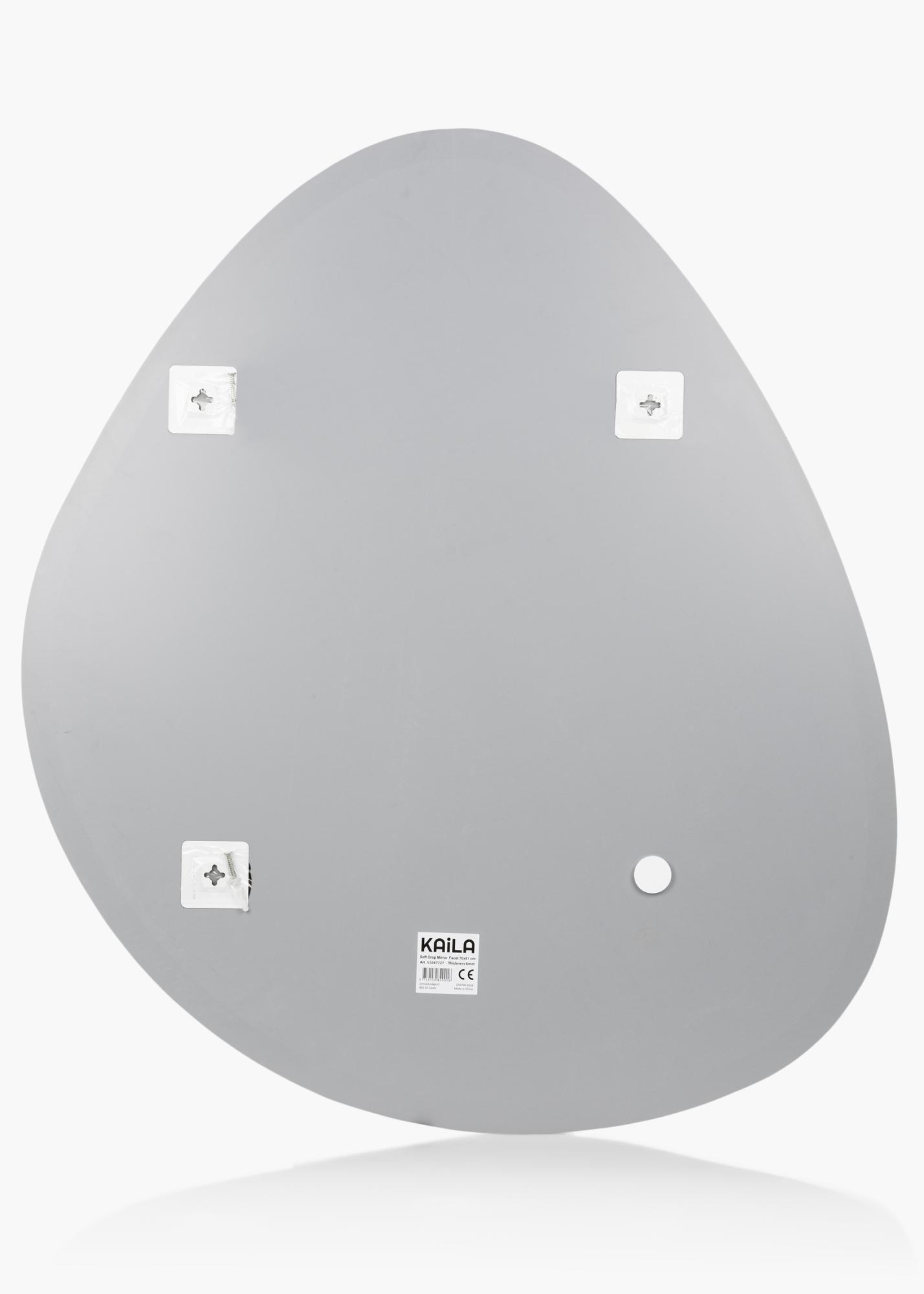 Tämä seinäpeili KAILAlta on muodoltaan elegantin epäsymmetrinen ja muistuttaa pisaraa. Peili on erittäin ohut eikä siinä ole kehystä, mikä yhdessä ylellisen fasettihiotun reunan kanssa korostaa entisestään eleganttia ja modernia ulkonäköä. Se on erittäin koristeellinen seinäpeili, joka taatusti vetää puoleensa katseita mihin tahansa huoneeseen se laitetaankin - niin olohuoneessa, eteisessä kuin makuuhuoneessakin. Peilin koko on 70x81 cm.