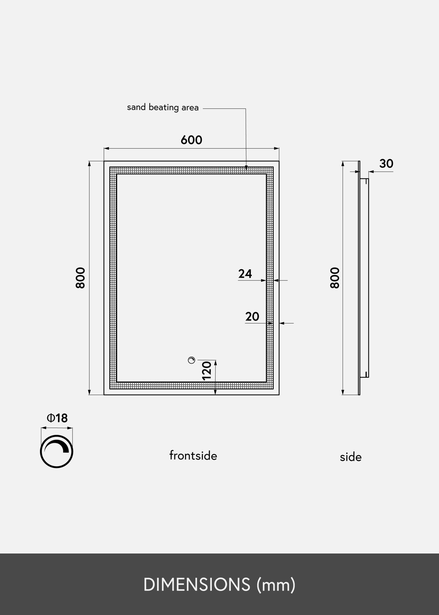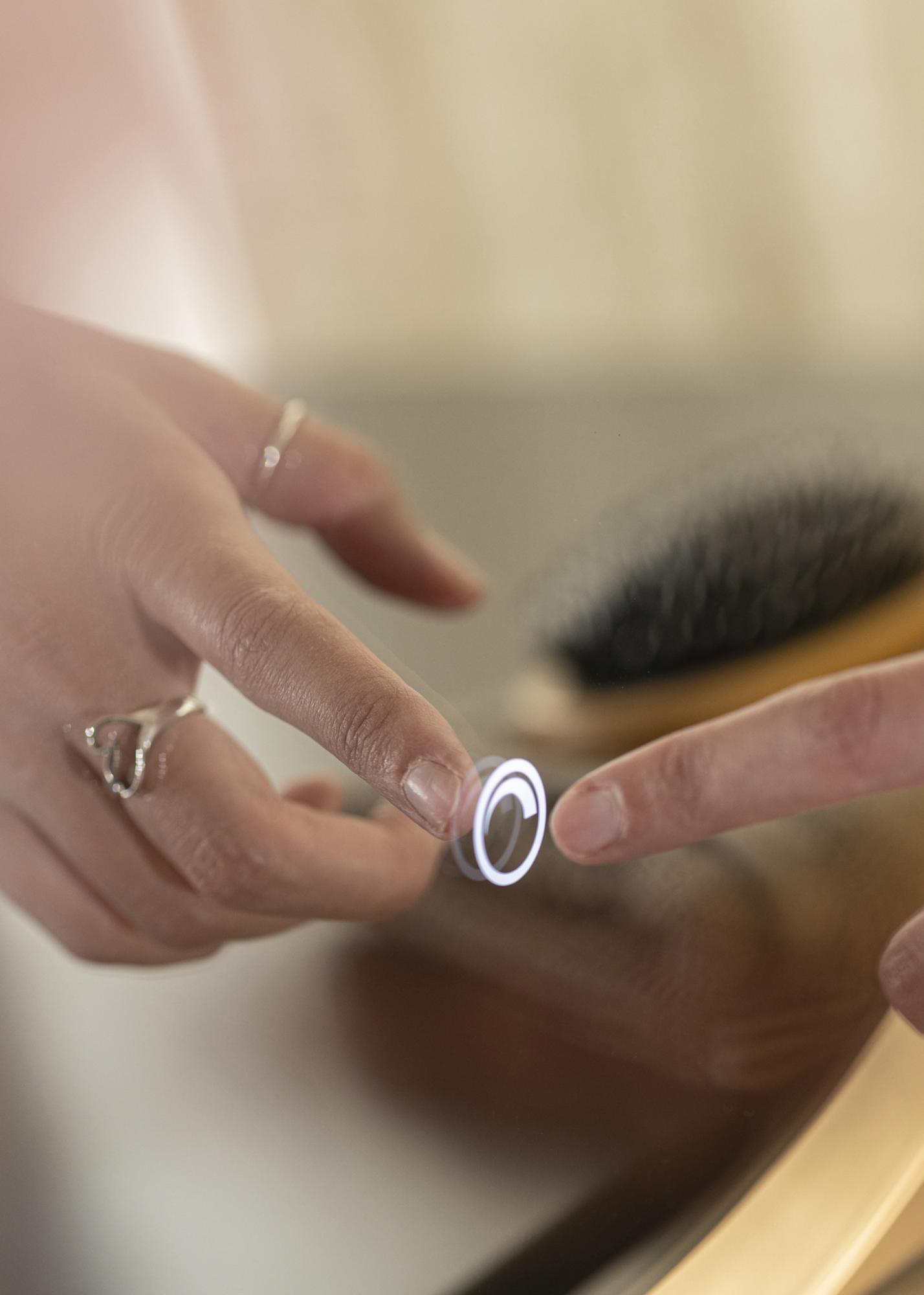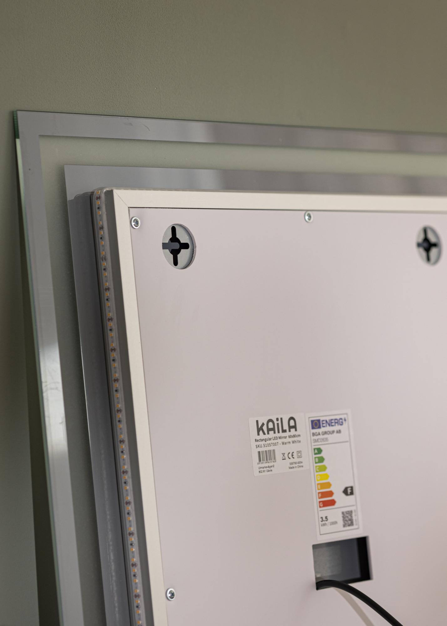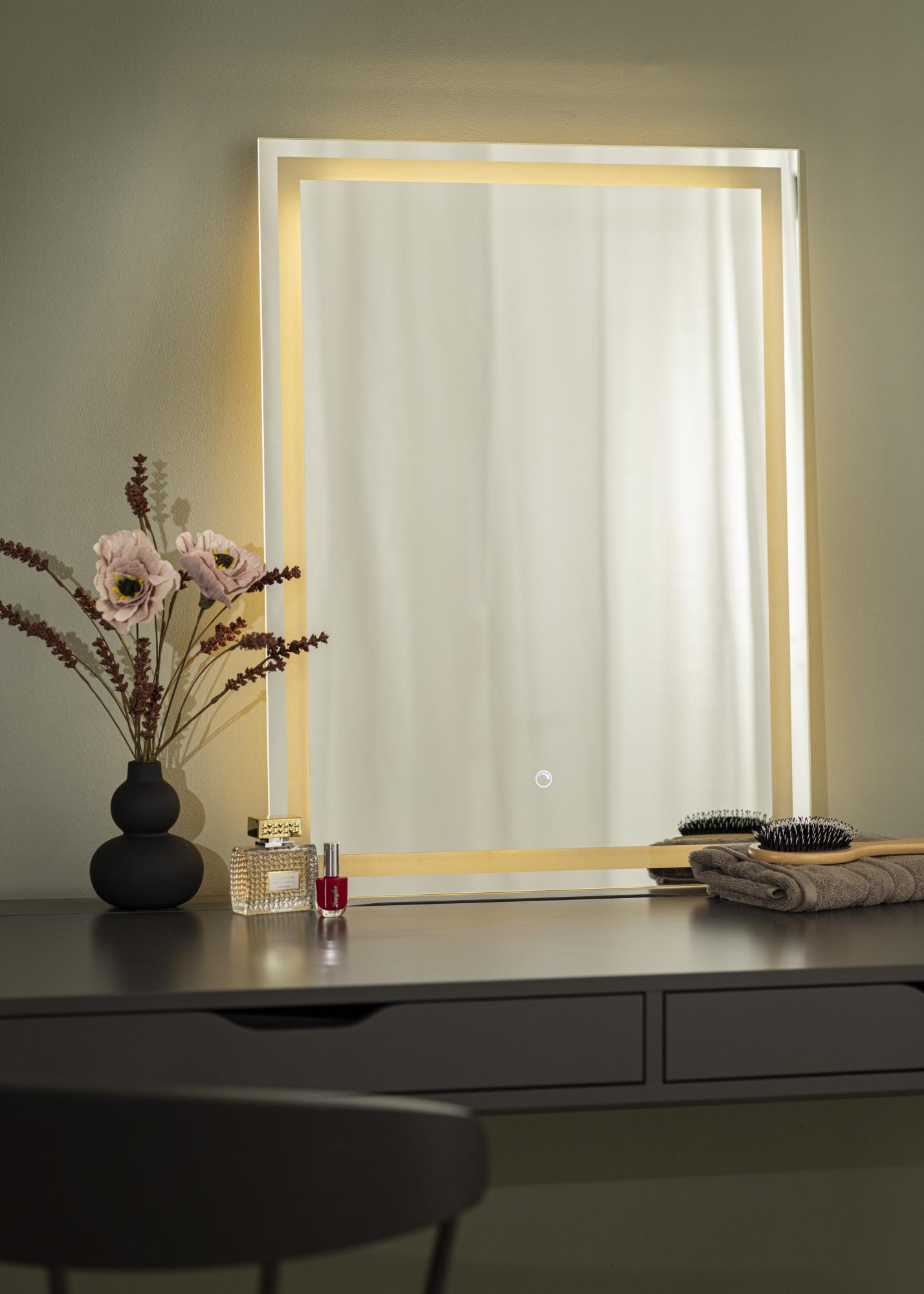 Jos etsit modernia ja minimalistista peiliä, jossa on valaistus, tämä peili on sopiva juuri sinulle. Peili on varustettu energiaa säästävillä LED-lampuilla, jotka luovat täydellisen tasaisen valon meikkaamiseen ja peilaamiseen. Valaistus on sijoitettu peilin takapuolelle, josta se hehkuu läpi luoden tyylikkään kehyksen peilin etupuolelle. Säätääksesi valonvoimakkuutta, pidä peilin syrjässä olevaa kosketusnäppäintä pohjassa muutaman sekunnin ajan.