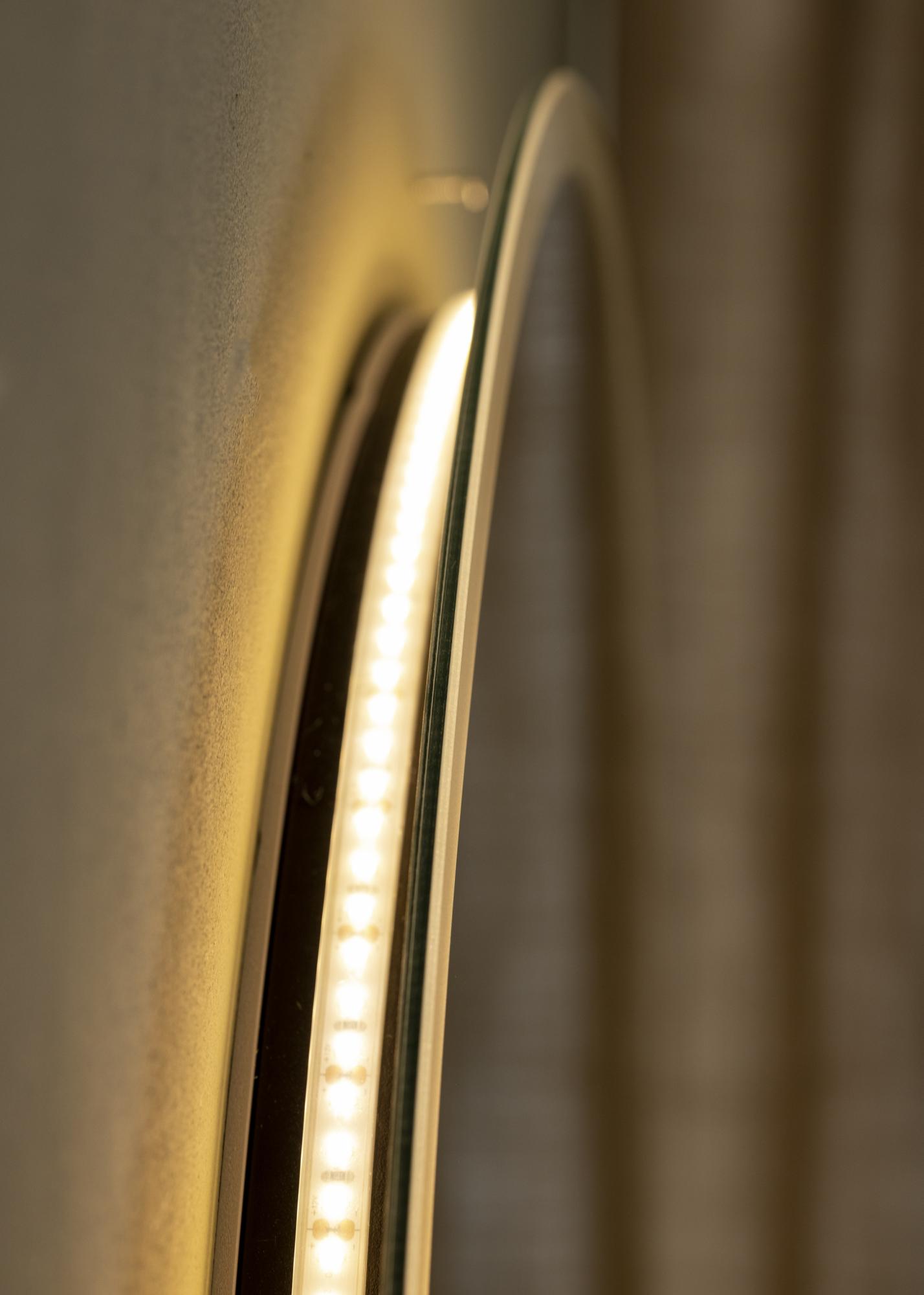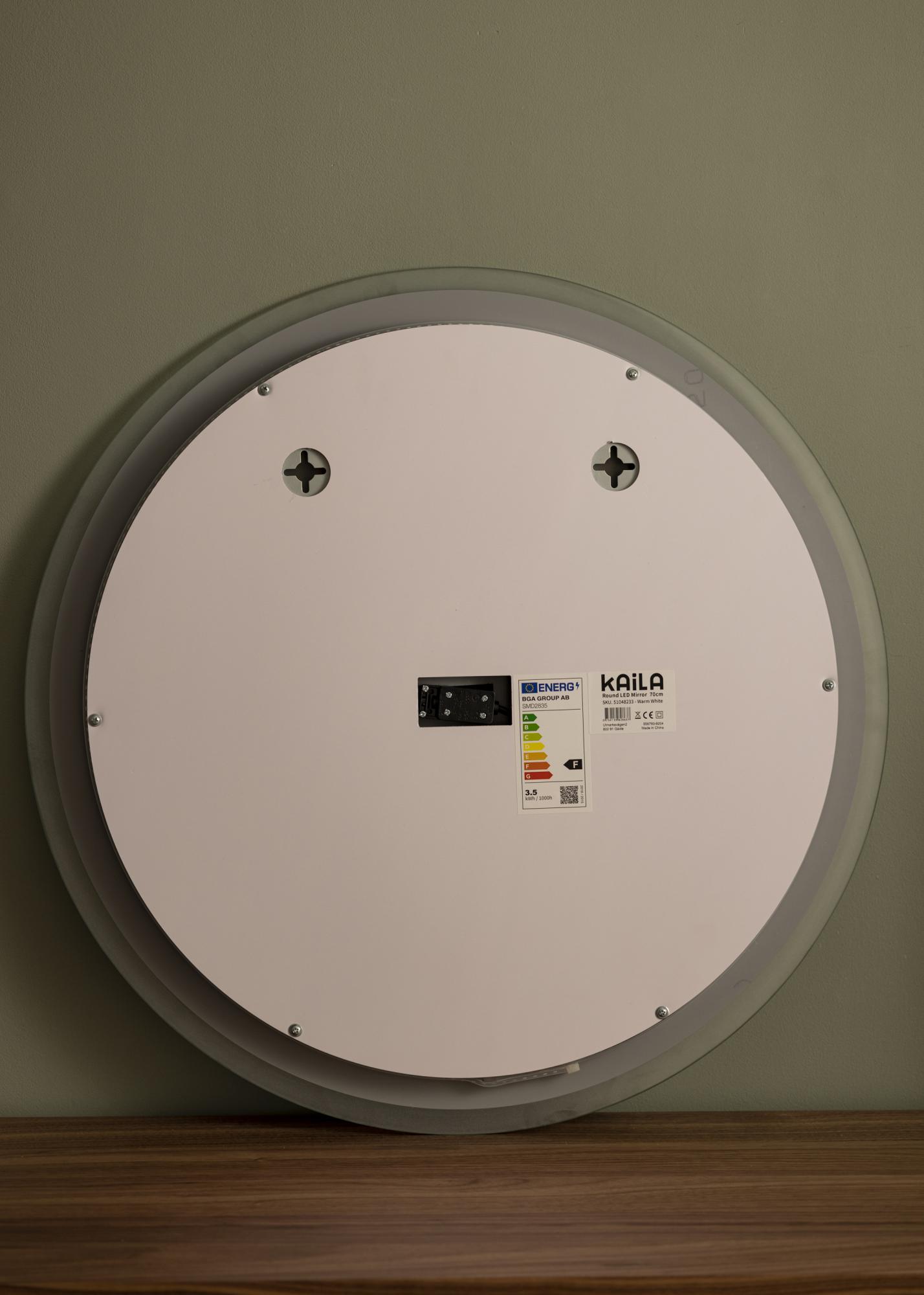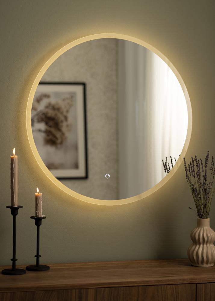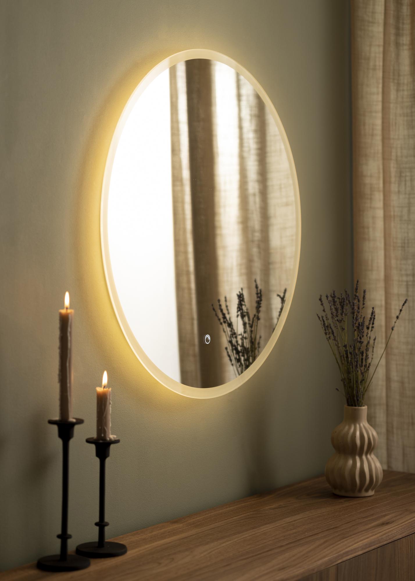 Kaunis ja klassinen pyöreä kylpyhuoneen peili, jota kehystää huurrettu reuna integroidulla LED-valaistuksella. Valo sijaitsee peilin taustalla ja luo lämpimänvalkoisen, 3000 K valon heijastettavaan kohteeseen. Valon voimakkuutta voi helposti säätää painamalla näytön vesiitiivistä kosketusnäppäntä muutaman sekunnin ajan. Kun käytät peiliä seuraavan kerran valon voimakkuus tulee olemaan sama kuin viimeksi säätämäsi. Peilissä on seinäkiinnitys ja se on hyväksytty kylpyhuonekäyttöön. Peili on tarkoitettu kiinteään sähköverkkoasennukseen ja liitettäväksi valokatkaisimeen.