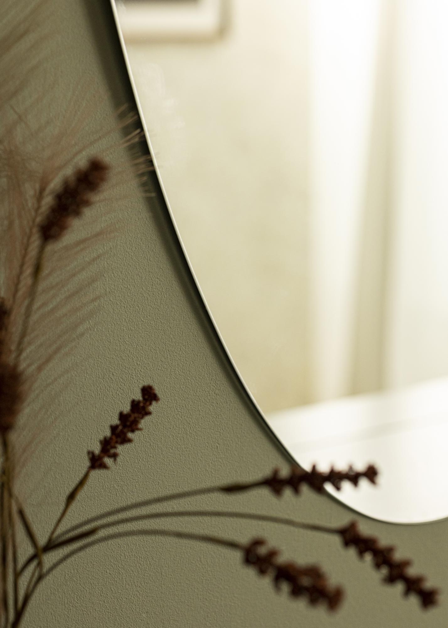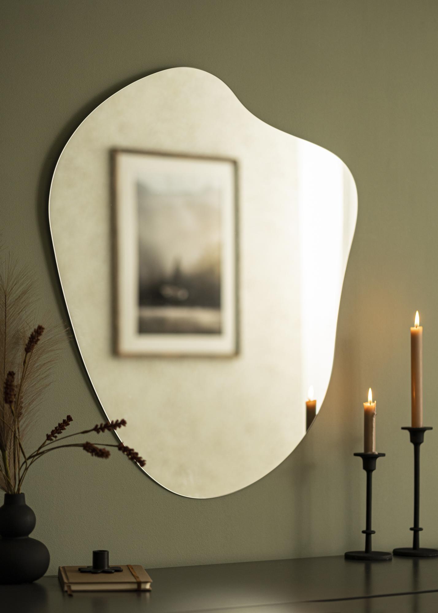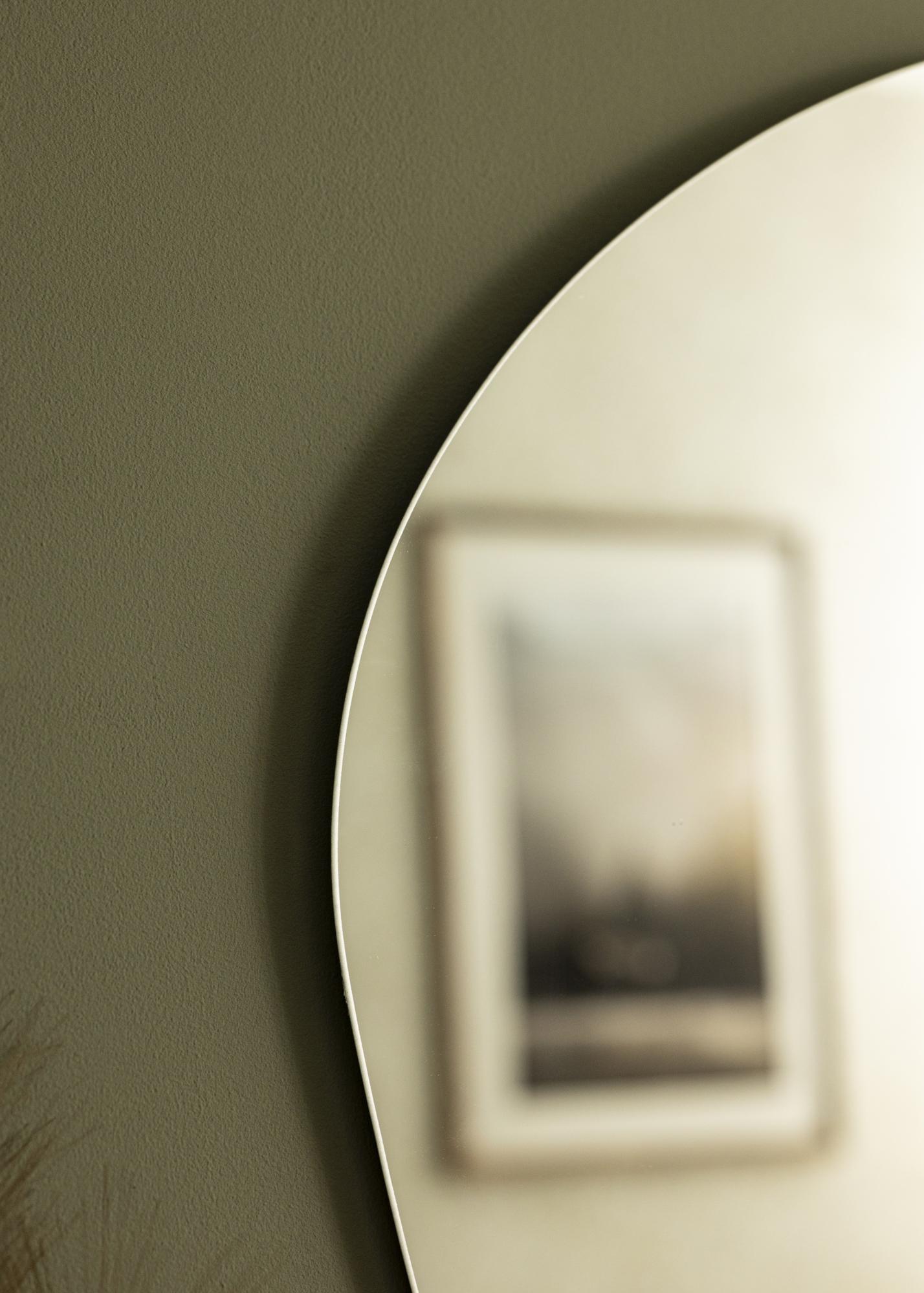 Tämä trendikäs seinäpeili on mielenkiintoinen sisustusyksityiskohta, joka heijastaa kauniisti valoa ikkunoista ja lampuista. Peili on tyyliltään sekä moderni että minimalistinen. Peilin ainutlaatuinen muoto ja kehyksetön peilipinta antavat sille sen tunnusomaisen ulkomuodon.