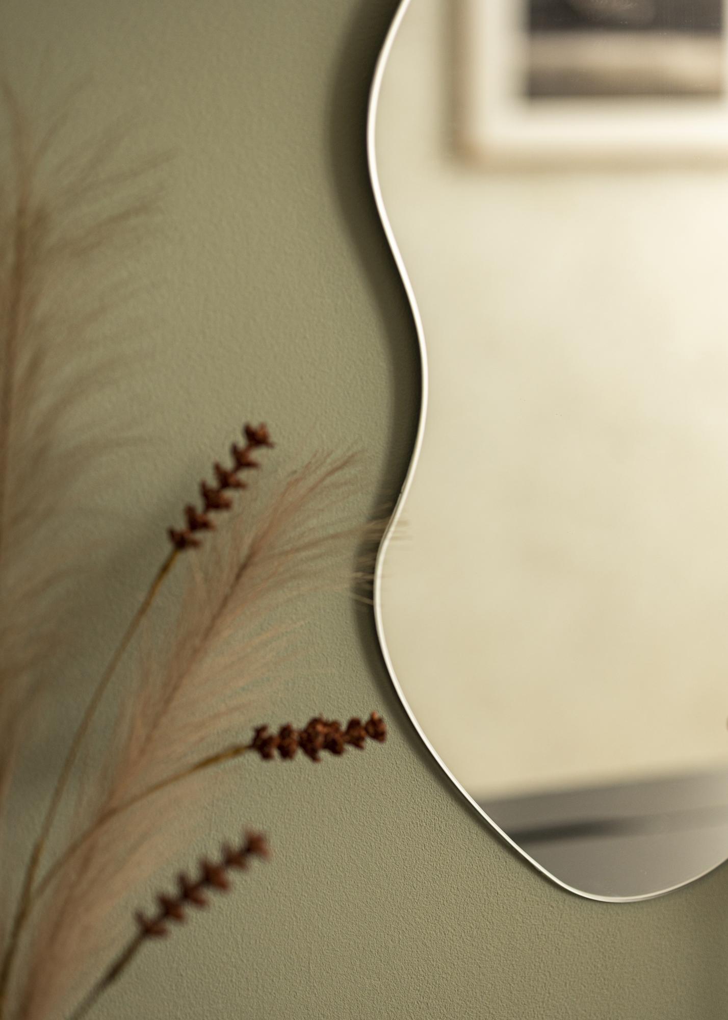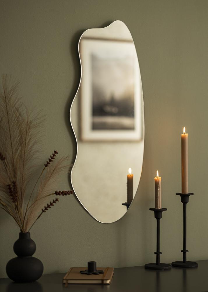 Asymmetrinen seinäpeili on huomiota herättävä sisustusyksityiskohta joka kodissa. Tällä peilillä on ainutlaatuinen muoto: yksi reuna on pyöristetty ja toisessa reunassa on aaltoileva muoto. Yhdessä ne muodostavat mielenkiintoisen ja tyylikkään kokonaisuuden. Peili sopii yhtä hyvin niin eteiseen kuin olohuoneeseenkin ja se toimii myös trendikkäänä kylpyhuoneen peilinä.