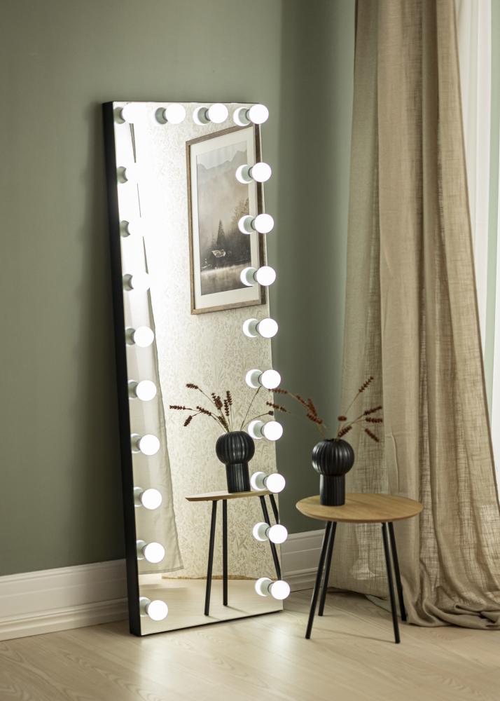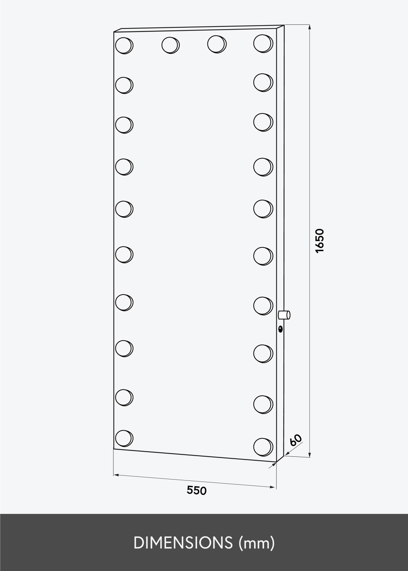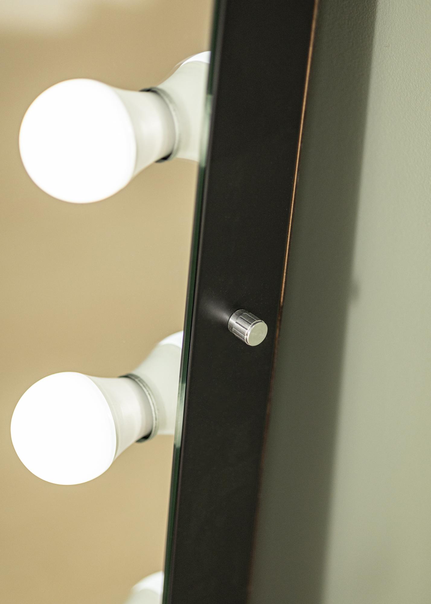 Seinäpeilissä on 22 isoa LED-lamppua, jotka kehystävät kauniisti peilipintaa ja antavat peilille hohdokkaan ilmeen täynnä glamouria. Peilin päädyssä olevasta nupista voit himmentää valonvoimakkuutta oman makusi mukaan. Peili liitetään pistorasiaan.