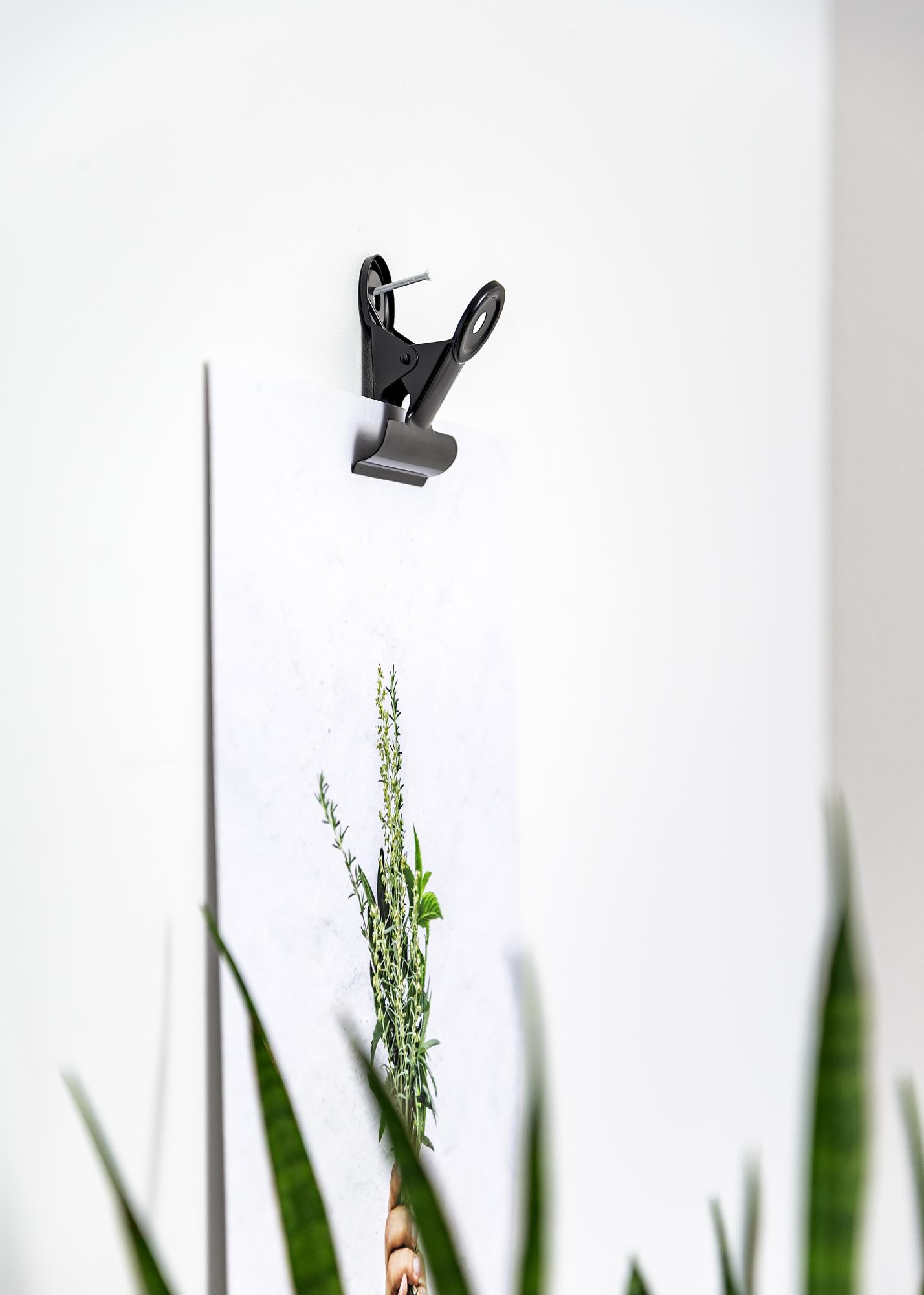 Tämä matta musta ja kätevä metallipuristin antaa julisteillesi ja printteillesi tyylikkään ja trendikkään ripustuksen. Puristimen avauksessa on tukeva ote, jonka avulla voit kiinnittää kaikista ohuemman paperin, samalla kun se myös toimii vähän paksummille motiiveille. Jos sinulla on suuri juliste jonka haluat ripustaa, niin voit ripustaa sen kahdella julisteklipsillä. Metallipuristimen muotoilu on tyylikäs ja puristimen pyöreän yläosan reiät mahdollistaa ripustuksen seinälle pienellä naulalla tai ruuvilla.