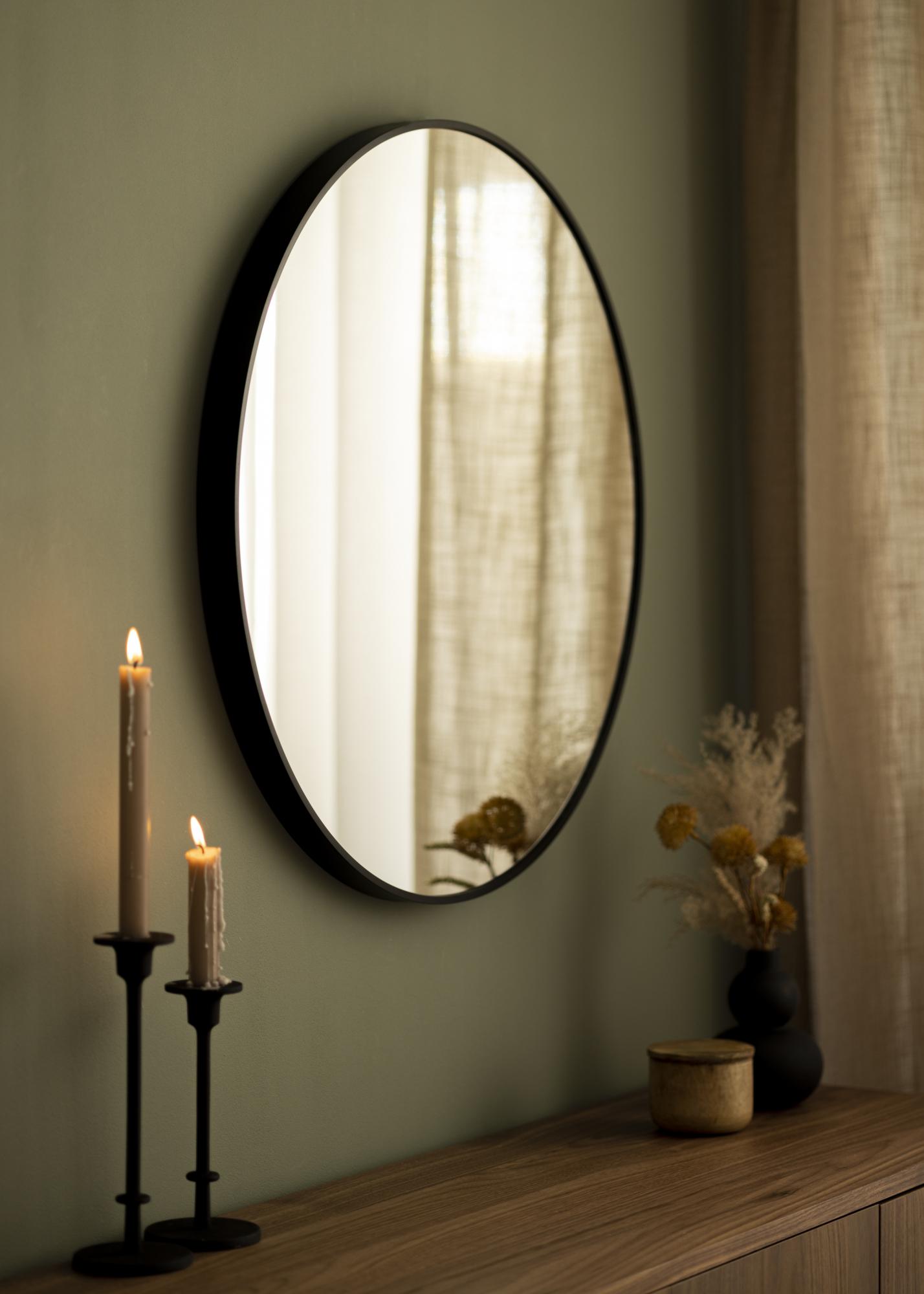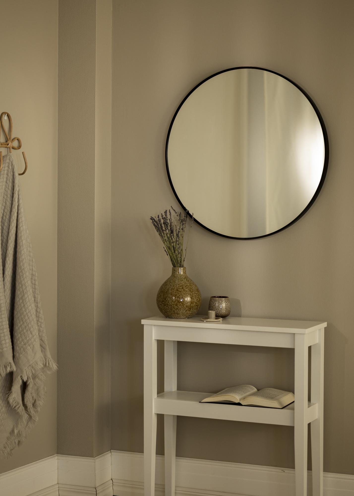 KAILA Round Mirror Edge Black on pyöreä peili, jossa on tyylikäs, ohut mattamustan värinen metallikehys tuomassa peiliin industriaalisen ja trendikkään profiilin. Kehys on - koosta riippuen - syvyydeltään 30-40 mm, minkä ansiosta peililasi tulee hieman ulospäin seinästä ja luo vaikuttavan 3D-efektin. Kehyksen syvyys luo myös peiliin aidon tunnun samalla, kun se säilyttää minimalistisen profiilinsa. Täydellinen pyöreä peili sijoitettavaksi mihin tahansa huoneeseen, jonne haluat lisätä käytännöllisyyttä ja tyylikästä ruotsalaista designia!