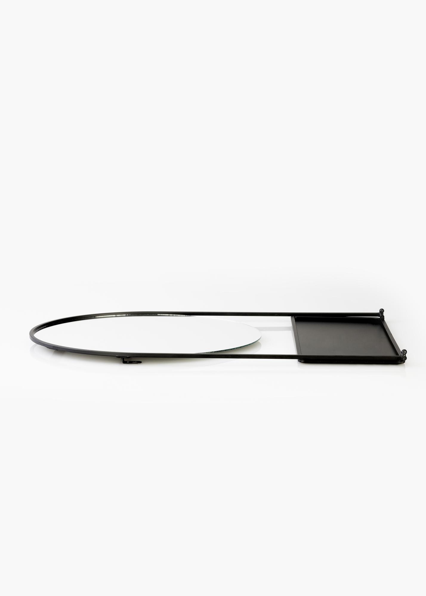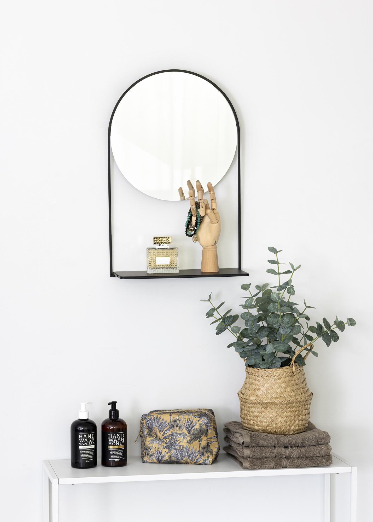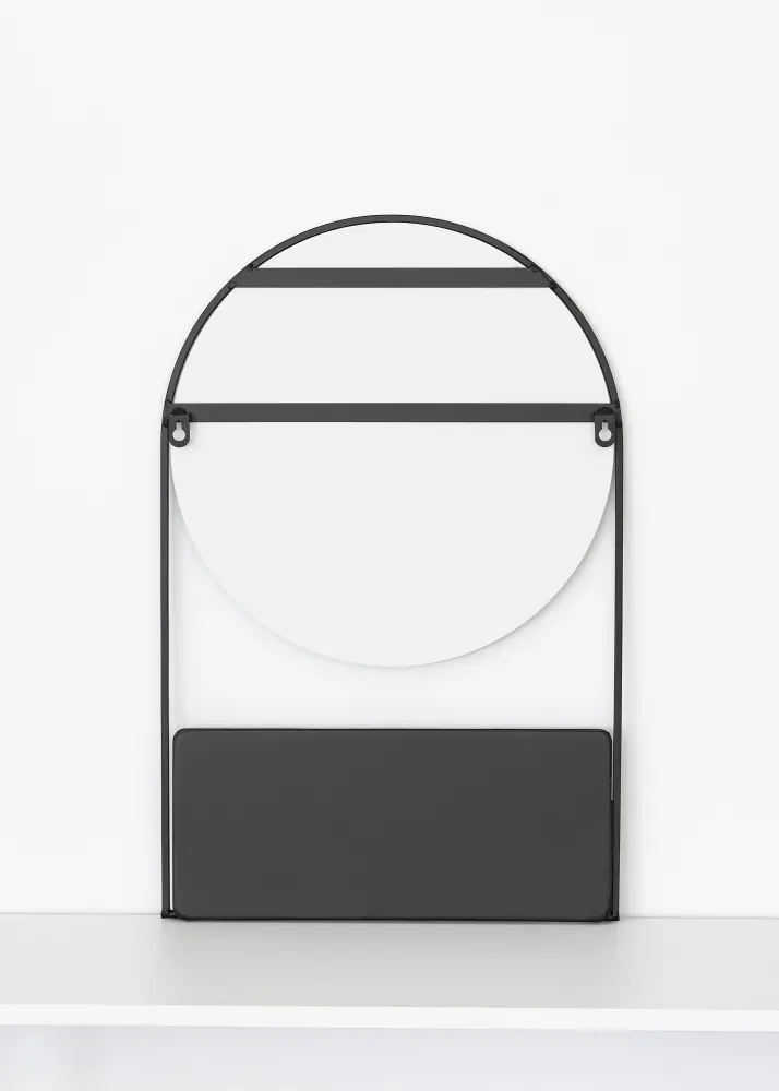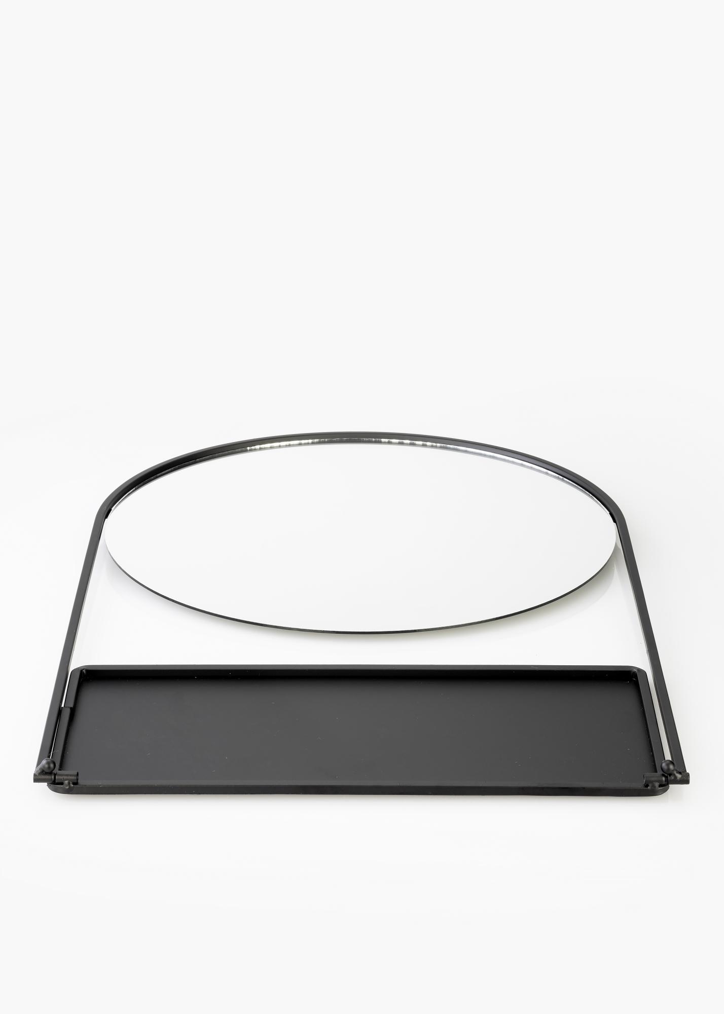 Tämä tyylikäs, hyllyllä varustettu seinäpeili kuuluu pohjoismaisen KAILA:n tuotantoon. Mustaan metallirunkoon asennetun peililasin halkaisija on 35 cm. Metallirungon alareunassa sijaitsee pieni hylly, johon voi sijoittaa kauniin koristeen tai meikkituotteita. Peilin mitat runkoineen ovat 35x55 cm ja se on varustettu seinäkiinnikkeillä.