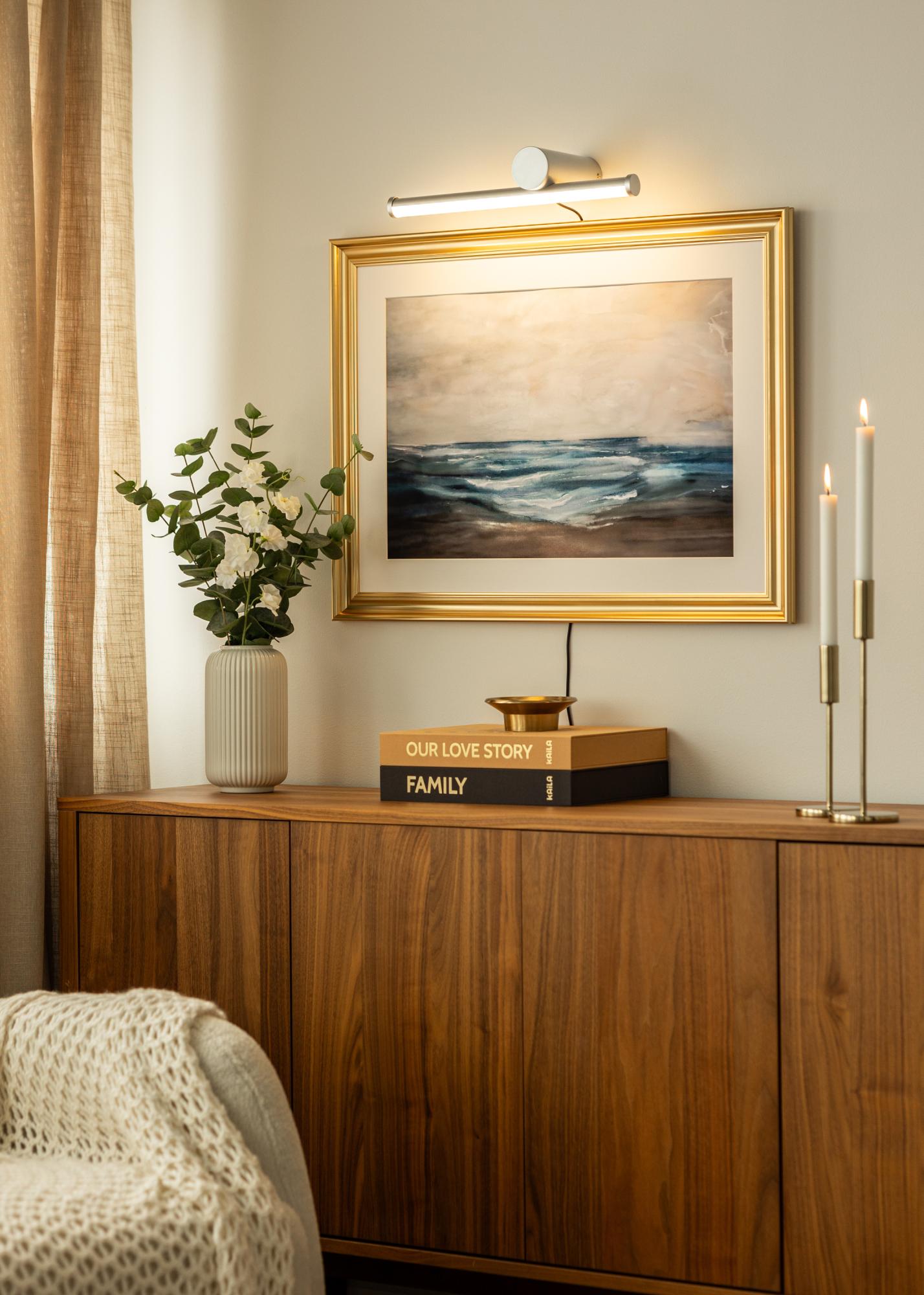 Hopeavärinen tauluvalaistus tarjoaa huomaamattoman ja tyylikkään ratkaisun korostamaan tauluja tai taideteoksia. Sen kapea muotoilu ja 40 cm pituus sulautuvat helposti kaikkiin sisustuksiin ja tarjoavat tasaisen ja miellyttävän valaistuksen. Sen 15,3 cm syvyys sopii täydellisesti kuvan yläpuolelle ilman, että se vie liikaa tilaa seinällä.
