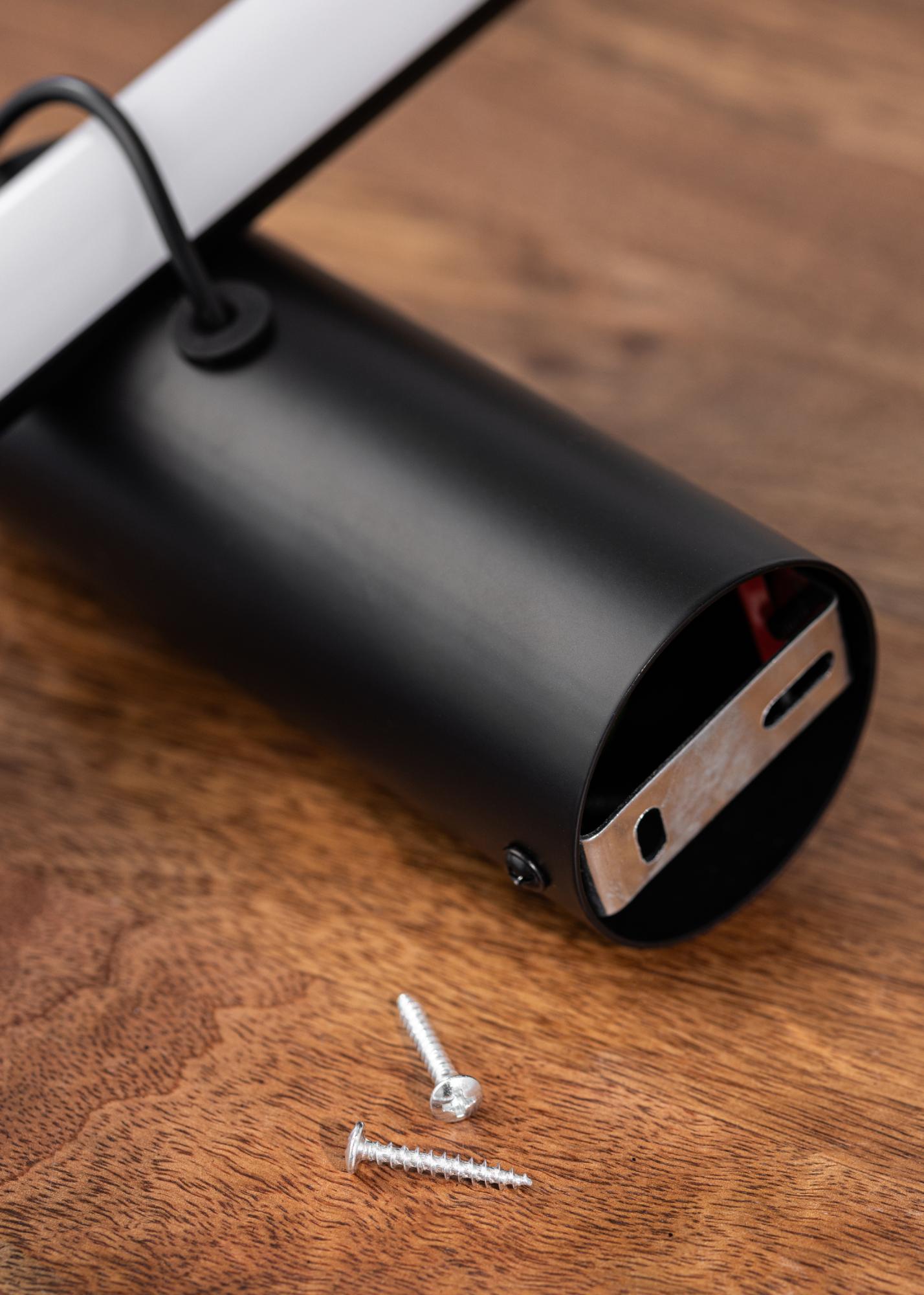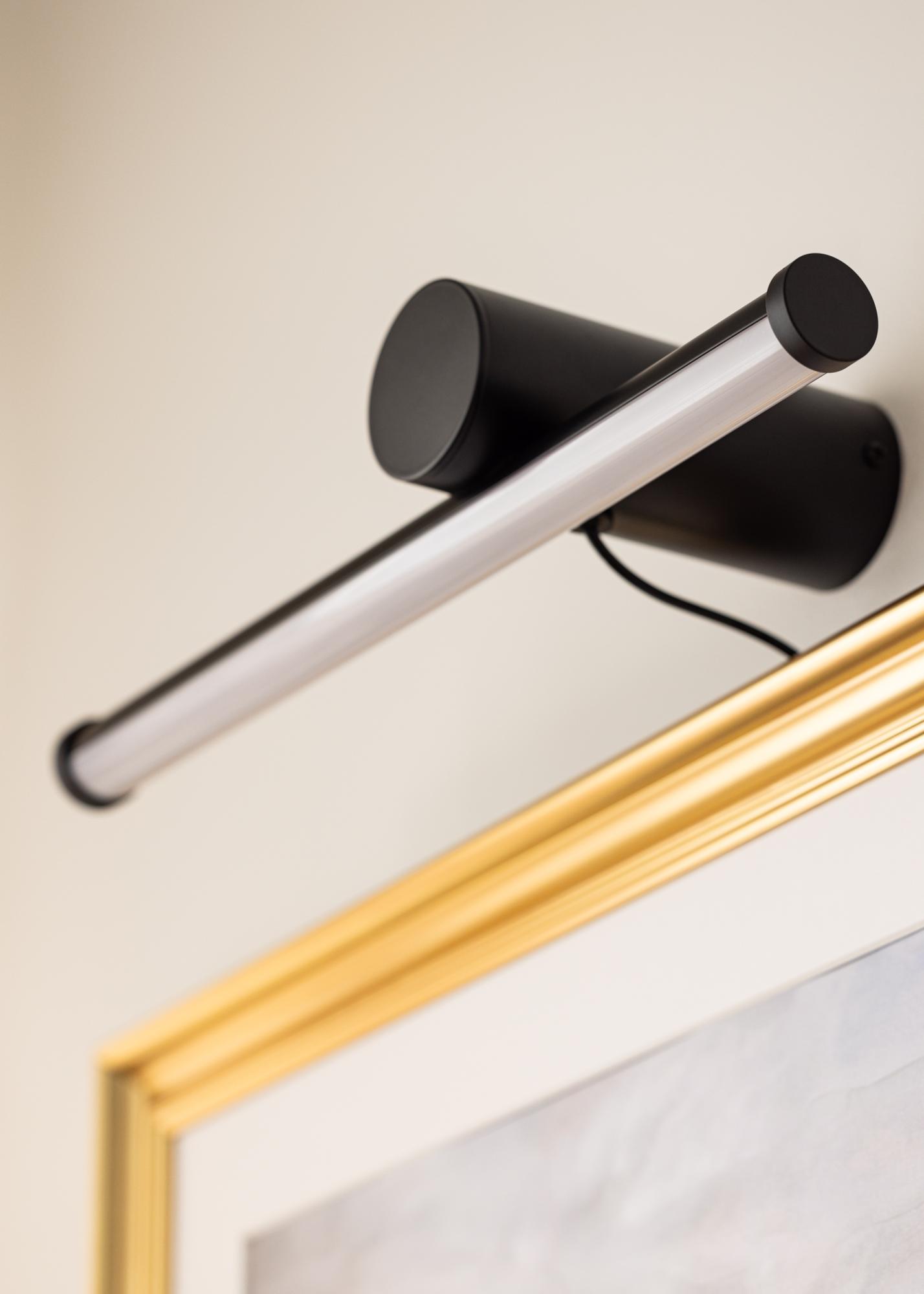 Musta tauluvalaistus tarjoaa tyylikkään ja modernin ratkaisun taideteosten tai valokuvien valaisemiseen. Sen pituus on 40 cm ja syvyys 15,3 cm, mikä tekee siitä huomaamattoman ja käytännöllisen valinnan, joka antaa pehmeän ja tasaisen valon jopa 80 cm leveille taideteoksille.