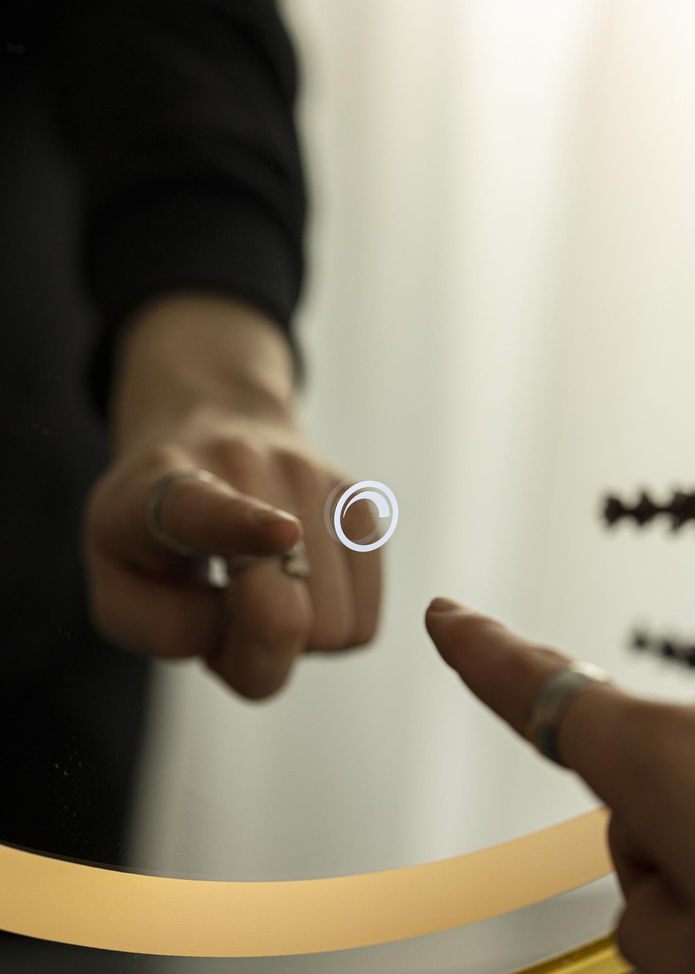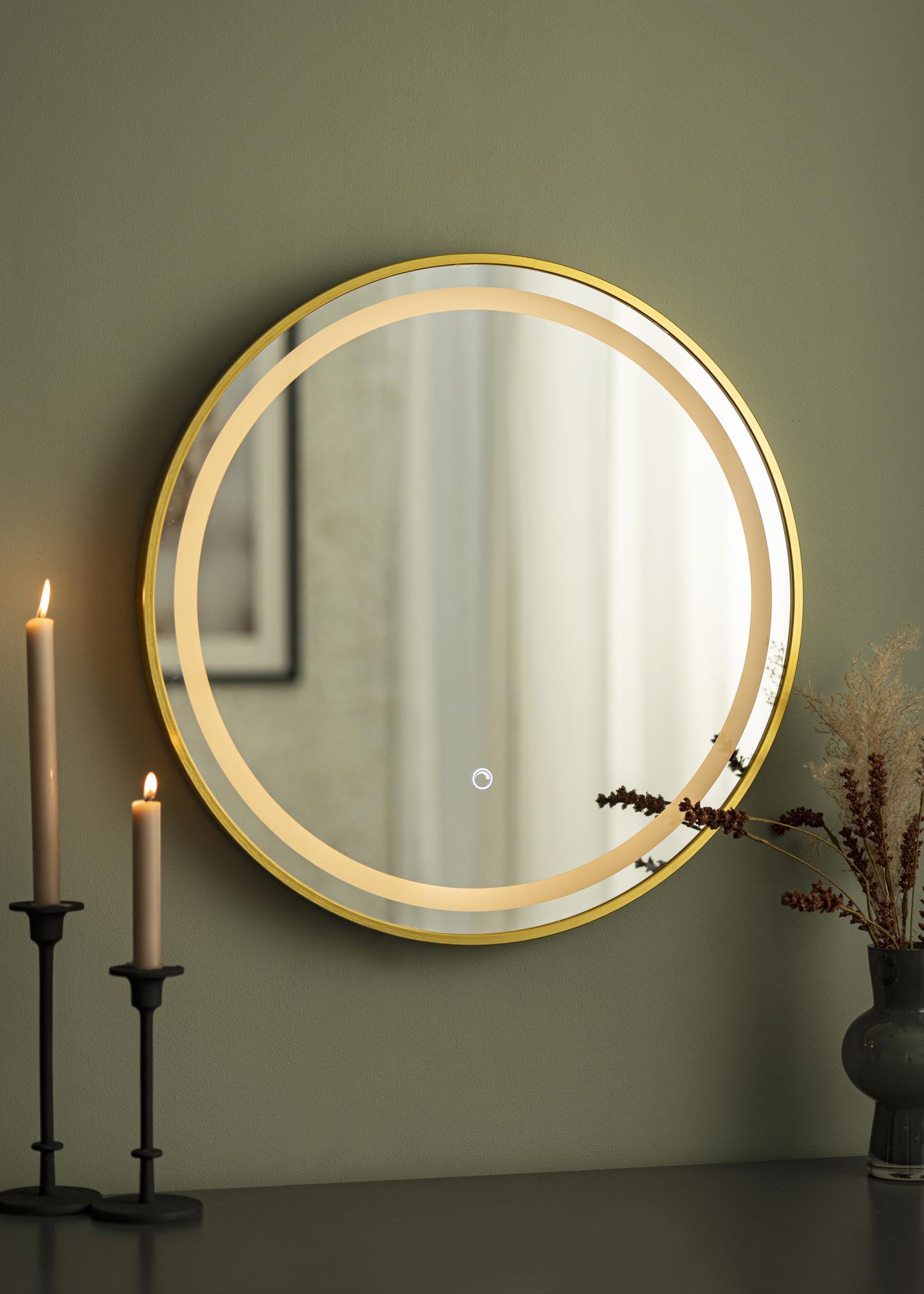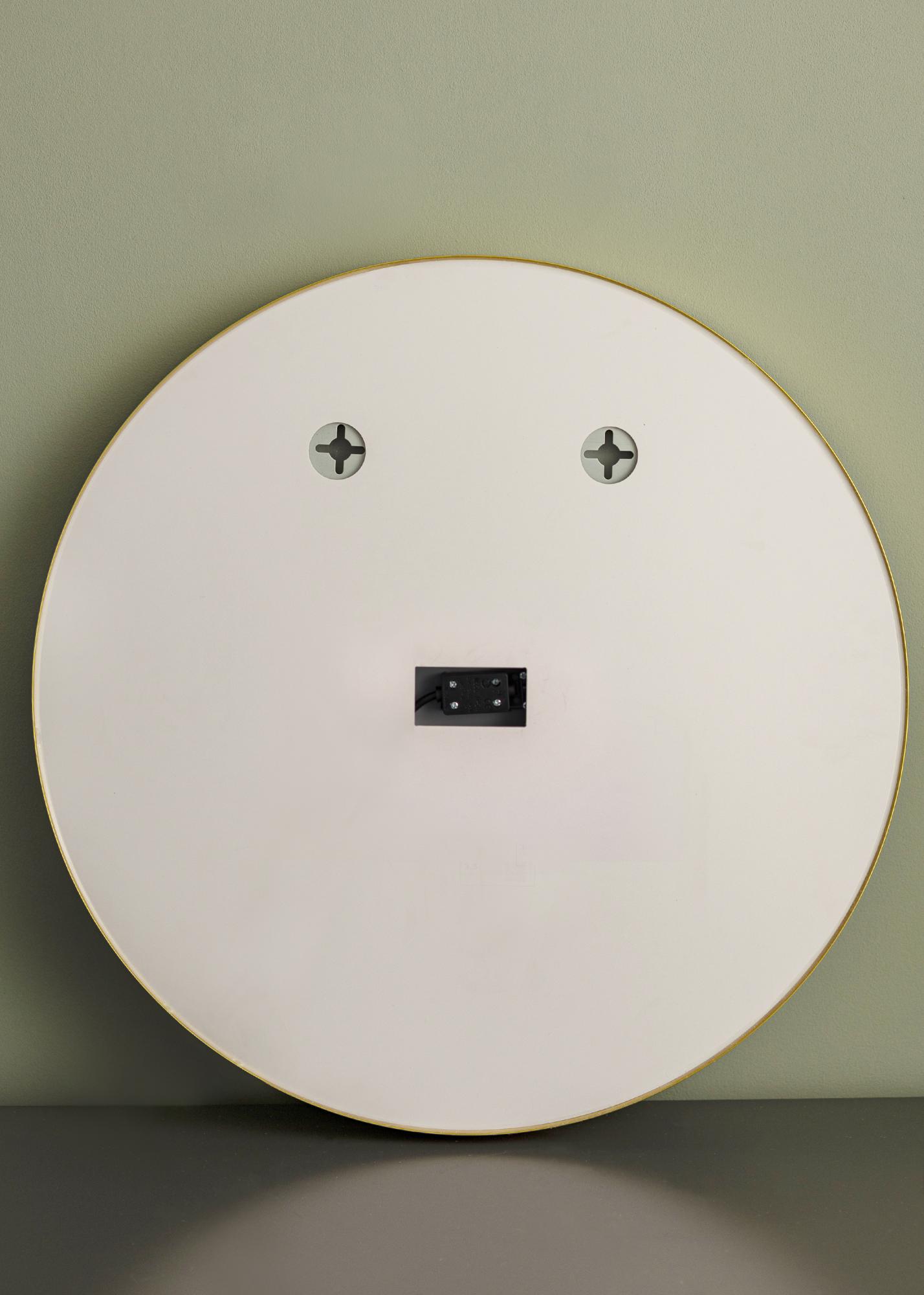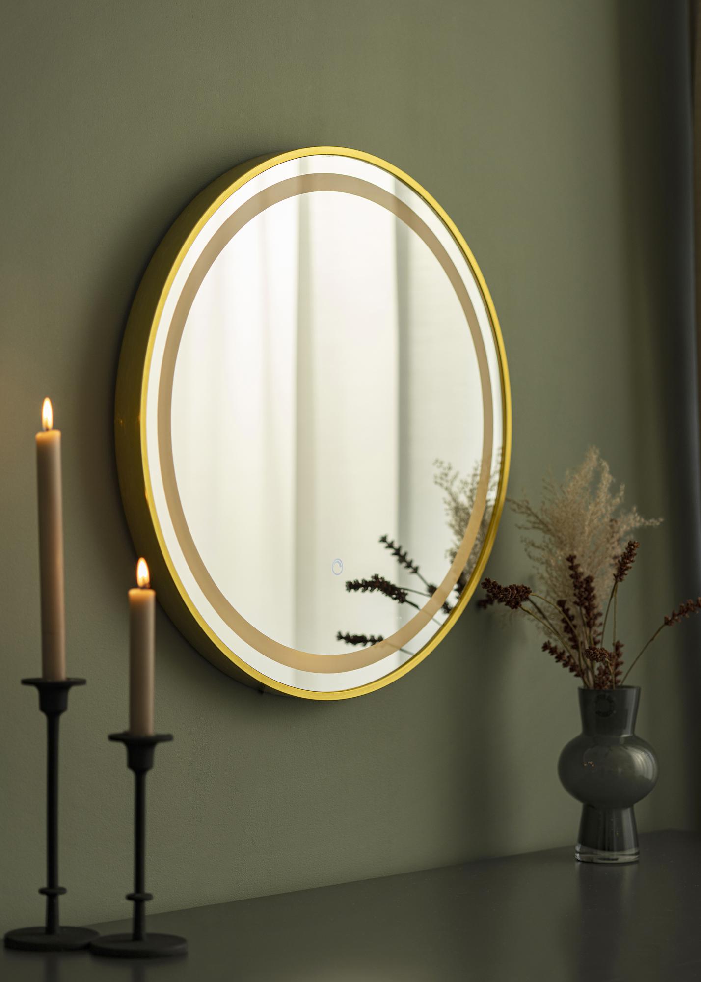 Tässä pyöreässä kylpyhuoneen peilissä on LED-valaistus ja elegantti, messinkisävyinen kehys. Peilin halkaisija on 60 cm. Peilin reunaa kehystävä integroitu LED-valaistus luo lämpimän, 3000 K valkoisen valon. Valon voimakkuutta voi säätää painamalla kosketusnäppäintä muutaman sekunnin ajan. Peilissä on viimeisimmän valosäädön muistitoiminto. LED on energiaa säästävä valonlähde, joka luo tasaisen ja luonnollisen valon. Peili on tarkoitettu kiinteään sähköverkkoasennukseen ja liitettäväksi valokatkaisimeen. Jotta peili toimisi oikein, tulee se yhdistää tavalliseen sähkökatkaisijaan, ei himmentimeen.