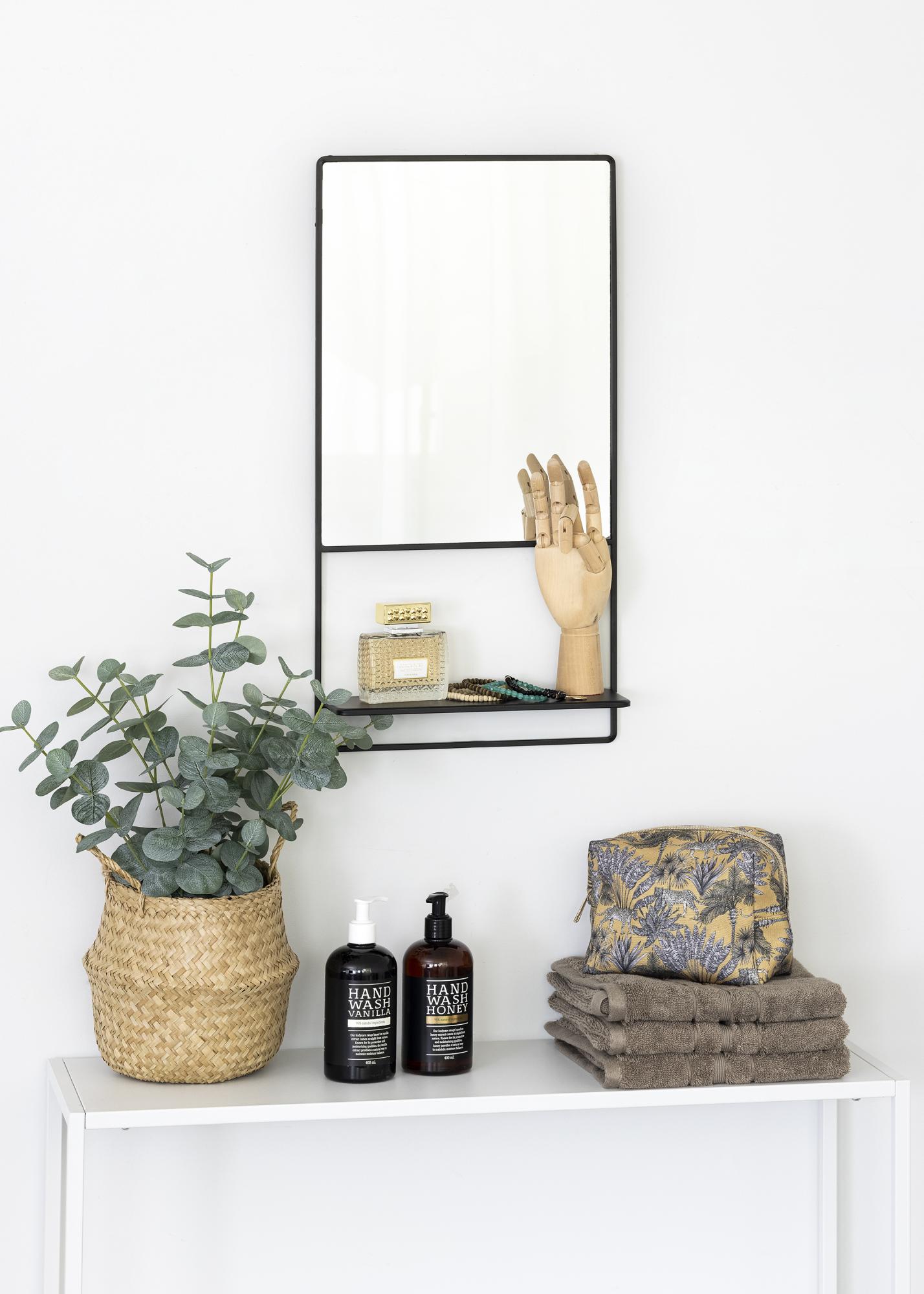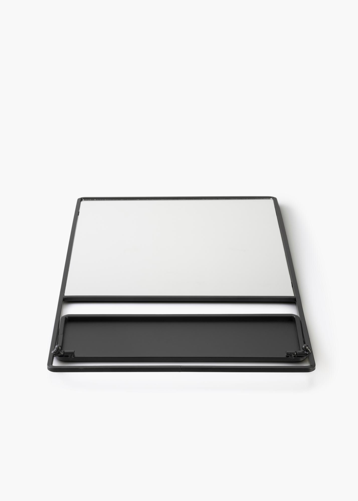 Tämä tyylikäs, hyllyllä varustettu seinäpeili kuuluu pohjoismaisen KAILA:n tuotantoon. Peilin mustasävyinen runko on metallia ja siihen on asennettu suorakulmainen peililasi. Rungon alaosassa on pieni hylly, johon voit sijoittaa pienen koriste-esineen tai meikkitarvikkeita. Peilin mitat ovat 31x60 cm ja se on varustettu seinäkiinnikkeillä.