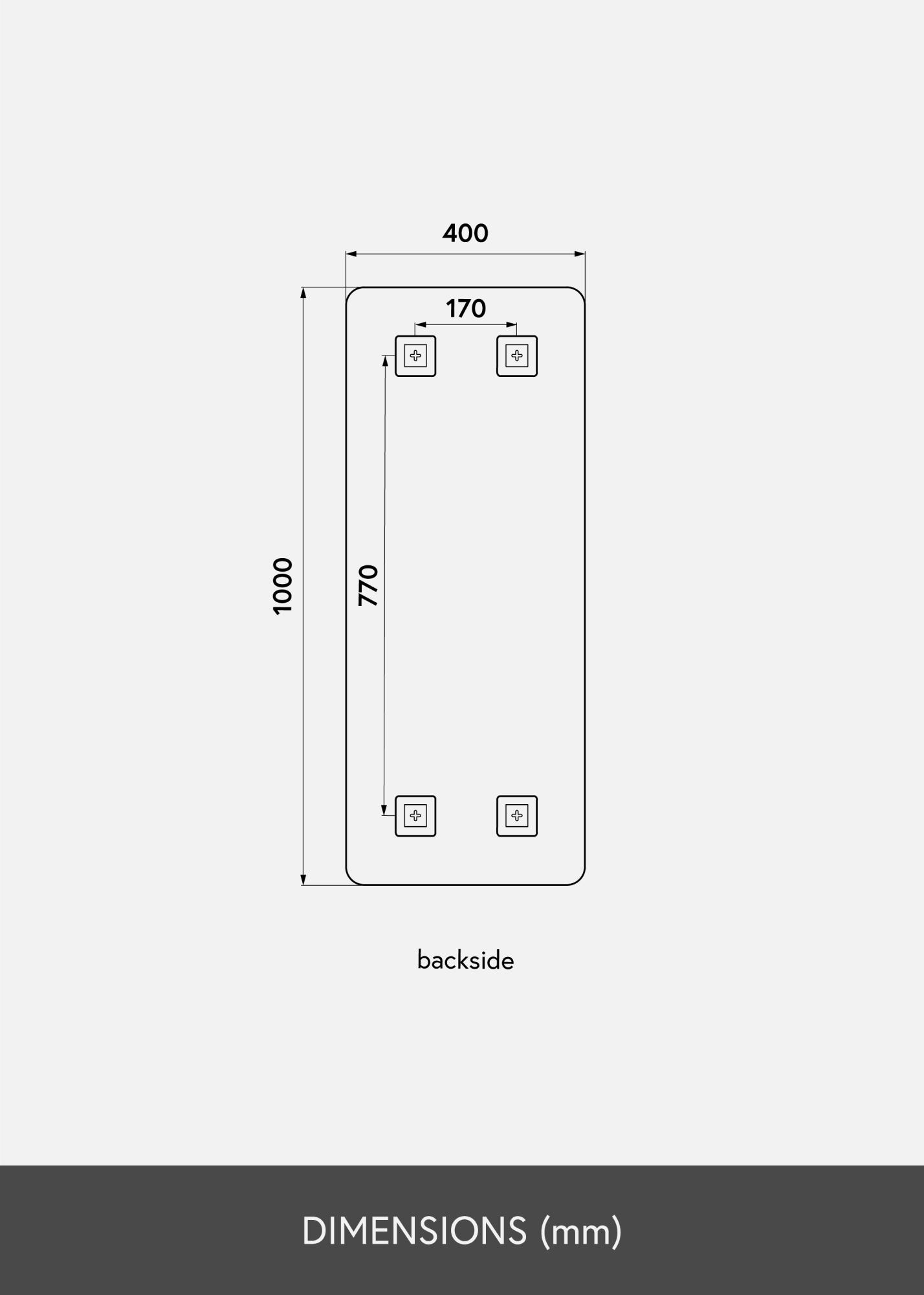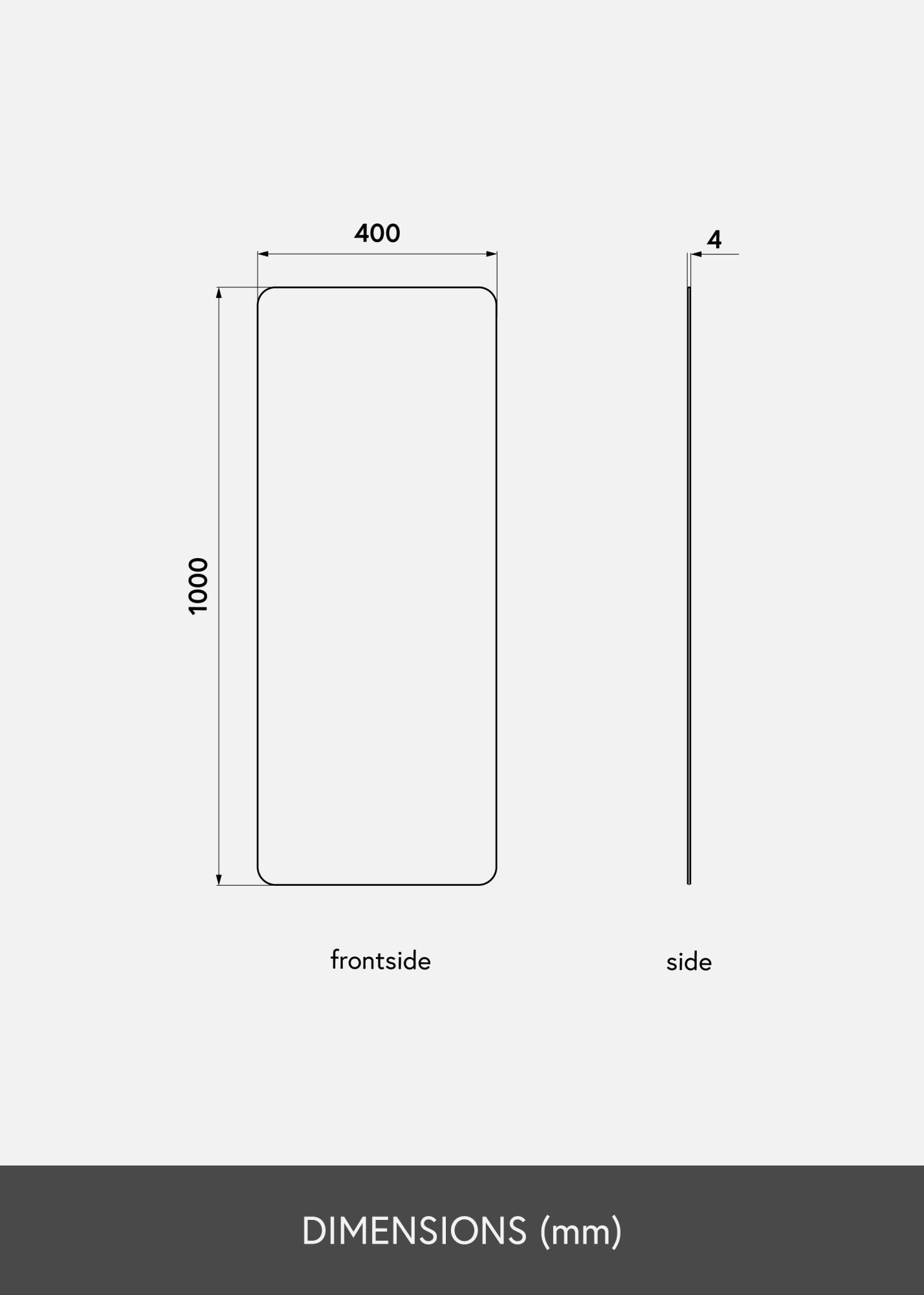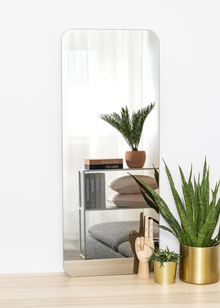 Tässä suorakulmaisessa peilissä on koristeelliset, pyöristetyt kulmat, jotka pehmentävät kokonaisvaikutelmaa ja lisäävät peiliin eleganssin tuntua. Peili on ainoastaan 4 mm paksu eikä siinä ole lainkaan kehystä, mikä luo siihen tyylikkään minimalistisen profiilin.