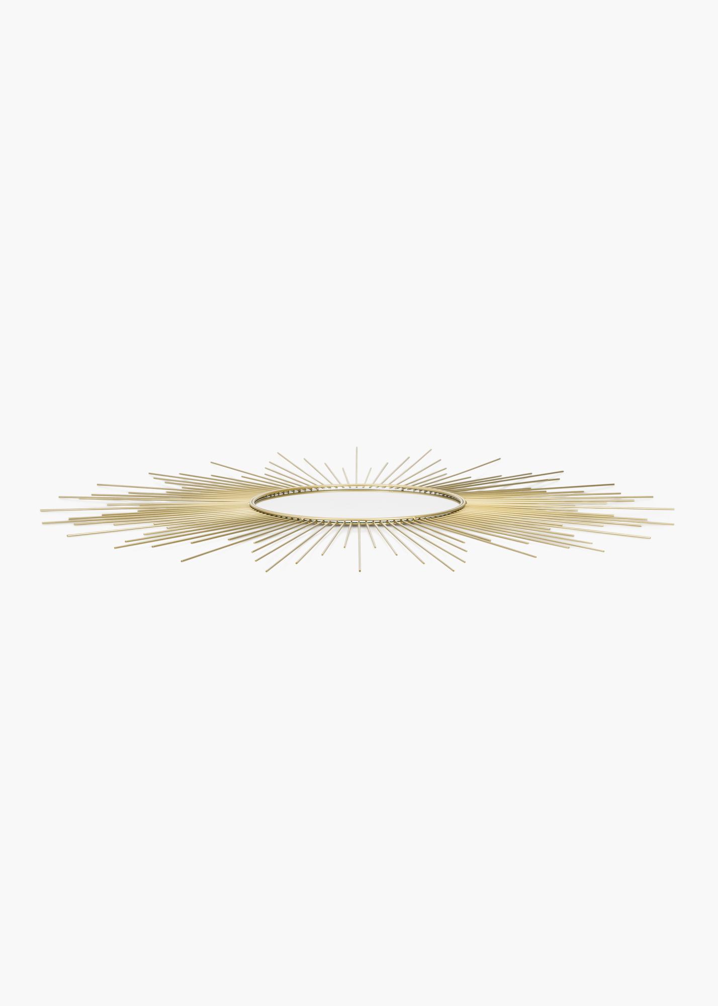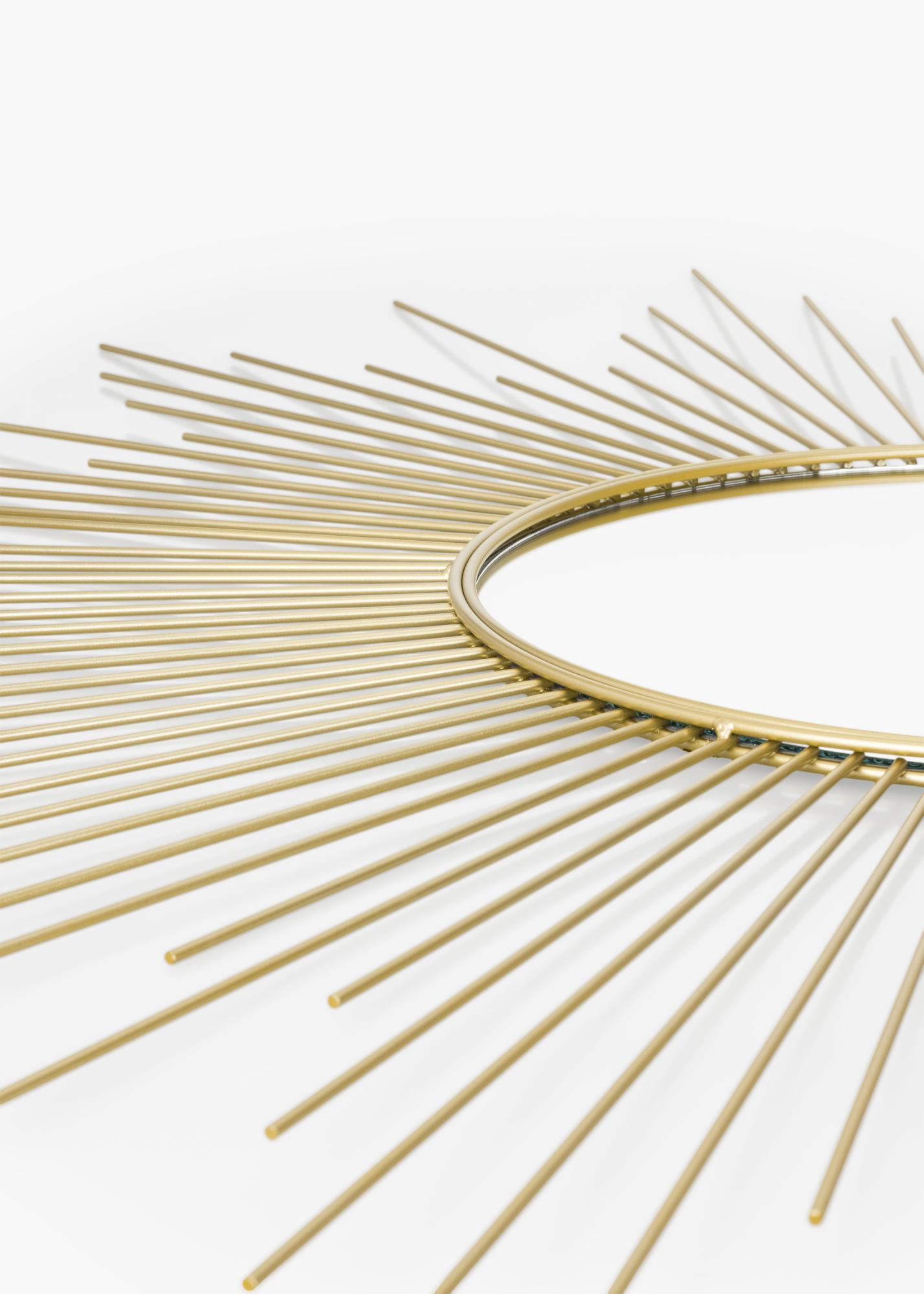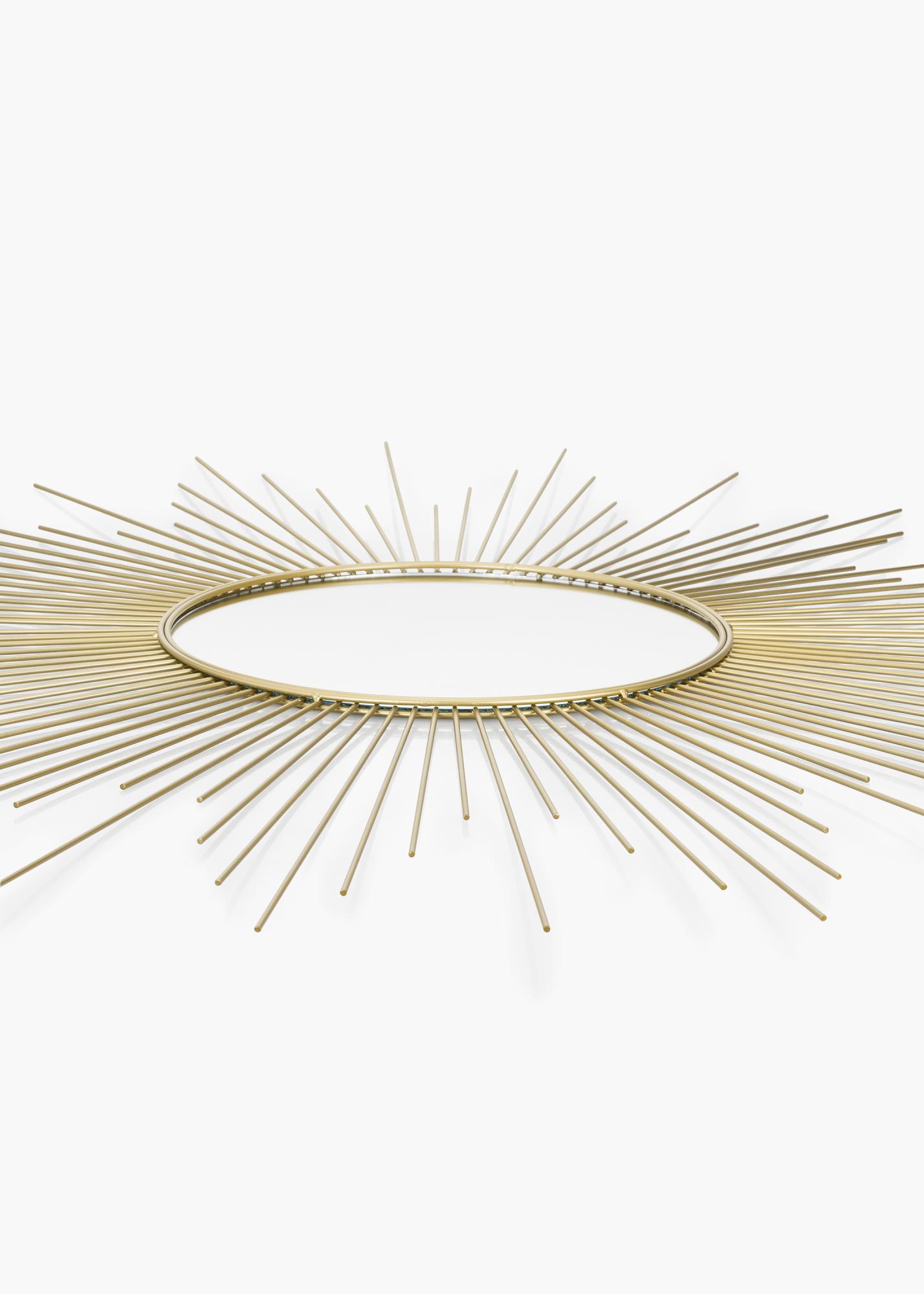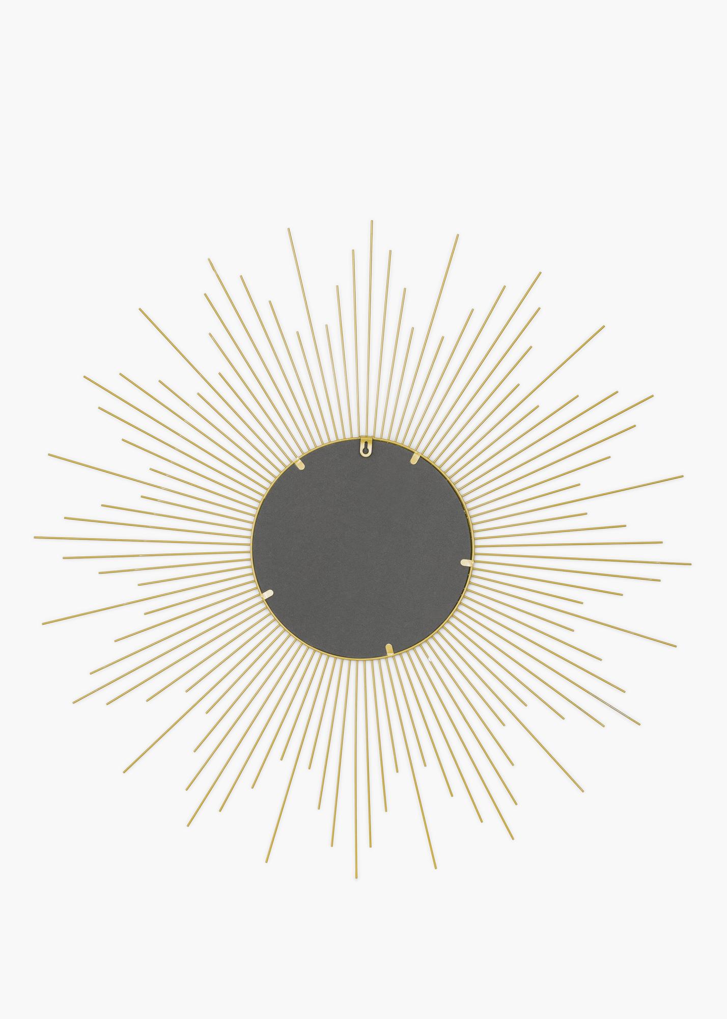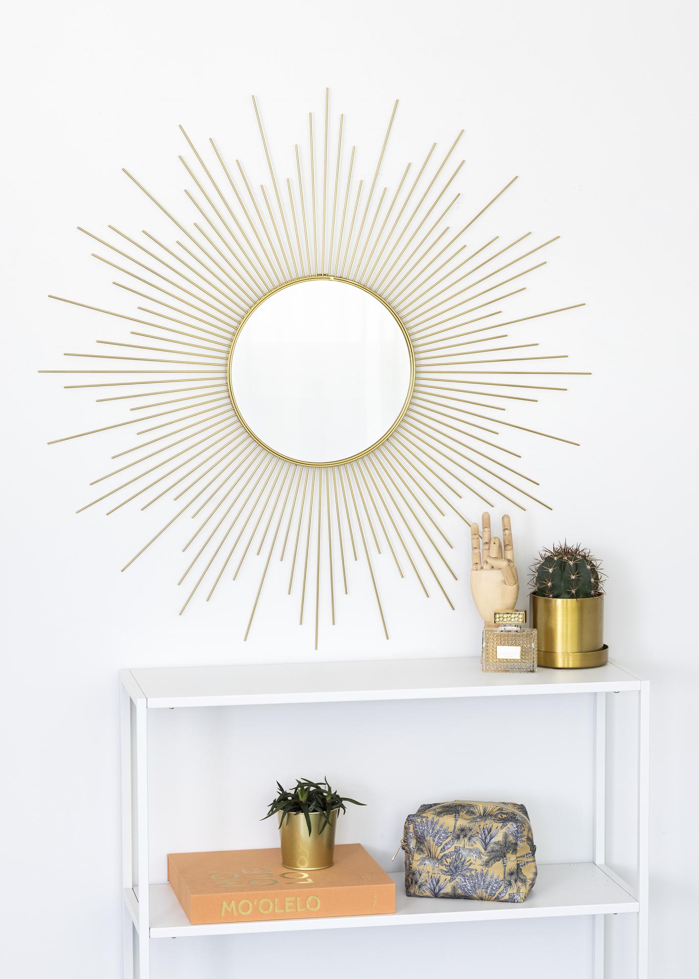 Tässä pyöreässä seinäpeilissä on hyvin dekoratiivinen muotoilu. Peililasia reunustaa tähteä muistuttava, kultasävyinen koristelu. Sijoita peili paikkaan, jossa se pääsee oikeuksiinsa ja huomion keskipisteeksi. Peilin ulkomitat ovat 90x90 cm ja siinä on metallirunko.