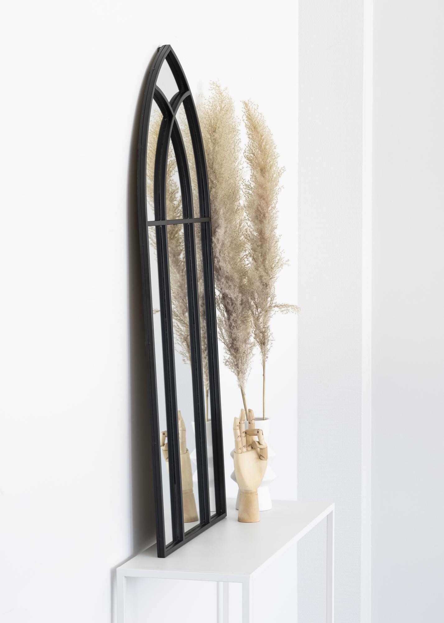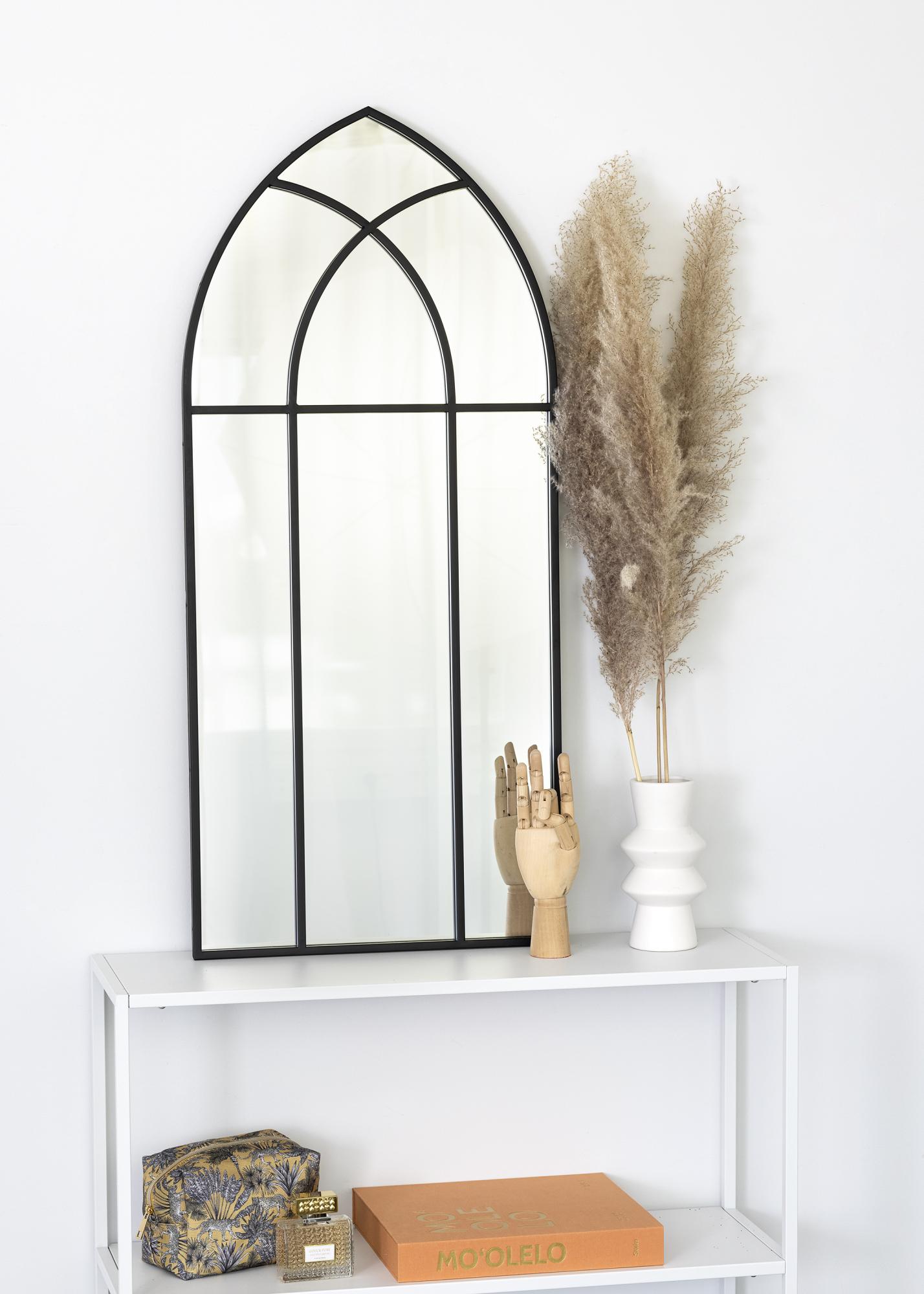 Tämä on hyvin koristeellinen peili, joka luo huoneeseen romanttisen ilmapiirin. Peilin muoto muistuttaa vanhaa goottilaistyylistä ikkunaa ja se tulee varmasti kiinnittämään kaikkien huomiota. Peilin mitat ovat 45x100 cm ja sitä koristavat mustat, ohuet metallireunaiset ”ikkunaruudut”.