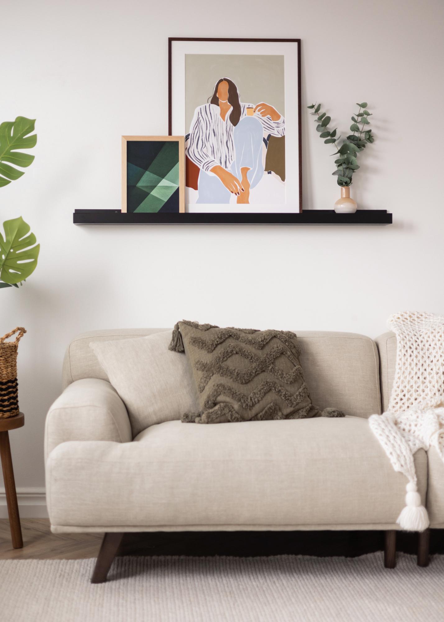 Esittele ja vaihtele seinätaidettasi helposti ja tyylikkäästi elegantilla tauluhyllyllä! Tämä tauluhylly on valmistettu MDF:stä ja on trendikkäästi mustaksi maalattu kauniilla, puolikiiltävällä pinnalla. Tauluhyllyssä on tyylikäs muotoilu suorilla, yksinkertaisilla linjoilla ja minimalistisella tunnelmalla. Hyllytaso on jyrsitty uralla keskellä, joka toimii tukena tauluillesi ja antaa niille tyylikkään kulman, kun ne nojaavat seinään.