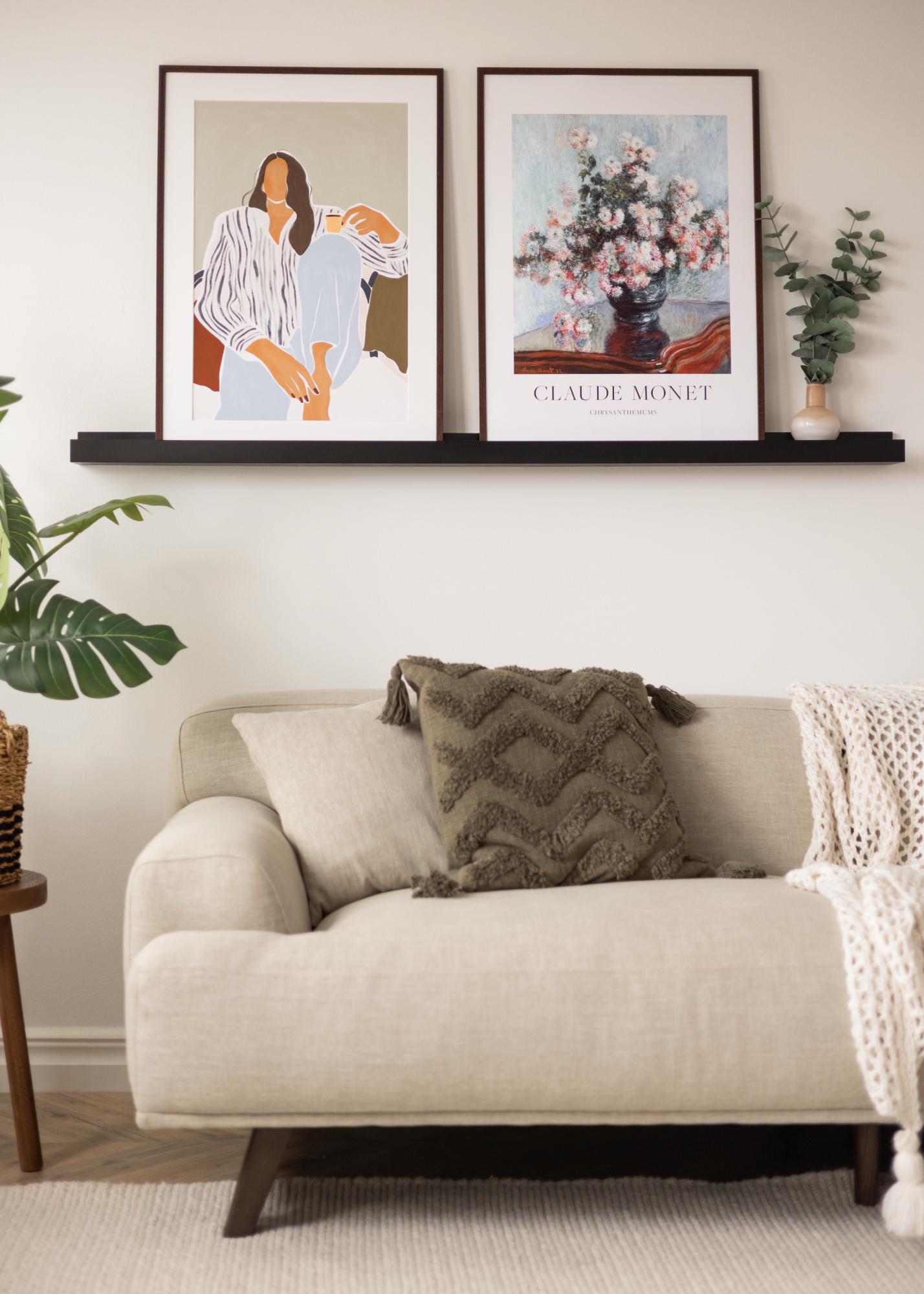 Näytä ja vaihtele seinätaidettasi helposti ja tyylikkäästi elegantilla tauluhyllyllä! Tämä tauluhylly on valmistettu MDF:stä ja trendikkäästi mustaksi maalattu hienolla, puolikiiltävällä pinnalla. Taululistalla on tyylikäs muotoilu, jossa on suorat, yksinkertaiset linjat ja minimalistinen tunnelma. Hyllytasossa on uritettu kolo keskellä, joka toimii tukena tauluillesi ja antaa niille tyylikkään kulman niiden nojatessa seinää vasten.