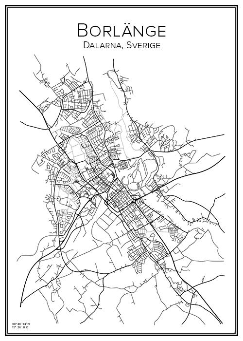Juliste tyylikkäällä Taalainmaan tieverkolla, joka näyttää Borlängen kunnan suurimman taajaman. Kaupunki, joka kasvoi rautateiden ja teollisuuden ympäröimänä 1800-luvun lopussa, ei koskaan saanut yhtenäistä kaupunkikaavaa ja on tänä päivänä jaettu kaupungin läpi kulkevin moottoritein. Kartta on minimalistinen graafinen painokuva, jonka voi mainiosti kehystää mustiin taulukehyksiin tai valkoisiin kehyksiin, jotka korostavat aihetta, mutta kuva sopii kaikentyyppisiin kehyksiin.