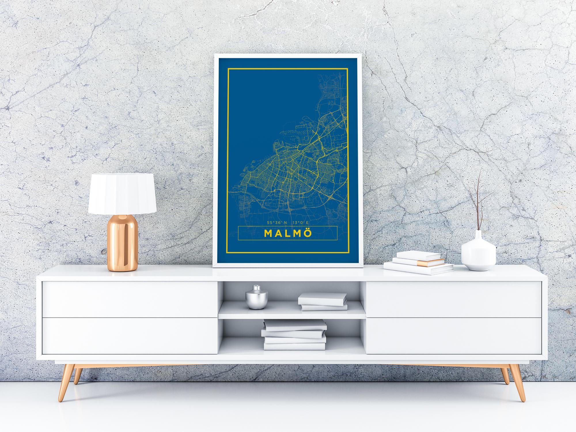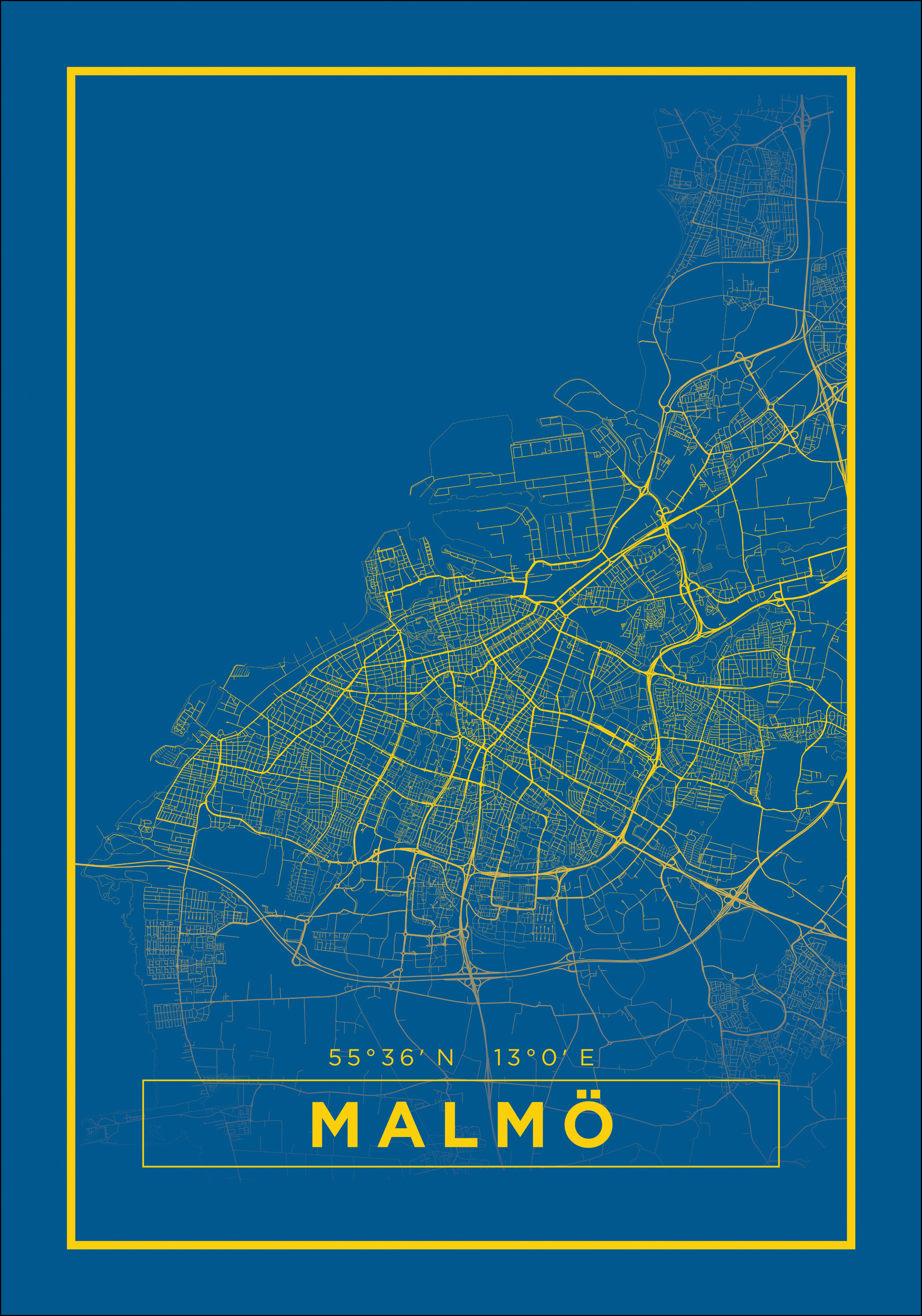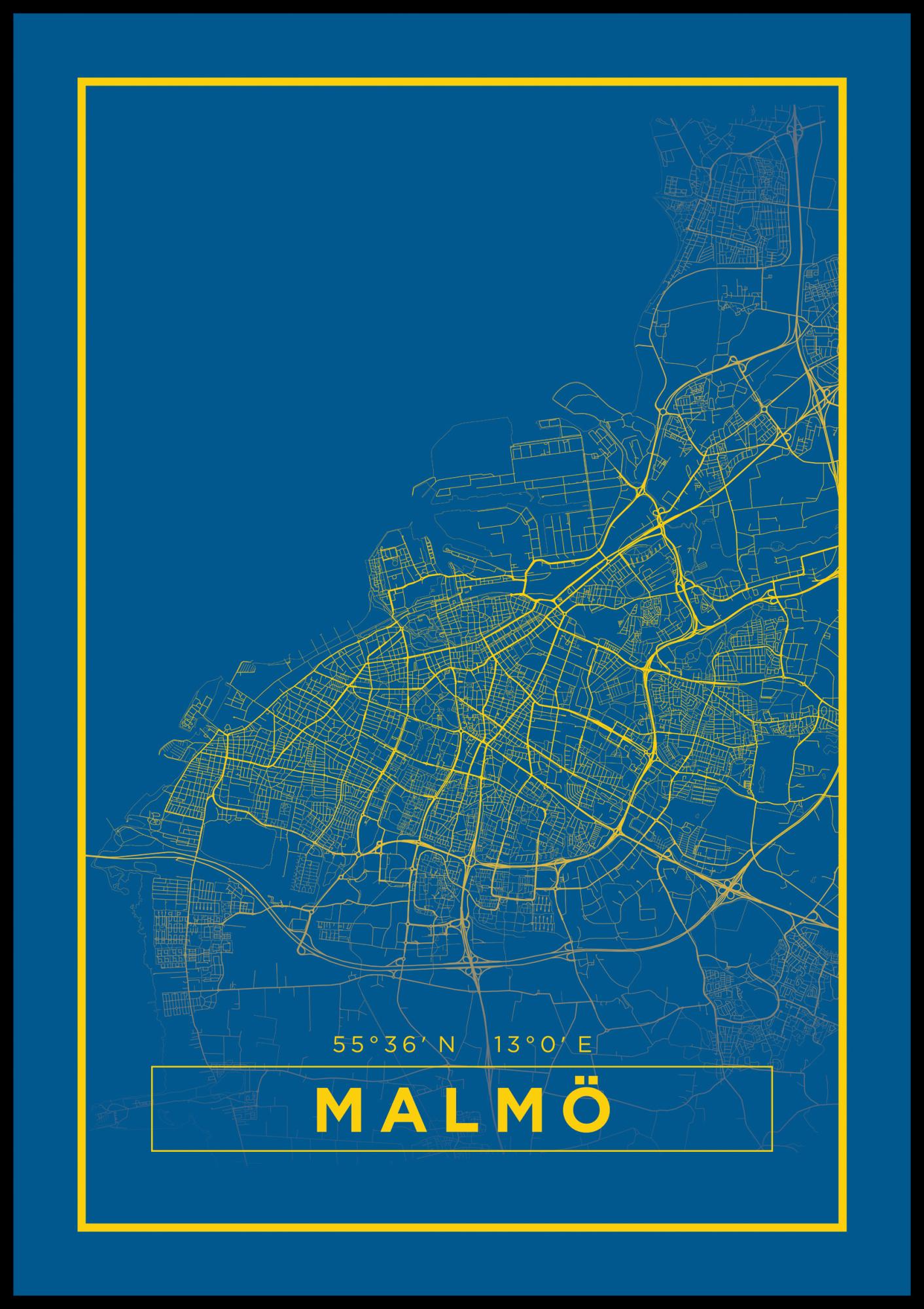 Juhli Malmön kaupunkia aivan upealla kartalla kaupingista! Tämä juliste on sininen keltaisella kuviolla joka sisältää tekstin "Malmö" sekä kaupungin koordinaatit. Julisteen sini-keltainen kuvio sopii mainiosti yhteen valkoisen kehyksen kanssa. Koska juliste löytyy useassa eri koossa löydät helposti täydellisten julisteen työpöydälle tai seinälle.