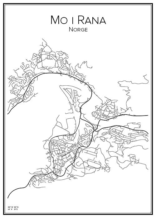 Juliste tyylikkäästä Mo i Ranan kaupungin kartasta. Paikkakunta on Arctic Circle Raceway-kilpailun koti ja siellä sijaitsee Norjan suurin kilparata. Kartan graafisesti tyylitelty ulkomuoto tekee julisteesta sopivan kaikkiin tiloihin ja helpon yhdistää ympäröivään sisustukseen ja huonekaluihin taulukehyksillä täydennettynä. Taulu on jopa hieno lahja henkilölle, jolla on siteitä kaupunkiin tai on kiinnostunut moottoriurheilusta.