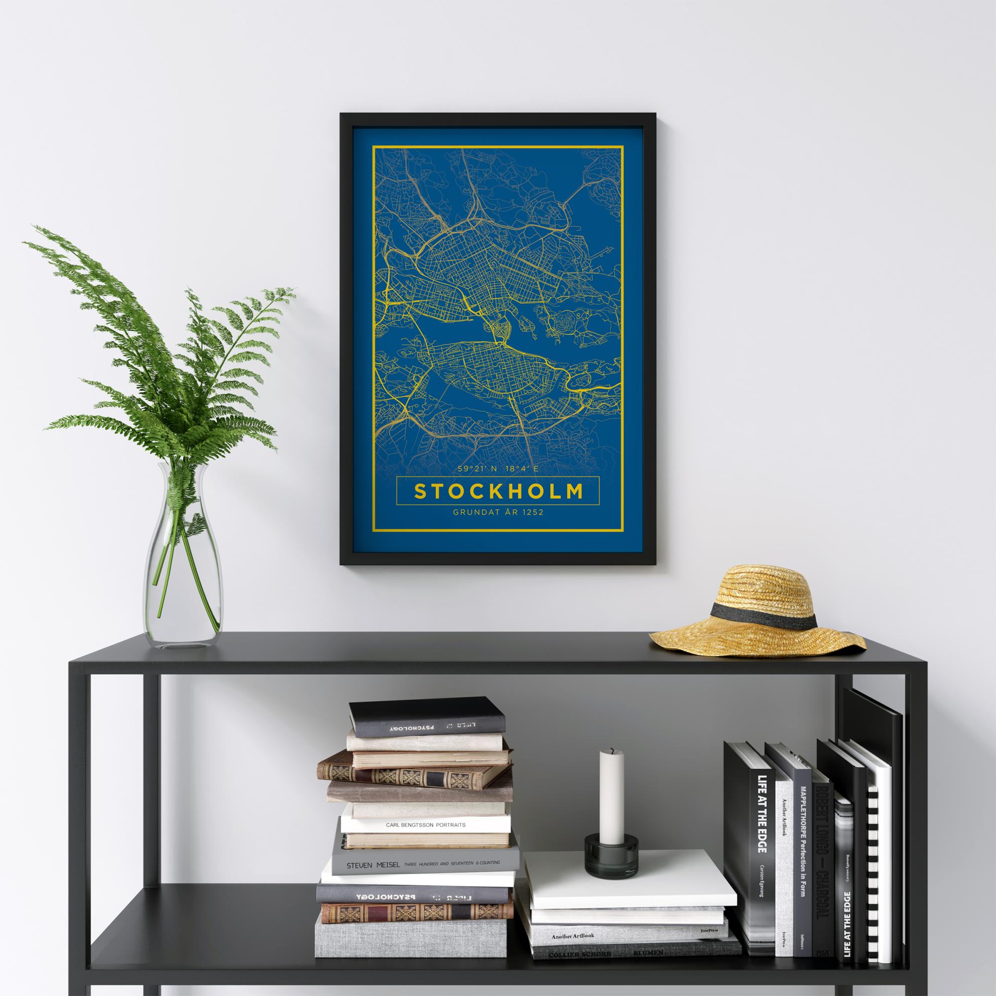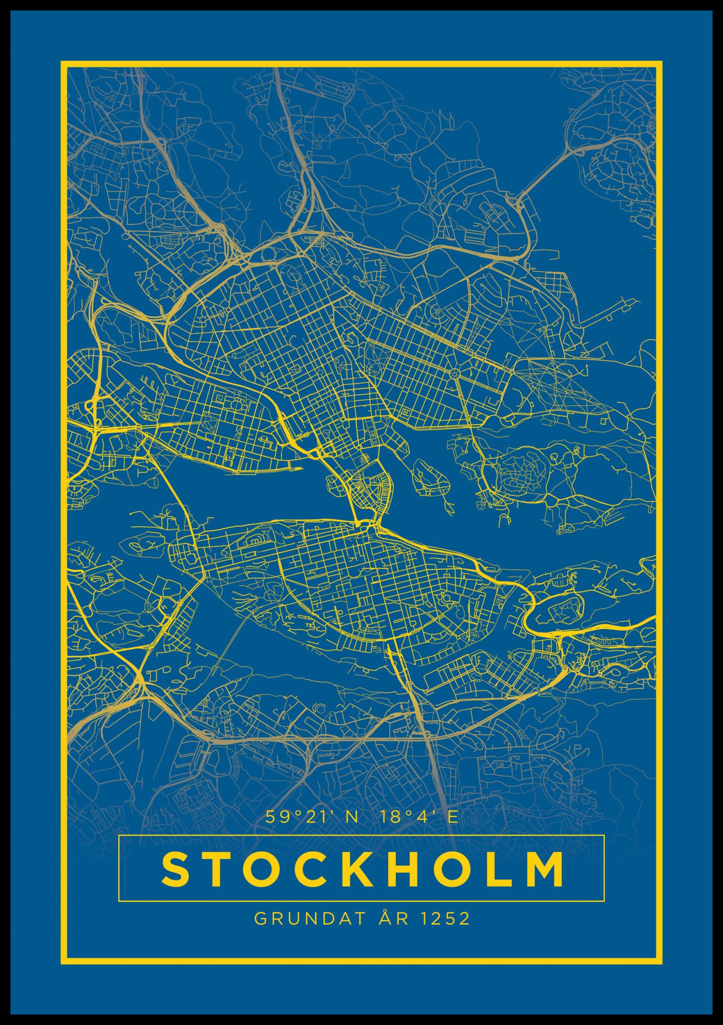 Ripusta kaunis Tukholma-kartta seinällesi ja unelmoi kauniista kaupungista joka päivä! Kuva koostuu keltaisesta kaupunkikartasta sinisellä taustalla. Kartan alta löydät tekstin joka tarkoittaa "Tukholma, perustettu 1252" yhdistettynä koordinaatteihin. Kaupungin nimen ympäröi keltaiset viivat. Valitse eri kokojen joukosta! Täydennä kauniilla kehyksellä laajasta valikoimastamme.