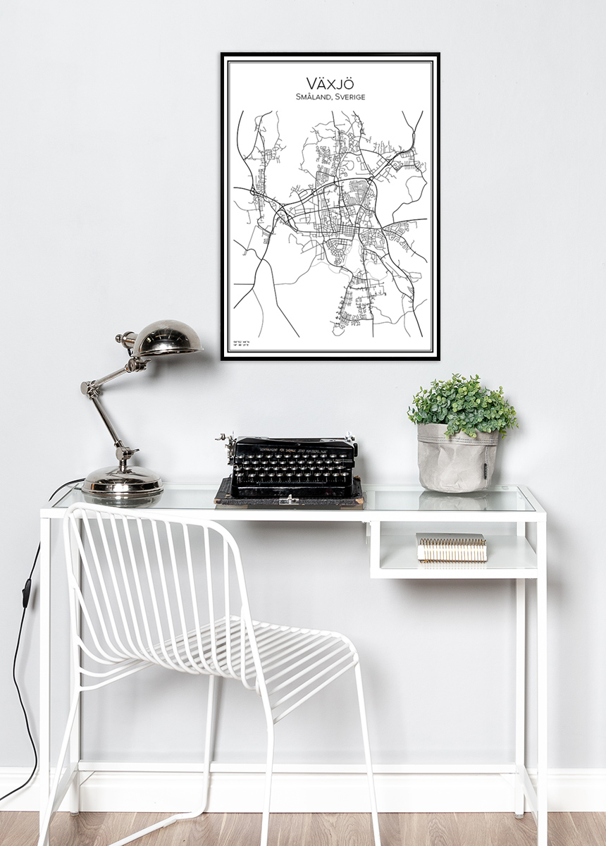 Mustavalkoinen juliste Ruotsin vihreimmän kaupungin, Vaxsjön tieverkostosta. Tyylitellyt kadut ja minimalistinen graafinen painatus tuovat silmänräpäyksessä kuvan järvien keskellä olevasta kaupungista. Juliste sopii hyvin kaikenlaisiin tiloihin. Luo tyylikäs taulu yhdistämällä juliste kauniisiin, muuhun sisustukseen sopiviin kuvakehyksiin.