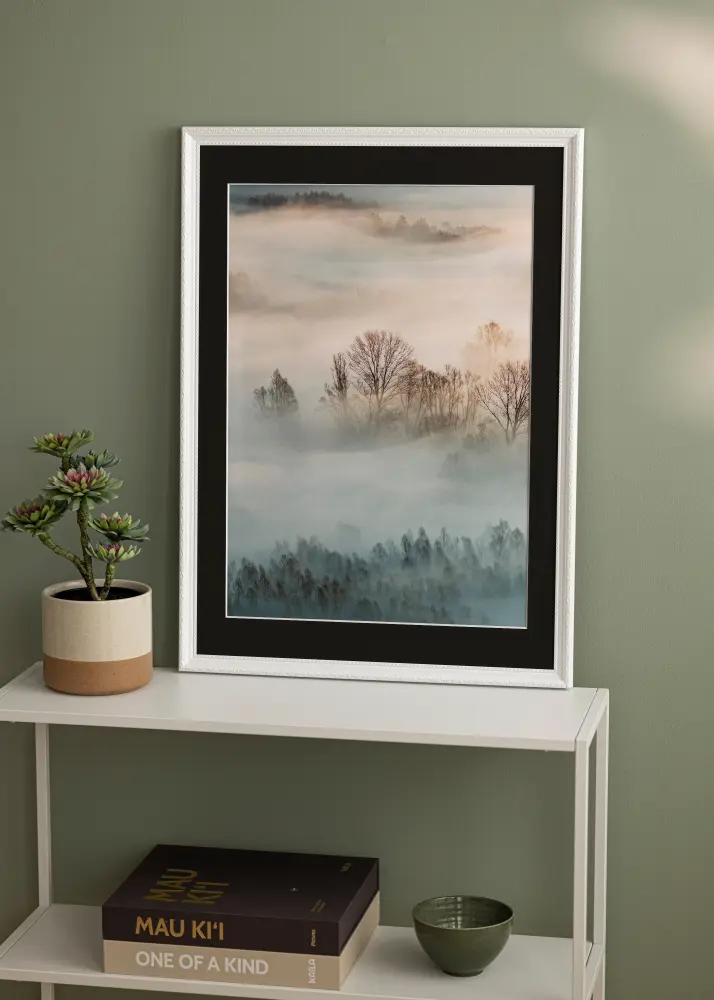 Passepartout korostaa kuvaa ja luo tyylikkään kokonaisuuden samalla kun se suojaa kuvaa olemasta suoraan lasia vasten – lopputuloksena kauniimpi ja kestävämpi kehystys.