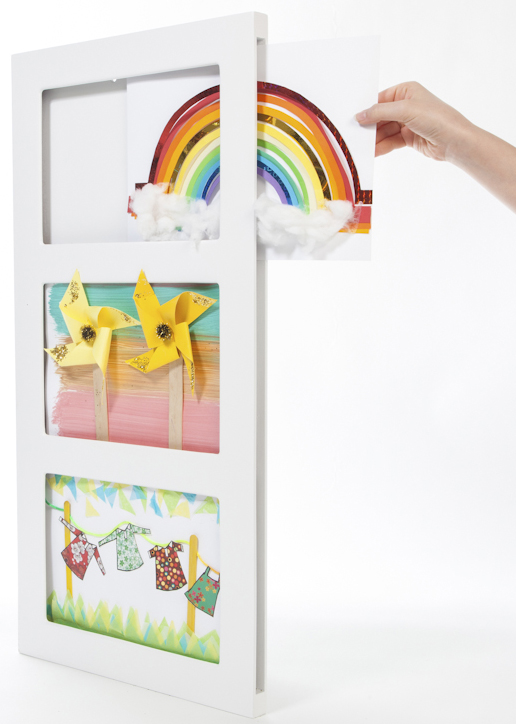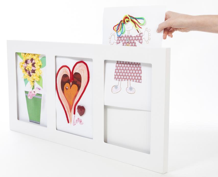 Tyylikäs kehys, joka sopii A4-kokoisiin teoksiin. Anna lapsesi luovuuden virrata ja sommittele upea taidenäyttely kotisi seinälle. Tämä valkoinen puukehys on varustettu kätevillä seinäkiinnityksillä, jotka mahdollistavat sen ripustuksen niin vaaka- kuin pystysuoraan. Kehykseen mahtuu kolme A4-kokoista teosta. Teoksia voi vaihtaa helposti ja näppärästi aina sitä mukaa kun ne syntyvät.