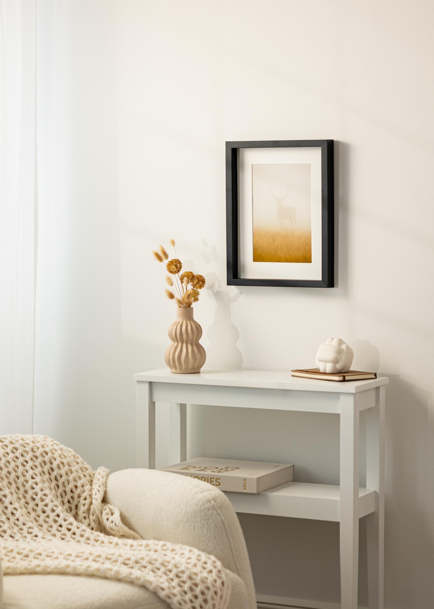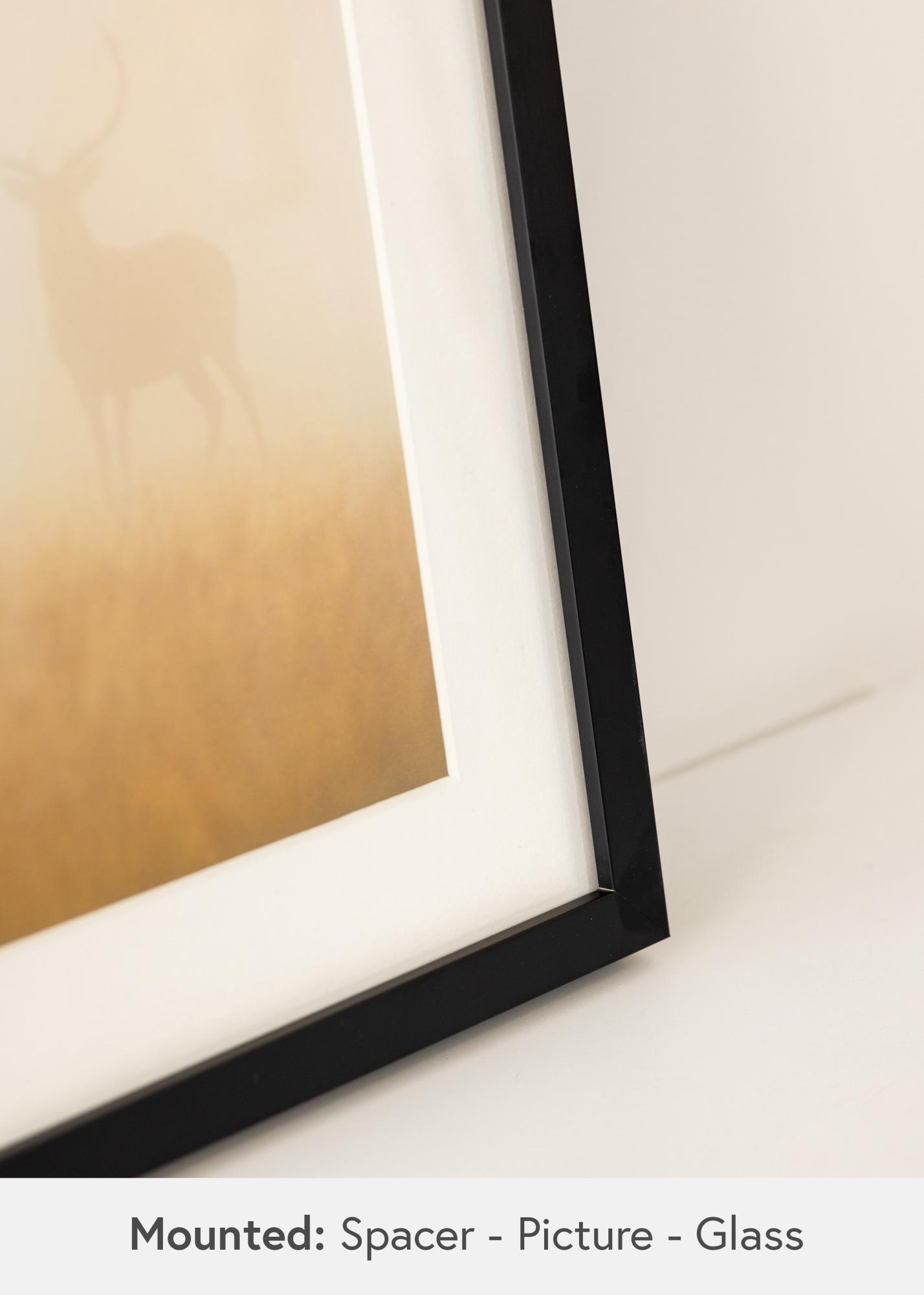 Männystä valmistettu kehys on sekä kestävä että kevyt, mikä tekee siitä helpon käsitellä ja asentaa. Balder Mustan ainutlaatuinen ominaisuus on mukana tuleva etäisyyslista. Tämä lista luo lasin ja kuvan välille tilan, mikä antaa syvyysvaikutelman ja mahdollistaa kuvan sijoittamisen pidemmälle kehykseen tai leijumaan lasin ja taustalevyn väliin. Tämä luo tyylikkään ja eksklusiivisen kehystyksen, joka todella tuo esiin aiheen.